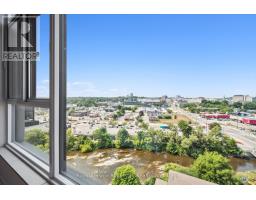 This stunning and spacious 1,295 sq.ft. interior + 80 sq. ft. private balcony, 2-bedroom, 2-bathroom condo facing the Speed River and steps to downtown Guelph- offers an exceptional combination of luxury and convenience. The bright, open-concept layout is thoughtfully designed for accessibility and showcases luxury finishes, including white oak hardwood flooring throughout, 9-foot ceilings, a remote-controlled fireplace in the living room, and a designer kitchen flaunting a waterfall quartz island, quartz countertops,full-height backsplash, LED under-cabinet lighting, soft-close drawers, high-end stainless-steel appliances, and a spacious pantry. An abundance of natural light pours through the large windows- complete with roll-up shades for privacy- while the private balcony offers stunning, unobstructed views of the river. The primary suite boasts a generous walk-in closet and a spa-inspired 5-piece ensuite, complete with a freestanding soaker tub and an oversized glass shower. A second bedroom is thoughtfully positioned on the opposite side of the unit, and is conveniently located near a stylish 3-piece bathroom and the in-suite laundry. This condo also includes a secured underground parking space for your comfort and peace of mind. The well-maintained building offers incredible amenities, including a gym, guest suite, golf simulator, billiards, a lounge with a library, a second lounge bar with terrace, an outdoor dining terrace and BBQ area, indoor visitor parking, secured bike rooms on all parking levels, and a welcoming community where neighbours truly look out for one another. Just steps away from restaurants, cafés, shops, Market Fresh, the Farmer's Market, the VIA Rail/ GO train and bus stations, and within easy access to riverside trails. This condo delivers the ultimate lifestyle in one of Guelph's most desirable locations. (id:46441)