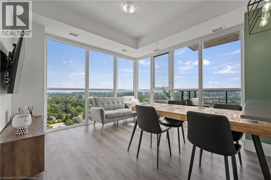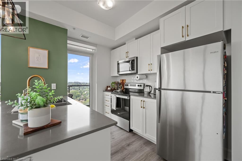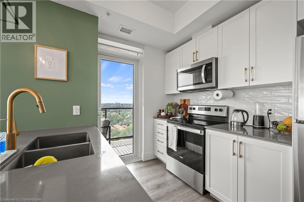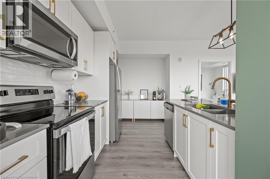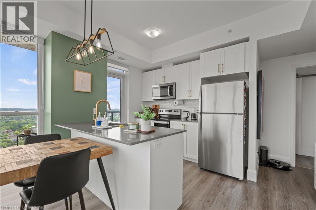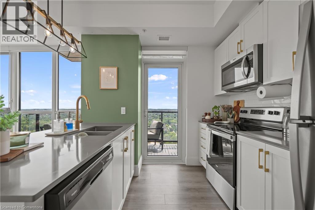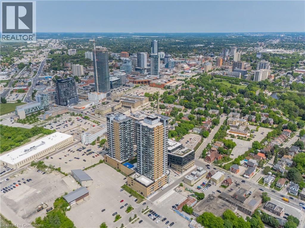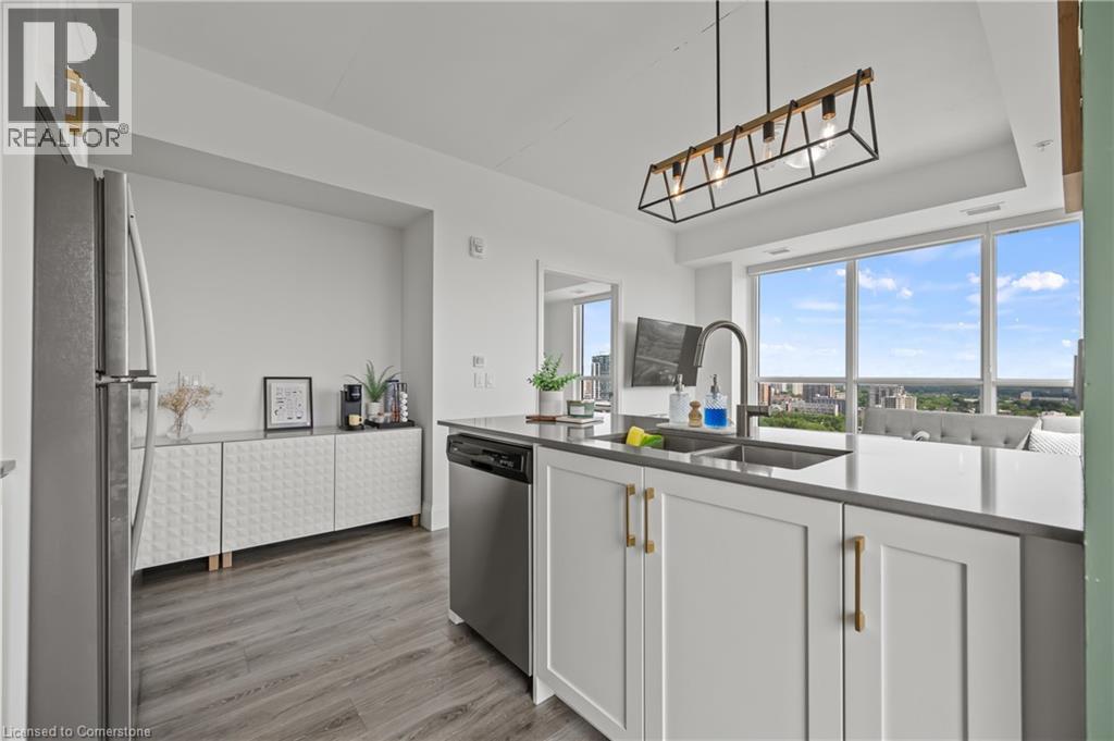 Luxury Corner Unit at Garment Street Condos-Experience elevated urban living in the heart of Kitchener’s Innovation District. This bright, south-facing corner unit offers 2 bedrooms, 2 bathrooms, a locker, and one underground parking space—perfectly blending style and convenience. Floor-to-ceiling windows and an open-concept layout flood the 750 SF space with natural light. The modern kitchen features quartz countertops, a breakfast bar, subway tile backsplash, and premium appliances, flowing seamlessly into the integrated dining area and living room. Step out onto your extra-wide private balcony and take in panoramic city views. The spacious primary suite boasts a walk-in closet and a stylish 3-piece ensuite, while the second bedroom and full 4-piece bath provide flexibility for guests or a home office. Laminate flooring and in-suite laundry add to the move-in-ready appeal. Garment Street Condos offers exceptional amenities: rooftop pool, fitness centre, yoga studio, basketball court, BBQ terrace, co-working spaces, media room, pet run, concierge service—and high-speed internet is included in the condo fees. Situated just steps from top employers like Google’s Canadian HQ, Communitech, Miovision, Vidyard, D2L, and ApplyBoard, and minutes to the University of Waterloo’s Pharmacy School and new School of Medicine, this location is unmatched for professionals and investors alike. Walk to Victoria Park, the LRT Central Station, the GO Train, and downtown Kitchener’s top restaurants, cafes, breweries, and boutiques. Whether you're a professional, investor, or seeking low-maintenance luxury, this is the one. Live where tech, culture, and convenience meet—book your private showing today! (id:46441)
