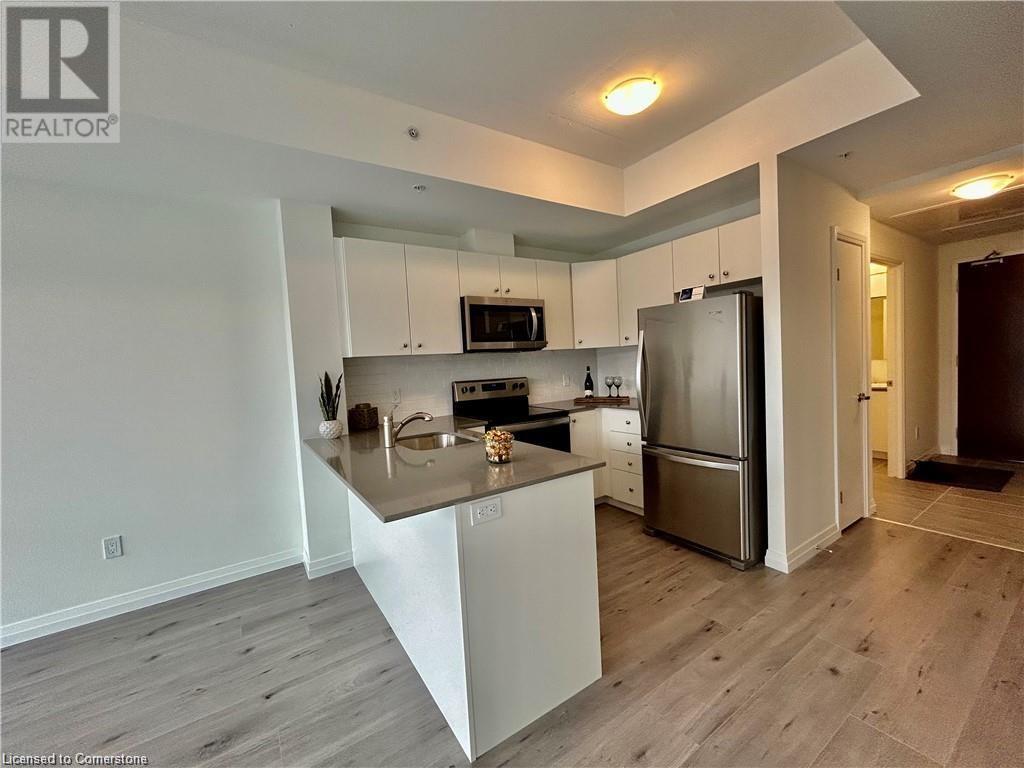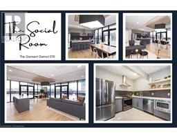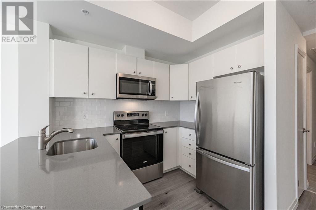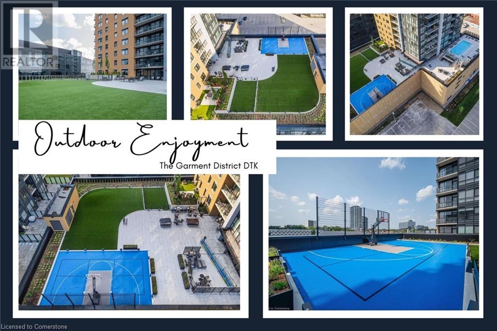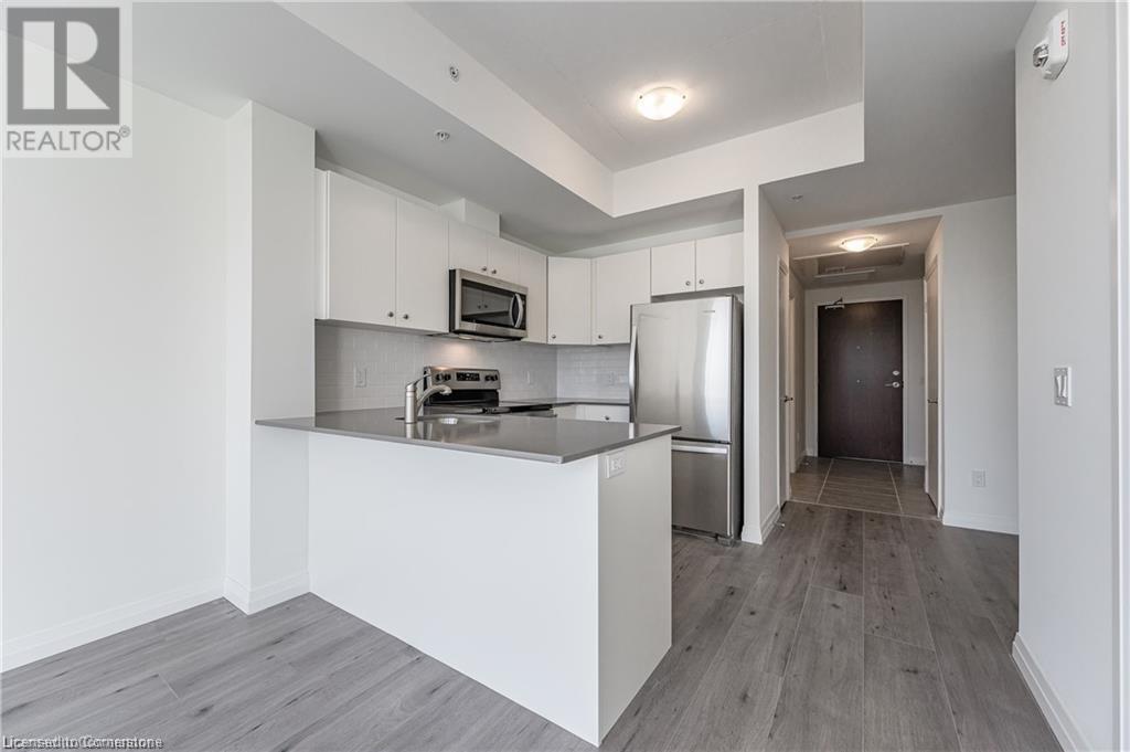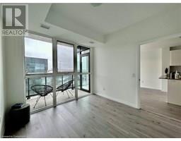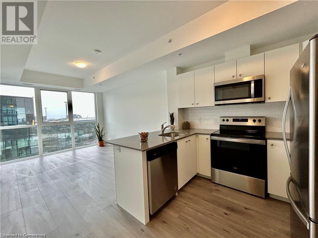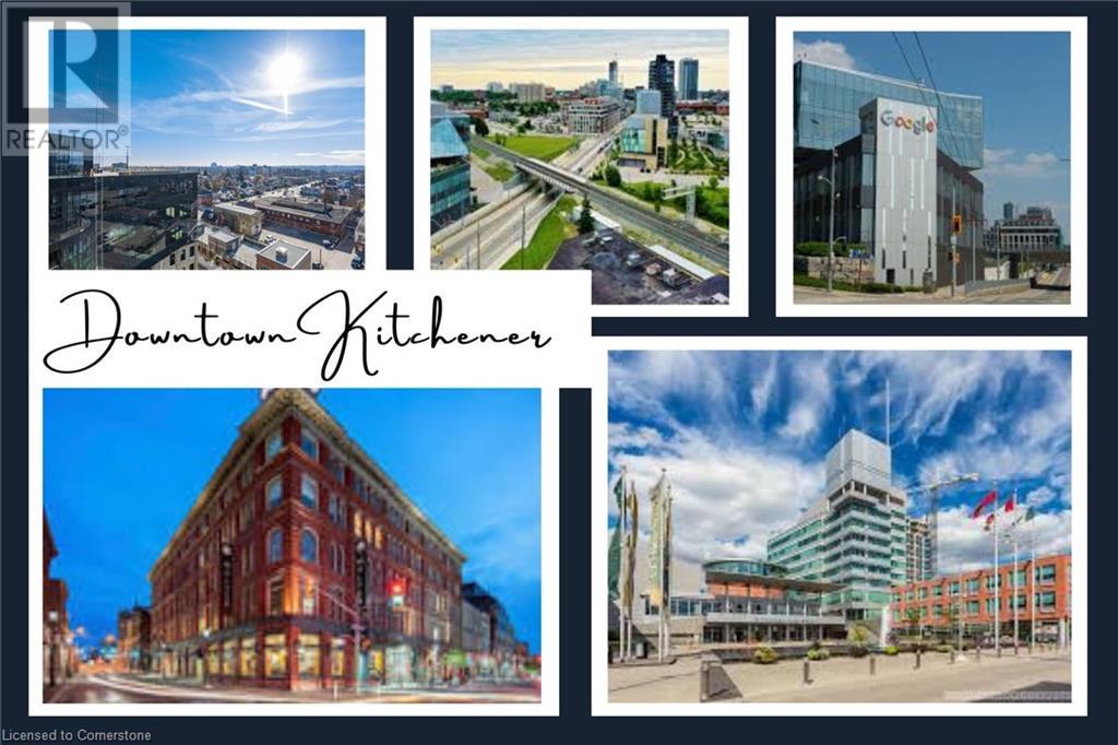 Exceptional 1-Bed + Den Condo with Parking. Tower 3, Garment Street Condos. Discover upscale, low-maintenance living in the heart of Kitchener’s vibrant Innovation District! This stylish condo offers the ideal urban lifestyle, complete with parking, and just steps from Downtown Kitchener’s shops, restaurants, Victoria Park, and the future LRT Hub. Enjoy easy access to the GO Train, ION Light Rail, public transit, and major employers like Google, U of W’s Health Sciences Campus, D2L, Deloitte, The Tannery, and more. With a Walk Score of 72, Transit Score of 63, and Bike Score of 85, this location is perfect for walking and cycling enthusiasts, with trails and Belmont Village nearby. Building Amenities Include: entertainment room with kitchen, fitness centre, theatre, RESORT-STYLE POOL, landscaped rooftop terrace with BBQs, SPORTS COURT, YOGA studio, cozy outdoor space for relaxing, pet run/wash area, secure car & bike parking, and WIRELESS INTERNET throughout. Inside the Unit: Flooded with natural light from floor-to-ceiling windows, the open-concept layout boasts high ceilings, engineered flooring, and a gourmet kitchen with contemporary cabinetry, granite countertops, stainless steel appliances, chic backsplash, and a peninsula perfect for entertaining. The spacious bedroom features a WALL TO WALL CLOSET, complemented by a generous 4-pc wheelchair-accessible bathroom. In-suite laundry adds convenience to this already exceptional unit. This beautifully designed building offers everything you need for modern living in an unbeatable location. Contact your agent today to book a showing! (id:46441)