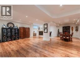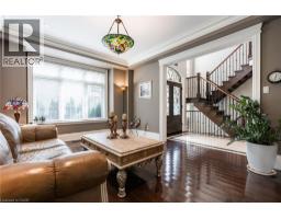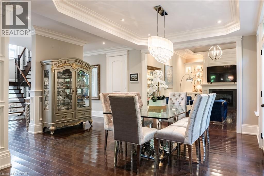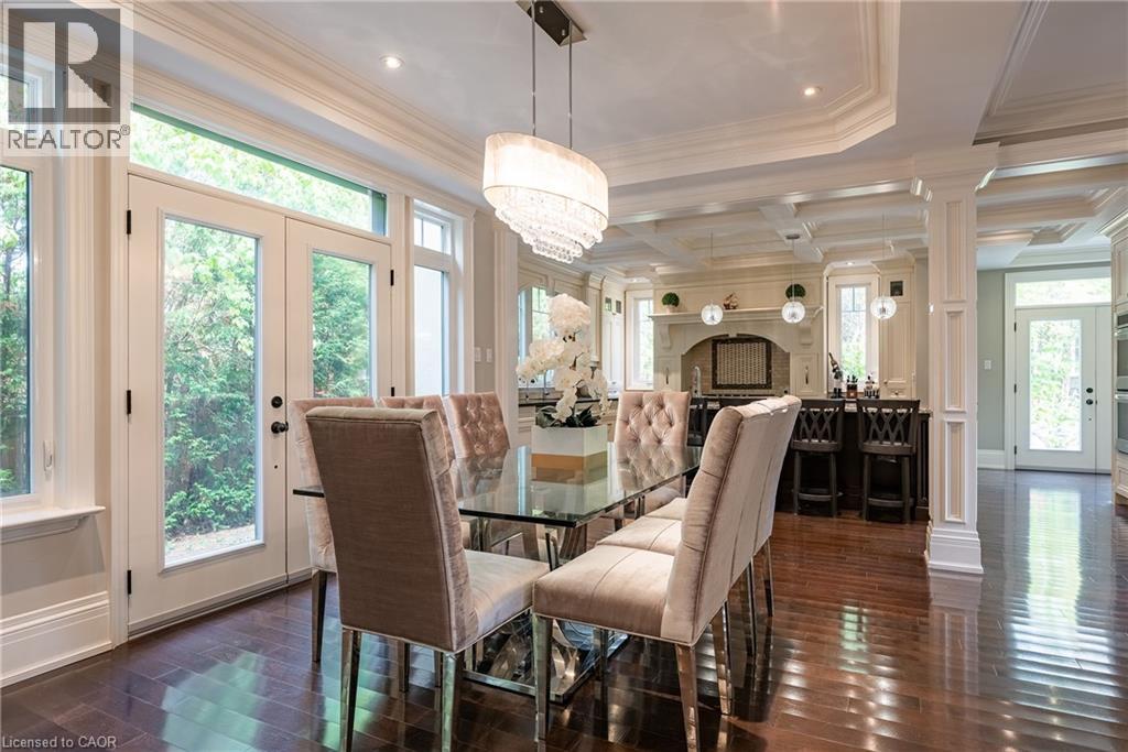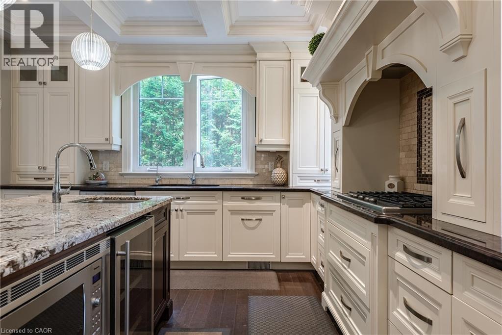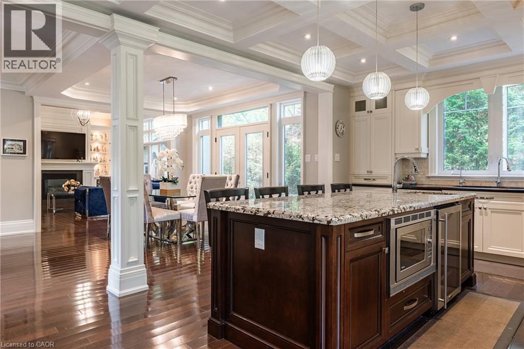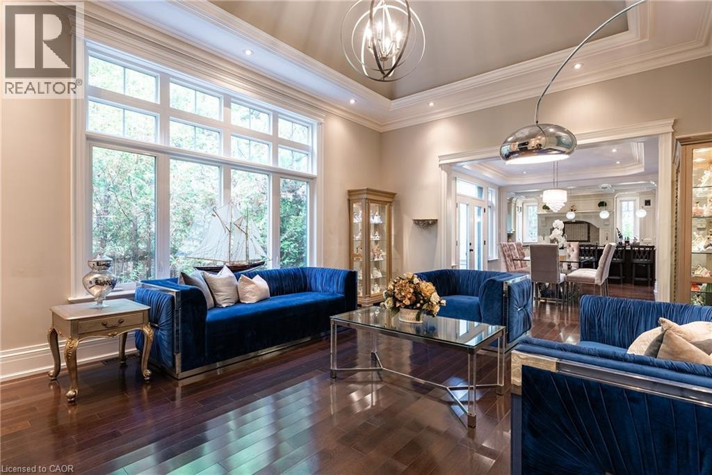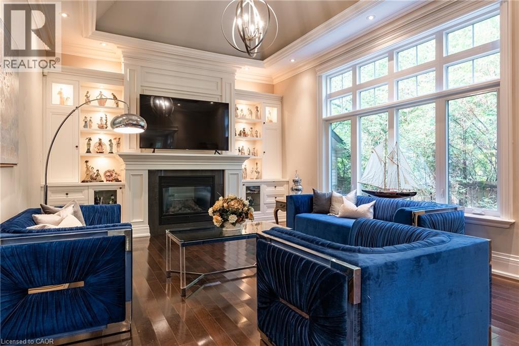 Distinguished custom-built two-storey residence offers over 5,600 square feet of refined living space, including approximately 3,700 square feet above grade and nearly 2,000 square feet in a luxuriously finished lower level nestled within a prestigious Bronte East enclave. Step through the double entry doors into an impressive two-storey foyer crowned by soaring 20-foot ceilings and an open gallery overlook. Expansive transom windows bathe the space in natural light, highlighting the floating hardwood staircase with wrought-iron railings. Main level unfolds with an open-concept layout featuring hardwood floors, vaulted and recessed ceilings, French doors, custom millwork, and oversized picture windows that fill each room with light. Family room serves as a true architectural centerpiece with its 14-foot vaulted ceiling and floor-to-ceiling fireplace, while six additional rooms offer the flexibility to tailor each space to your lifestyle. Chef's kitchen blends form and function with custom cabinetry, premium built-in appliances, and an expansive centre island ideal for both cooking and entertaining. The upper level hosts four spacious bedrooms, including a primary suite overlooking the rear and side gardens. This retreat features a spa-inspired five-piece ensuite complete with a floor-to-ceiling glass shower and whirlpool-style jetted tub. Two of the secondary bedrooms boast graceful, vaulted ceilings, adding a sense of airiness and architectural character. Mature trees and lush greenery envelop the property, creating serene views from every window. Professionally finished lower level extends the home's luxurious living space, offering a recreation room, theatre room or fifth bedroom, home office, above-grade windows, and a three-piece bath. Outside, the manicured backyard oasis features a gazebo and flower garden, providing a tranquil setting for relaxation or entertaining. A true beauty that you can not miss. Main level laundry room, plus upper level laundry room. (id:46441)