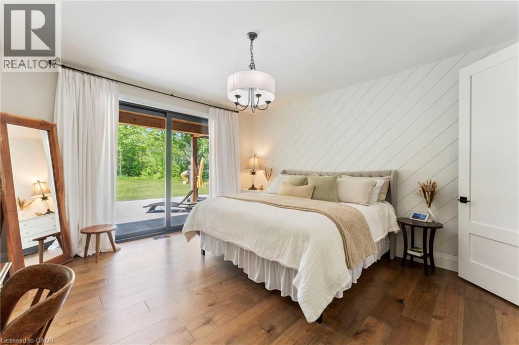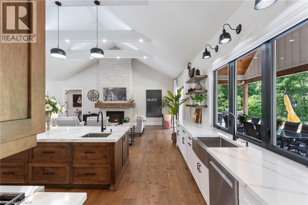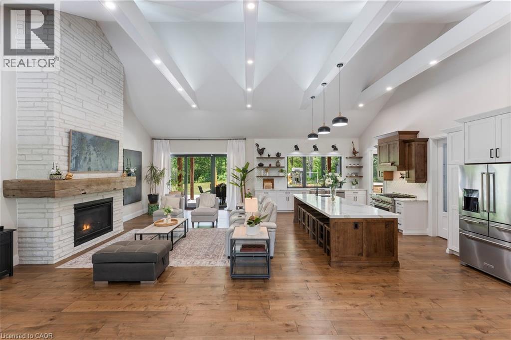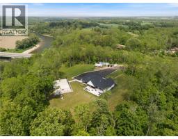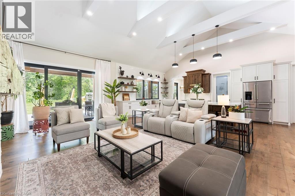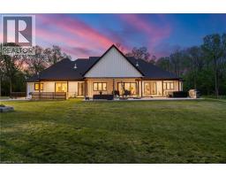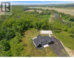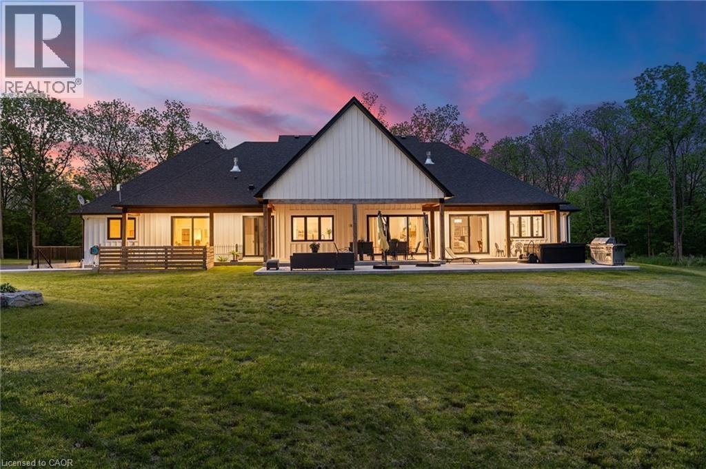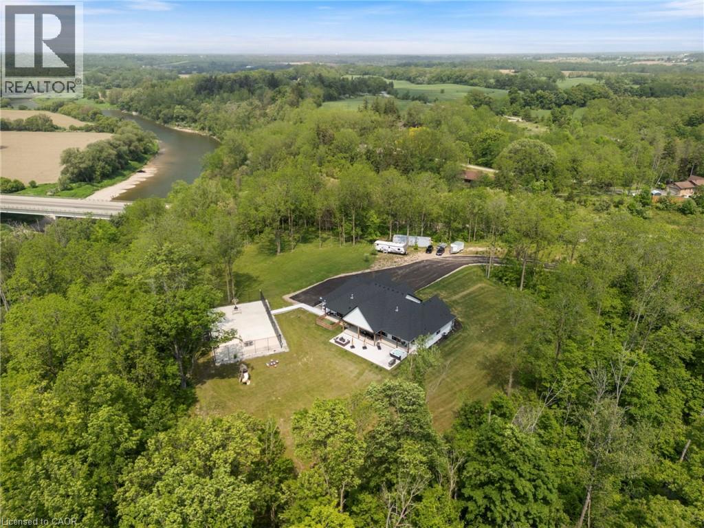 Your dream countryside retreat awaits. Minutes from everyday conveniences, this custom-built modern farmhouse bungalow offers a rare blend of luxury comfort and natural beauty. Set on nearly 6 private acres with breathtaking panoramic views of the Grand River and direct access to the Grand Valley Trail System, this exceptional 2023 built home is thoughtfully designed for multi-generational living, income potential and elevated everyday living. With over 6,000 sqft of beautifully finished space the home features 7 bedrooms 6.5 bathrooms 3 kitchens and 3 laundry areas, ideal for large or blended families. The main level offers two distinct living quarters with 4 bedrooms, 4.5 baths, 2 kitchens, and 2 laundry areas, providing exceptional flexibility for both entertaining and comfortable daily living. The impressive Great Room showcases soaring 16’ vaulted ceilings, while 10’ ceilings in the dining area and 9’ ceilings in the bedrooms create a bright, airy atmosphere throughout. The chef-inspired kitchen anchors the home with a dramatic 10’island, walk-in pantry, and custom cabinetry, perfect for hosting and gathering. Each principal bedroom includes a walk-in closet and private ensuite. The primary retreat offers spa-inspired finishes, serene countryside views, and direct access to the expansive deck. A fully self-contained in-law suite on the main floor includes its own kitchen, living room, bedroom, and 4-piece bath, ideal for extended family or guests. The lower level features a separate entrance to a bright 1-bedroom plus den suite with its own kitchen, bathroom and laundry, along with additional bedrooms a spacious recreation area with wet bar and ample storage. A private 490’ driveway leads to this exceptional property, complete with a tiered covered porch with Douglas Fir beams, fully fenced LED lit sports court, and a heated 3 car garage. A rare offering combining privacy, versatility, and refined country living! Just minutes to shops, schools, and amenities. (id:46441)