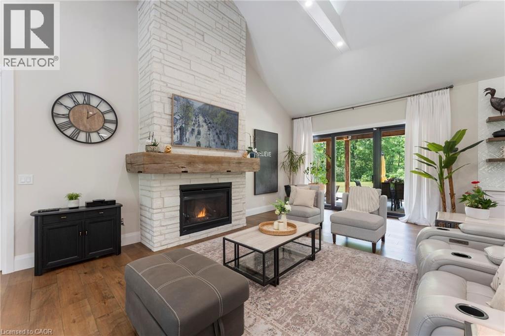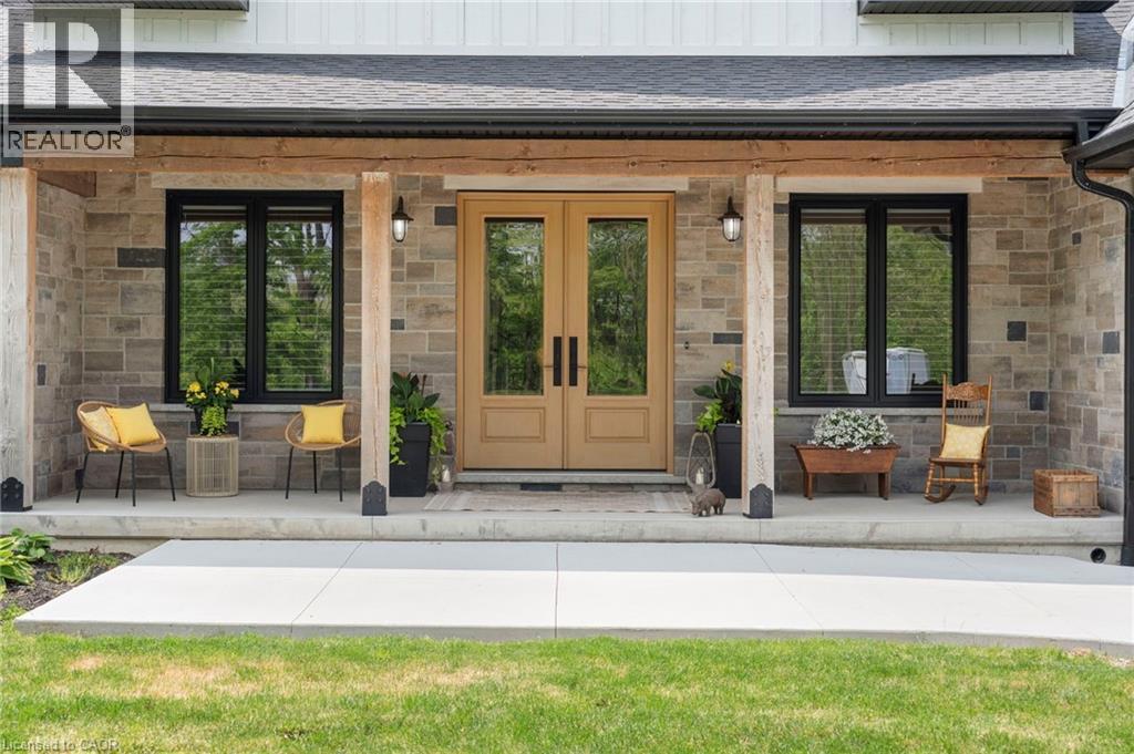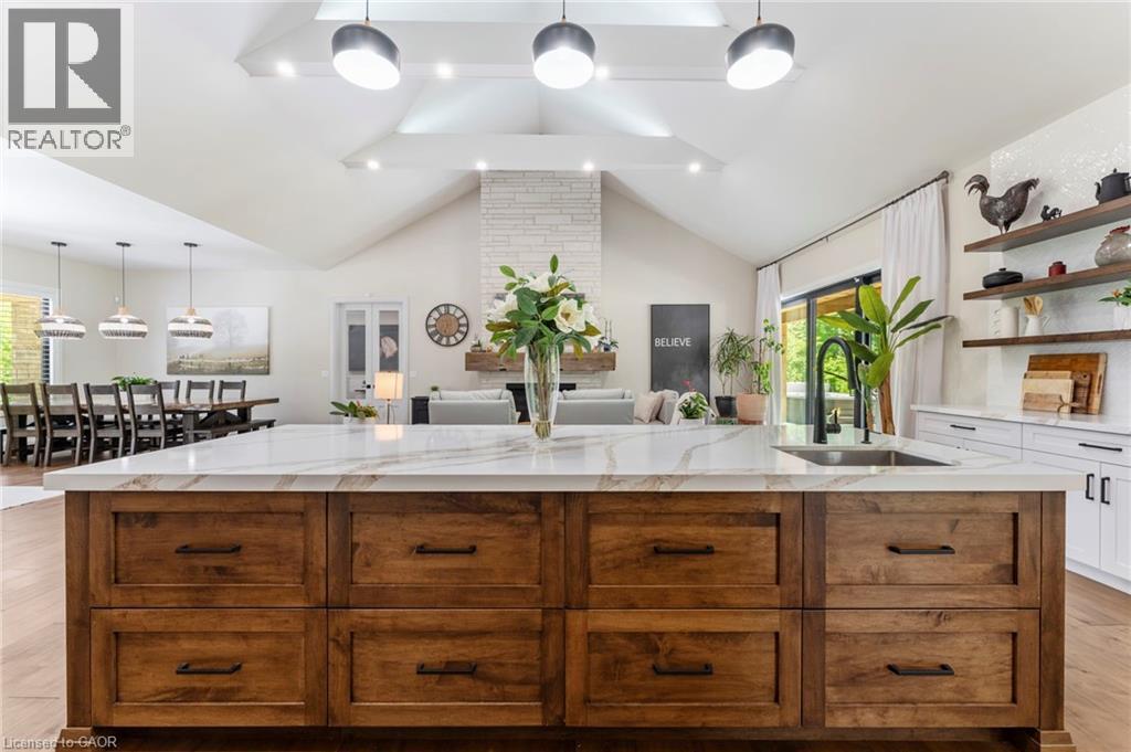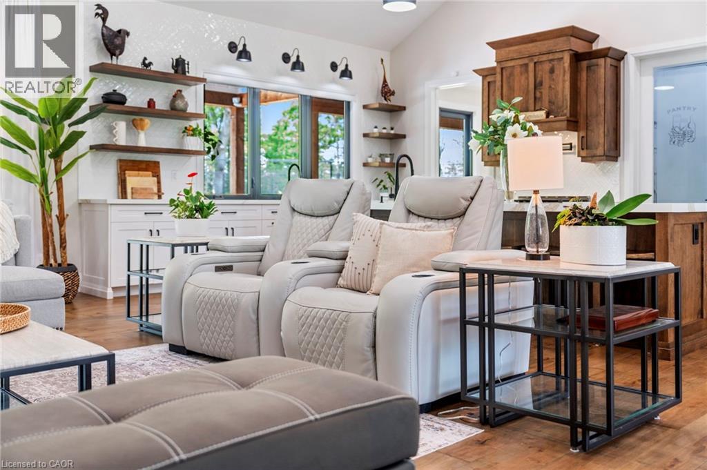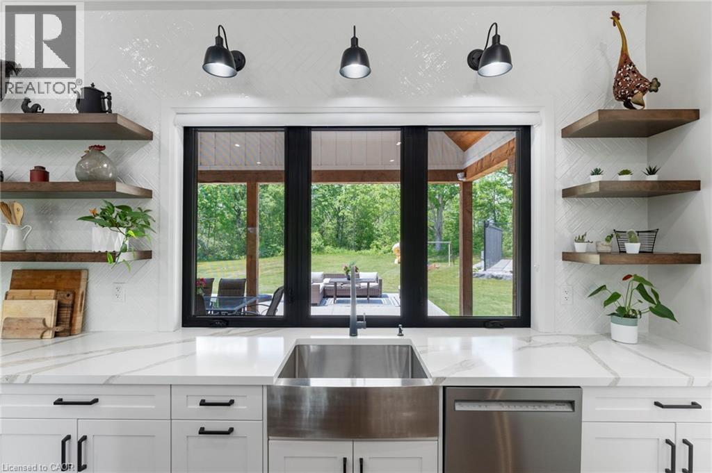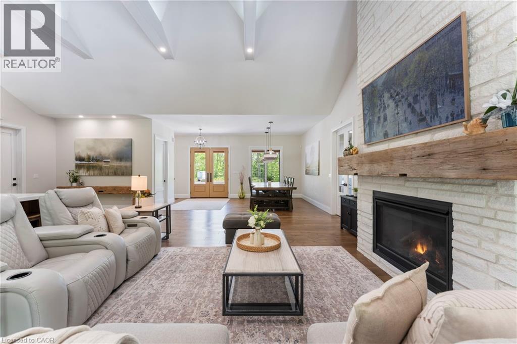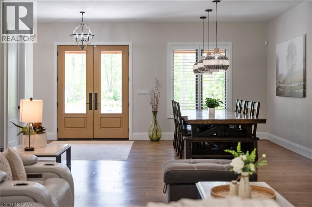 Your dream countryside retreat awaits. Minutes from everyday conveniences, this custom-built modern farmhouse bungalow offers a rare blend of luxury comfort and natural beauty. Set on nearly 6 private acres with breathtaking panoramic views of the Grand River and direct access to the Grand Valley Trail System, this exceptional 2023 built home is thoughtfully designed for multi-generational living, income potential and elevated everyday living. With over 6,000 sqft of beautifully finished space the home features 7 bedrooms 6.5 bathrooms 3 kitchens and 3 laundry areas, ideal for large or blended families. The main level offers two distinct living quarters with 4 bedrooms, 4.5 baths, 2 kitchens, and 2 laundry areas, providing exceptional flexibility for both entertaining and comfortable daily living. The impressive Great Room showcases soaring 16’ vaulted ceilings, while 10’ ceilings in the dining area and 9’ ceilings in the bedrooms create a bright, airy atmosphere throughout. The chef-inspired kitchen anchors the home with a dramatic 10’island, walk-in pantry, and custom cabinetry, perfect for hosting and gathering. Each principal bedroom includes a walk-in closet and private ensuite. The primary retreat offers spa-inspired finishes, serene countryside views, and direct access to the expansive deck. A fully self-contained in-law suite on the main floor includes its own kitchen, living room, bedroom, and 4-piece bath, ideal for extended family or guests. The lower level features a separate entrance to a bright 1-bedroom plus den suite with its own kitchen, bathroom and laundry, along with additional bedrooms a spacious recreation area with wet bar and ample storage. A private 490’ driveway leads to this exceptional property, complete with a tiered covered porch with Douglas Fir beams, fully fenced LED lit sports court, and a heated 3 car garage. A rare offering combining privacy, versatility, and refined country living! Just minutes to shops, schools, and amenities. (id:46441)
