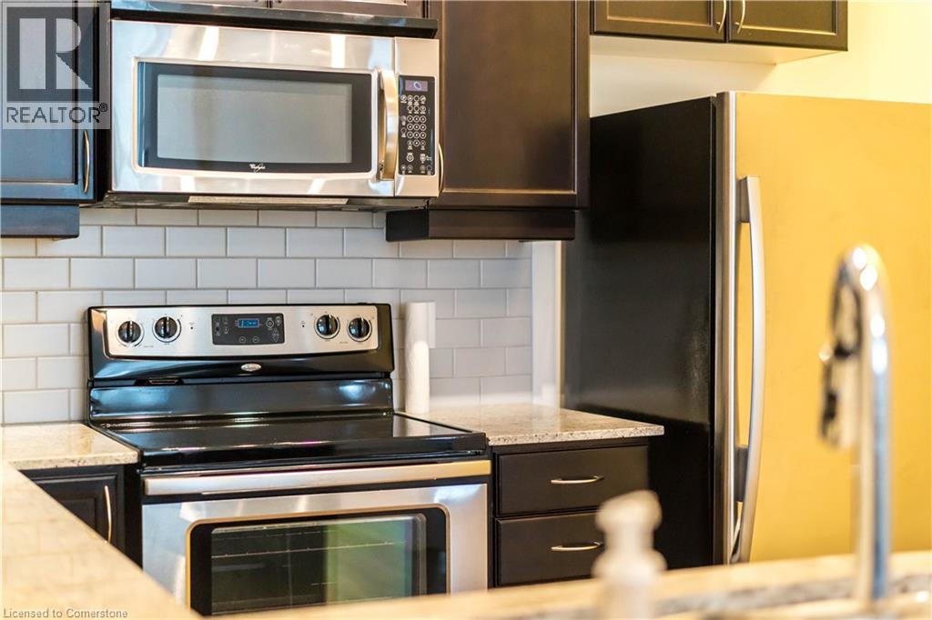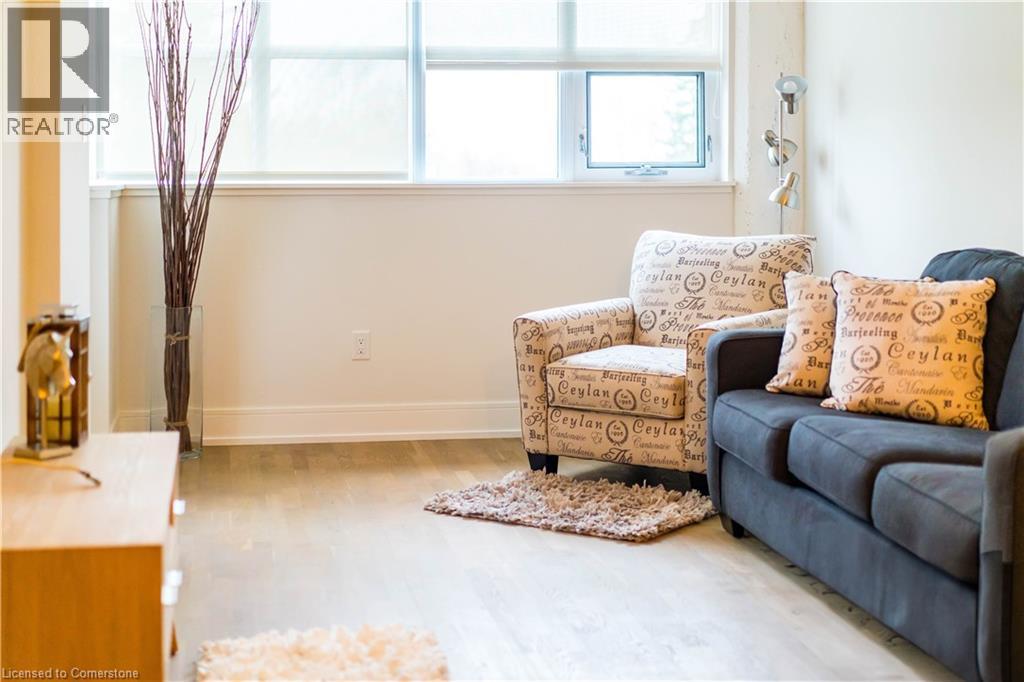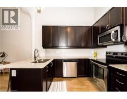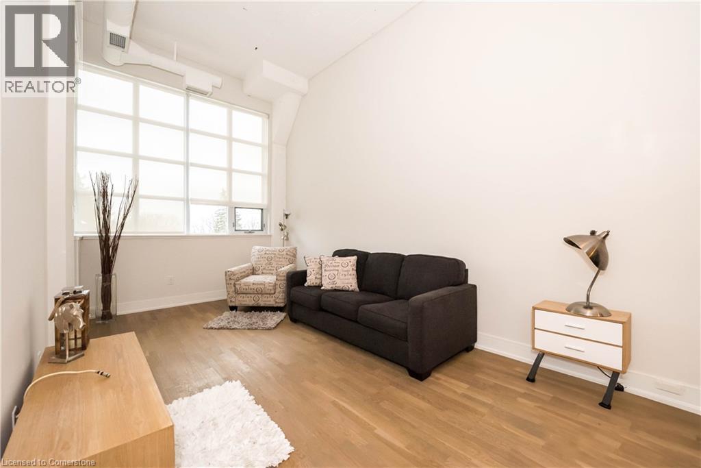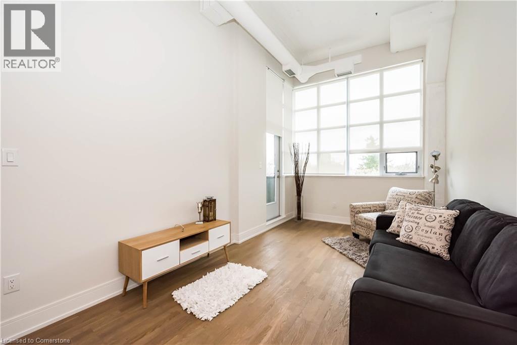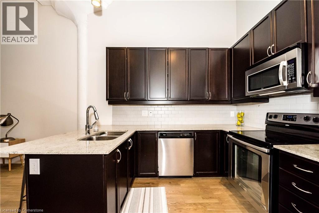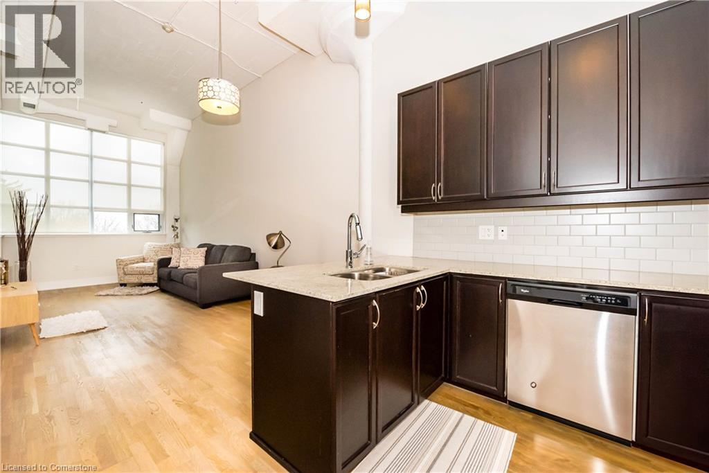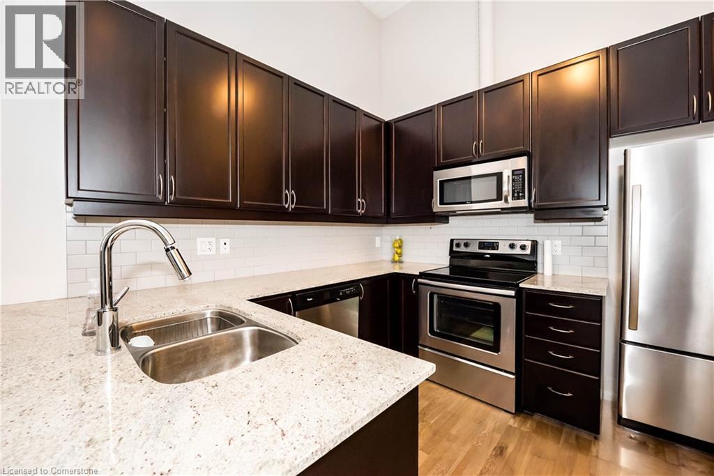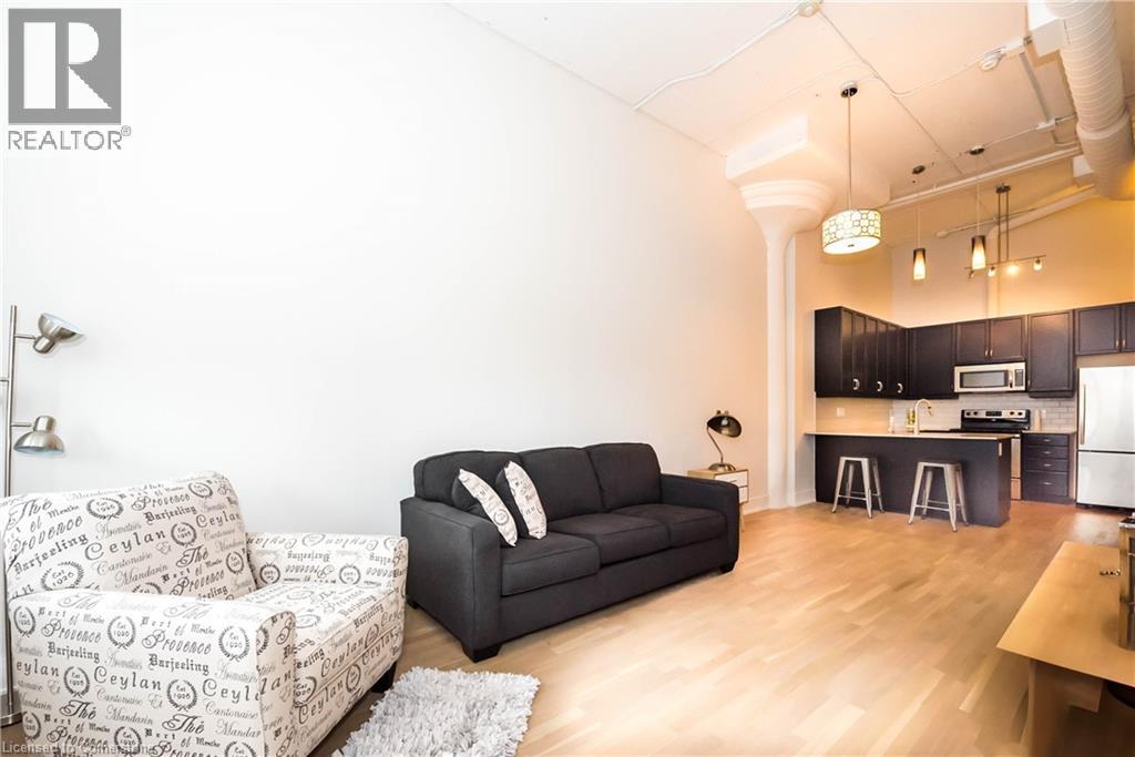 Live the Condo Lifestyle at Arrow Lofts. This very spacious 1 bedroom condo on the 4th floor features soaring ceiling heights, huge windows for massive amount of natural light. Kitchen equipped with stainless steel appliances, quartz counter tops and lots of cupboard spaces. Also hardwood flooring throughout main living space and 1 parking spot included. Large bedroom with cozy carpet flooring and a deep walking closet. A semi-enclosed balcony is just right off the living room, amazing for summer nights looking at the stars! In-suite Laundry is also included! Arrow Lofts offers the Best Amenities in KW! Conference room, Library, Theatre, Fully equipped gym, Lounge room, Roof top BBQ are some of the amazing amenities offered here that you will not find in other condos in KW. Arrow Lofts is also in the heart of the city and just steps to Downtown and a wide variety of daily amenities such as restaurants, shopping, parks and schools. (id:46441)