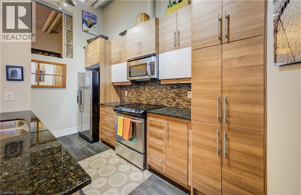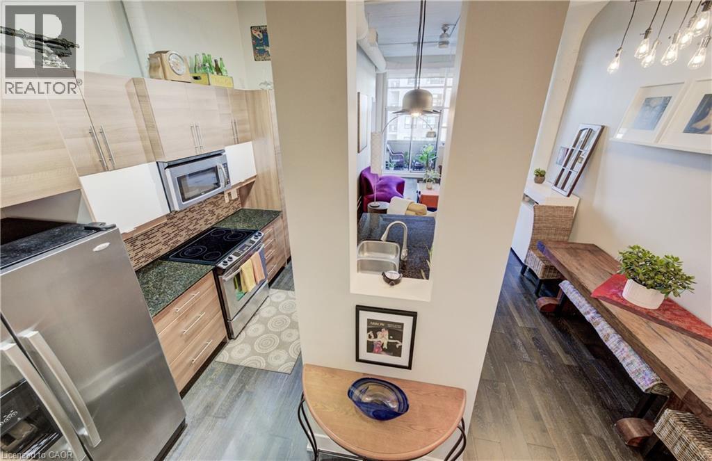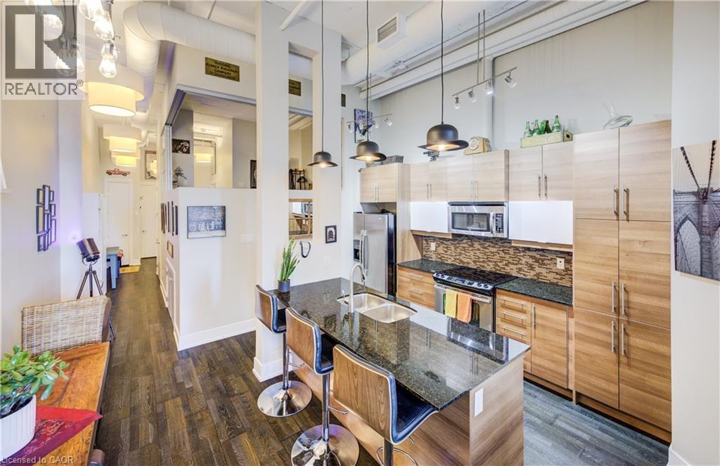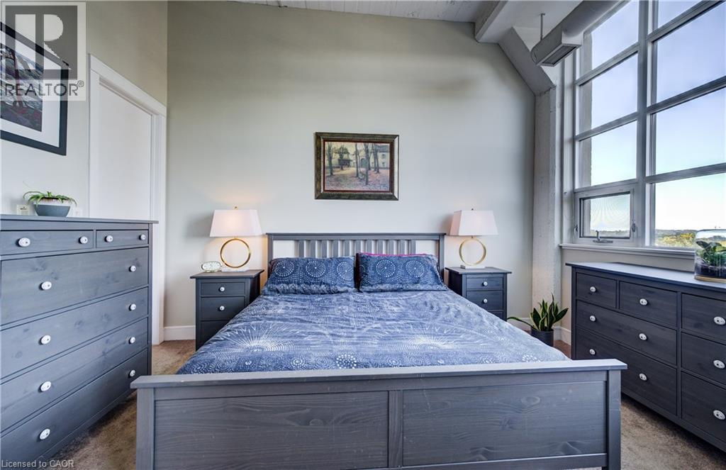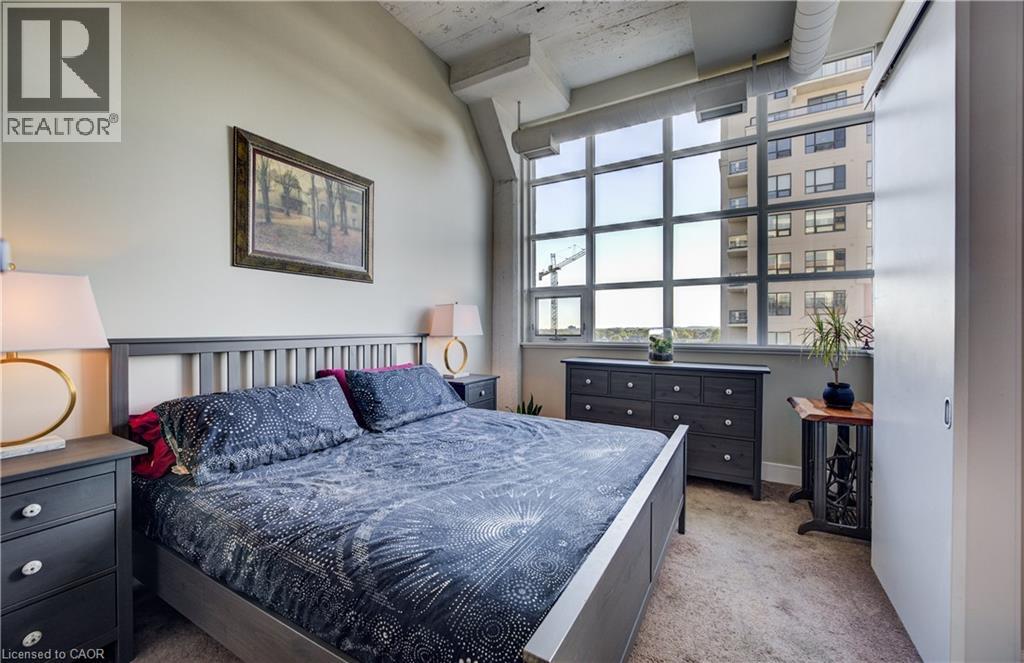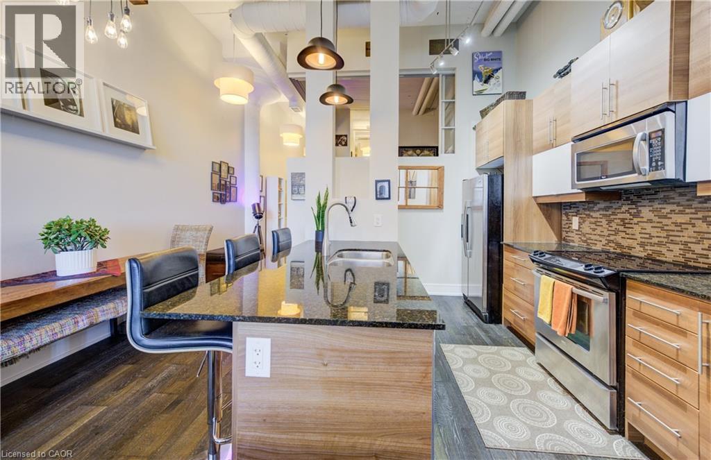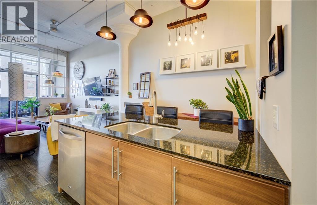 Welcome to The Arrow Lofts – where historic charm meets contemporary design in one of Kitchener’s most iconic buildings. This spacious 2 bedroom, 2 bathroom condo offers over 1147 sq ft of thoughtfully designed living space, perfect for professionals, couples, or those looking to downsize without compromise. This beautiful suite also includes 1 under ground parking spot and is one of the few suites with an extra storage locker as well as a huge storage space inside the suite. Soaring 12 ft ceilings, exposed ductwork, and expansive windows create a bright, open-concept layout that blends industrial character with modern finishes. The stylish kitchen features granite countertops, stainless steel appliances, a large island, and plenty of storage — ideal for cooking and entertaining. The primary bedroom includes a luxurious ensuite with a glass-enclosed shower, whirlpool jet tub and quartz top vanity, while the second bedroom/den is perfect for guests, a home office, or growing families. Additional features include in-suite laundry, upgraded flooring, and ample closet space throughout. Enjoy access to premium building amenities including a rooftop patio with BBQs, fitness centre, sauna, media room, meeting spaces and under ground parking— all just steps from Kitchener’s tech hub, Victoria Park, the LRT, and countless cafes, restaurants, and shops. Condo fees include heat, A/C, water, and more — offering convenience and peace of mind. Book your showing today before you miss out on this beautiful property! (id:46441)