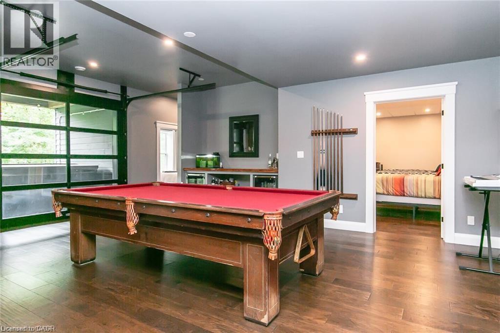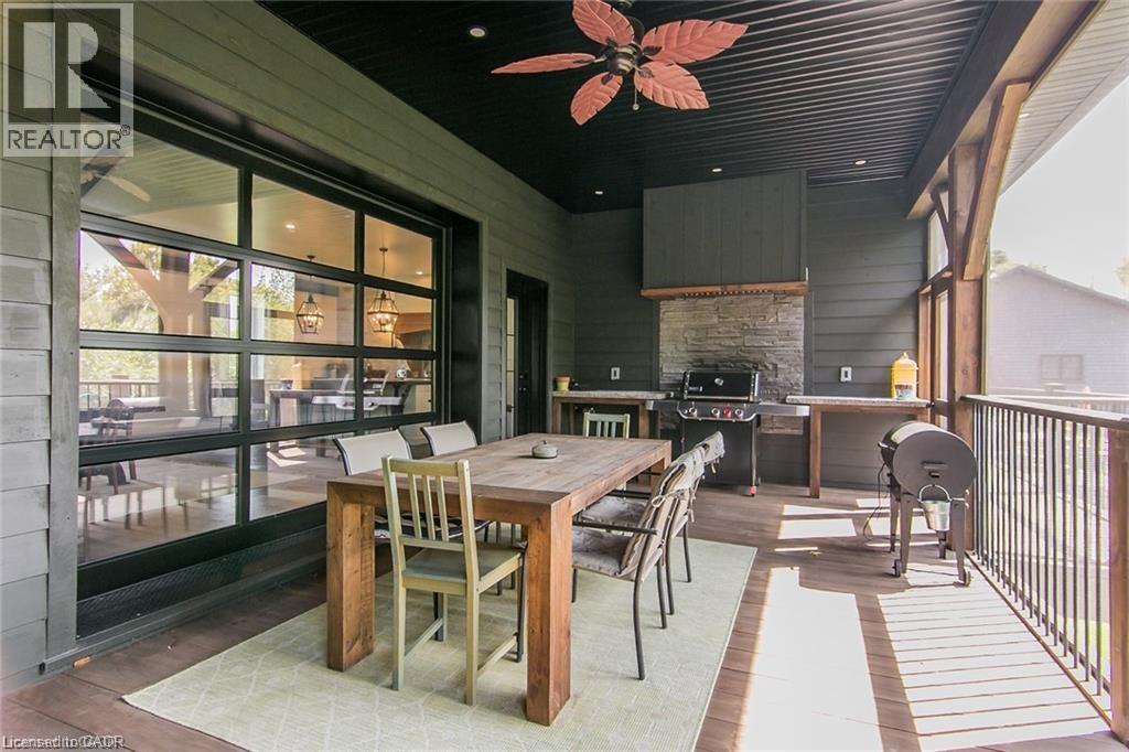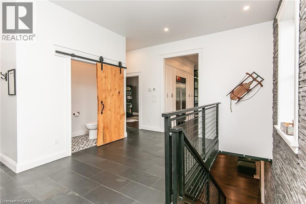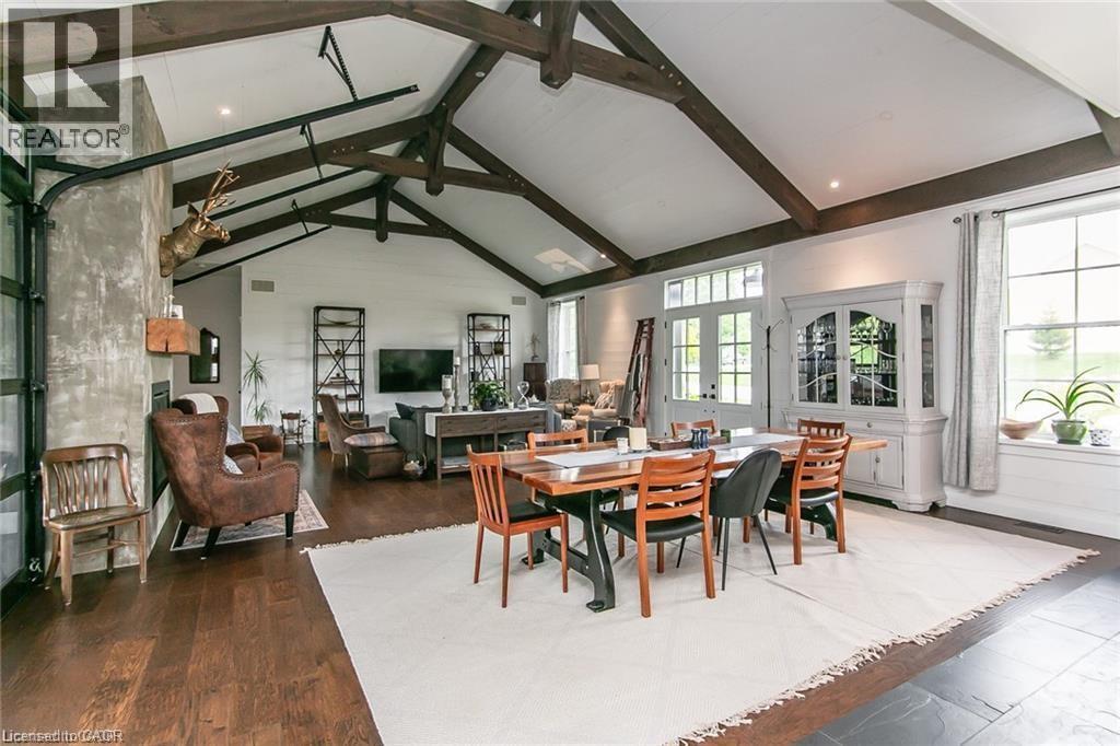 Spectacular Custom-Built Bungalow with Walk-out Basement, Triple Car Garage & Detached 2-Storey Garage & Shop on Two Acres-just 35-45 min from Waterloo! Nestled in an exclusive enclave of executive homes in Moorefield, this property offers a peaceful country setting with easy city access. Built like no other, it showcases structurally superior ICF (insulated concrete form) construction & a lifetime metal roof-the same quality extends to the det garage. Inside, the open-concept layout features exposed timber-frame details, soaring vaulted ceilings & 2 glass garage doors that open onto a 3-season porch. The kitchen, dining & living area impress w/ a stone f/p, concrete counters, oversized island & fantastic walk-in pantry w/ floor-to-ceiling storage. At its heart: an 8-burner Wolf gas stove, double ovens & upgraded range hood-over $40,000 in luxury appliances! Entertain year-round w/ the screened porch, complete w/ outdoor kitchen, brick hearth & fume hood for your bbq. The main floor also boasts a stunning primary suite w/ walk-in closet, spacious dressing rm & spa-inspired ensuite. A 2nd bedroom, currently an office, offers lovely treed views. A stylish mudroom, laundry rm & powder rm w/ live-edge barn door complete the main level. The fin w/o basement features heated floors, 2 bedrooms, 4-pc bath & expansive rec spaces-perfect for family gatherings or games night. 2 more w/o garage doors lead to the backyard & patio. For hobbyists, the 3-car gar is wired for an EV, while the sep insulated 2 storey workshop w/ electrical & wood stove provides endless options for projects, vehicles or gym. The nearly 2-acre property incl a pool-sized lot, new tiered deck, firepit area, treehouse & almost an acre of forest w/ a creek running through it. Your own private retreat! (id:46441)