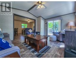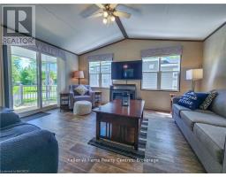 Escape to Fisherman's Cove Seasonal Resort, where relaxation and adventure go hand in hand. This 2022 seasonal home is the perfect retreat for nature lovers and families looking to make lasting memories. Set in a peaceful lakeside community, it offers the ideal mix of comfort and outdoor excitement. Inside, you'll find a bright and spacious living area with vaulted ceilings and expansive windows that let in plenty of natural light while showcasing beautiful views of the surrounding wilderness. The open layout seamlessly connects the living space to the kitchen, creating a warm and welcoming atmosphere. With modern furnishings, a sleek ceiling fan, and a cozy electric fireplace, this is the perfect place to unwind after a day of fun. The kitchen is designed for both style and functionality, featuring stainless steel appliances, dark countertops, and crisp white cabinetry. Whether you're making a quick breakfast or cooking a gourmet meal, this space is fully equipped to meet your needs. Step outside and immerse yourself in everything the resort has to offer. Enjoy your morning coffee or evening drink on the private deck while taking in the serene landscape. Take a refreshing dip in the pool, let the kids explore the playgrounds, or head to the floating water park for some excitement. Love the water? Spend your days fishing, boating, or just soaking up the lakeside views. As the sun sets, gather around a crackling fire and enjoy the peaceful night sky. Located in the heart of Fisherman's Cove, this home gives you access to a variety of amenities, including a marina and recreational facilities. Plus, with site fees covered until 2027, you can enjoy hassle-free seasonal living for years to come. Don't miss out on this incredible opportunity to have your own slice of lakeside paradise! (id:46441)