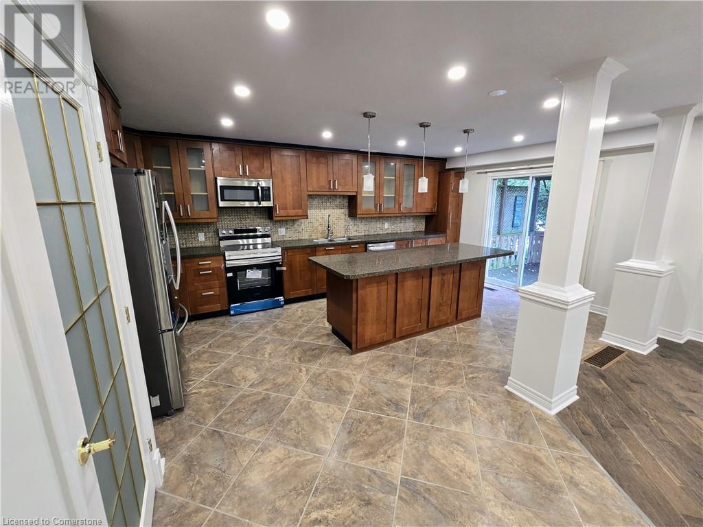 This spectacular 2-in-1 home is a rare lease opportunity offering incredible space, flexibility, and value—ideal for large or multigenerational families who want their own space under one roof. Featuring two fully equipped kitchens with brand-new stainless steel appliances, the home includes a beautifully renovated main kitchen with an oversized island, pot lights, and a formal dining area perfect for family gatherings. The upper level offers 3 spacious bedrooms, including a massive primary suite with a 5-piece ensuite, walk-in closet, and walk-out to a private covered balcony, plus the convenience of top-floor laundry. The fully finished basement has its own private entrance from the garage and offers a 1-bedroom suite with its own kitchen, bathroom, and family room. This carpet-free home features two gas fireplaces, crown moulding, fresh paint, and plenty of natural light. Enjoy a fully fenced backyard with no rear neighbours and a large deck ideal for outdoor entertaining. Located in a quiet, family-friendly neighbourhood close to parks, schools, transit, and shopping. Lease includes the entire home, driveway, and garage (parking for 5). (id:46441)