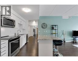 Welcome to this modern, sun-filled condo offering a stylish open-concept living and kitchen design with expansive windows that flood the space with natural light. This newer building features upgraded finishes throughout, including engineered hardwood flooring, quartz countertops, stainless steel appliances, and a built-in microwave for a sleek, contemporary feel. The spacious primary bedroom includes a large closet and a private en-suite bathroom, providing both comfort and functionality. A Juliette balcony adds charm and allows fresh air and natural light to flow throughout the unit. The second bedroom can be used as a bedroom or an office. The condo includes one parking space and access to excellent building amenities, including a fully equipped fitness centre and a party/meeting room, ideal for entertaining or working from home. Ideally located close to major highways, GoodLife Fitness, Sobeys, restaurants, shopping, parks, and everyday conveniences—this is an exceptional opportunity for a professional tenant seeking comfort, convenience, and a modern lifestyle. Some furniture can be left if desired by the tenant.- This unit is BARRIER-FREE COMPLIANT (id:46441)