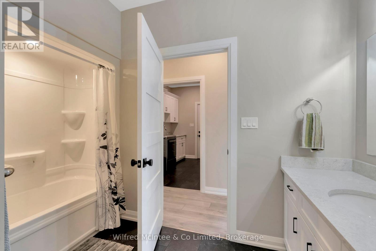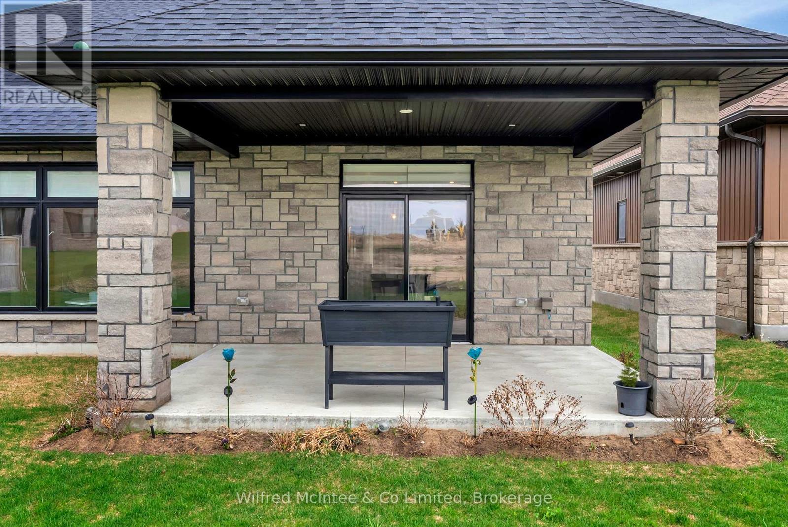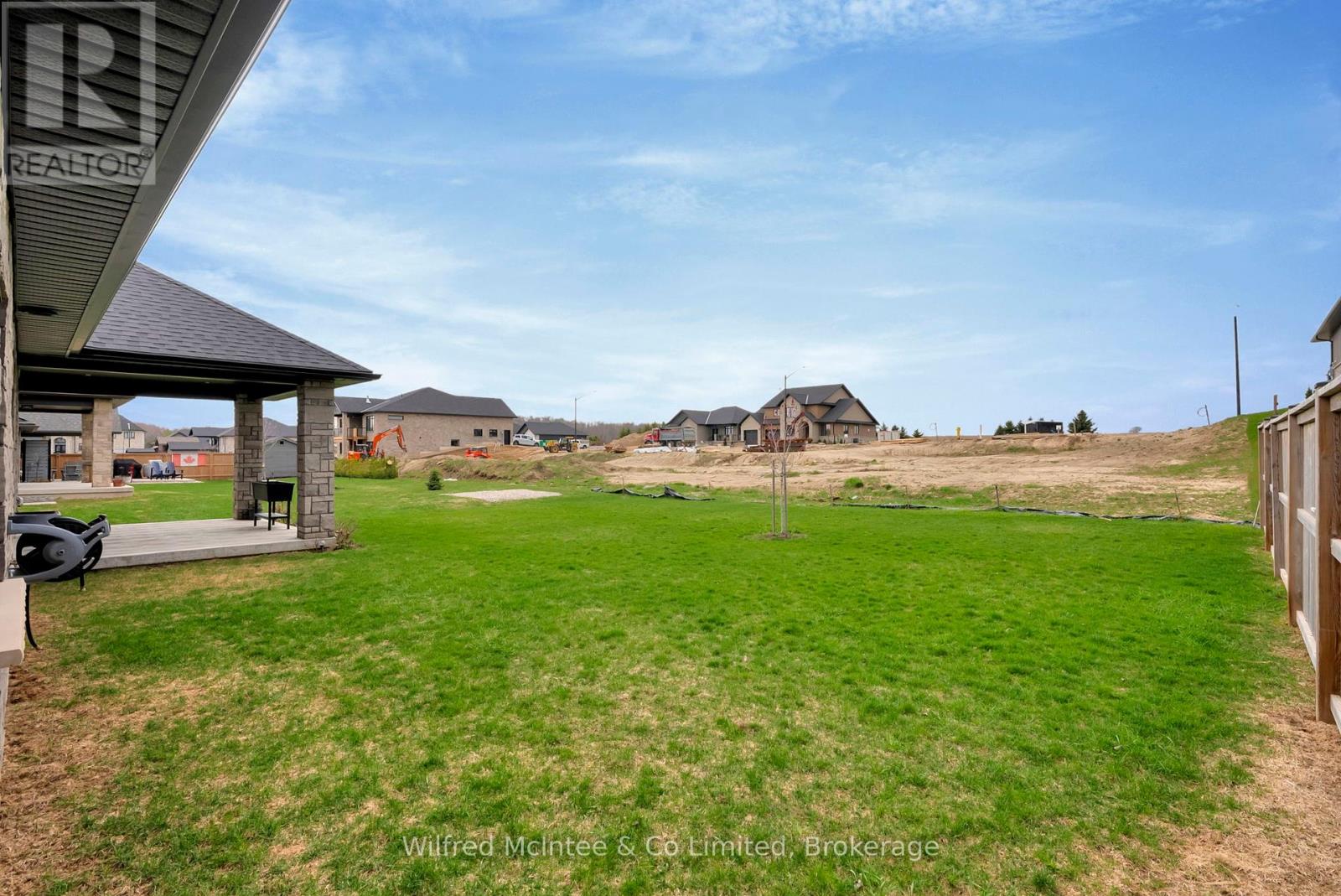 Welcome to this stunning 1800 sq. ft. slab-on-grade bungalow located in the sought-after Walker West Estates in Walkerton. Built in 2021, this modern home offers luxurious one-level living with an emphasis on comfort, accessibility, and contemporary design. Step inside to soaring 9 ft ceilings and an open-concept layout that seamlessly connects the white kitchen complete with quartz countertops, a central island with breakfast bar to the bright dining and spacious living area.  The home features three generously sized bedrooms, including a spacious primary suite with a walk-in closet and sleek 3-piece ensuite. The two additional bedrooms share a stylish 4-piece bath, ideal for family or guests. Enjoy year-round comfort with dual heating systems: in-floor radiant heat throughout the home and garage, plus gas forced air with central A/C. The oversized double car garage lined in easy care Trusscore offers ample space with bonus of storage in the attic. Relax on the covered front porch or entertain in the private, covered, rear 12' x 16' patio ideal for enjoying the outdoors, rain or shine. If you're looking for move-in ready, modern, and low-maintenance living in one of Walkerton's most desirable neighborhoods, this home is a must see! (id:46441)