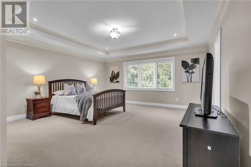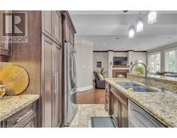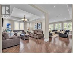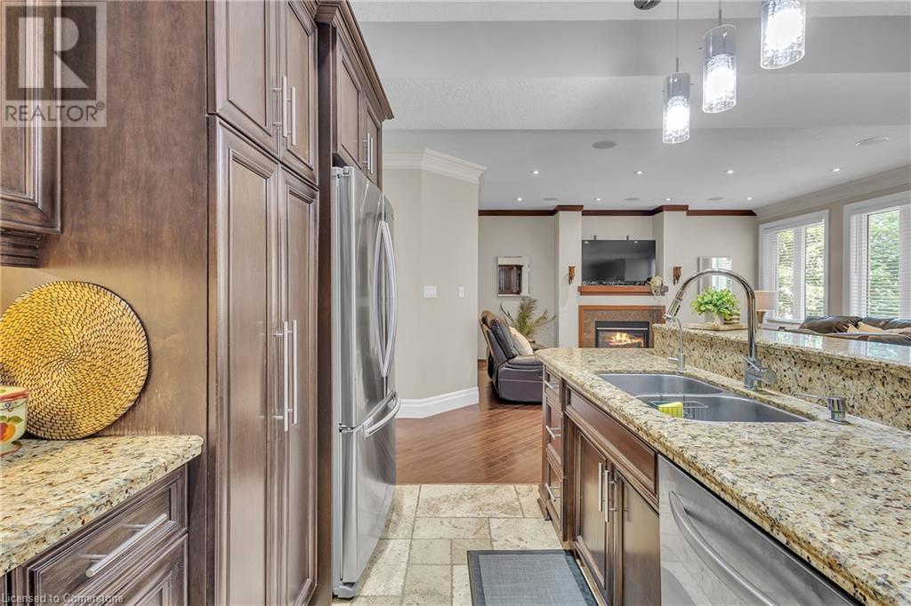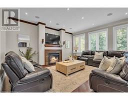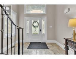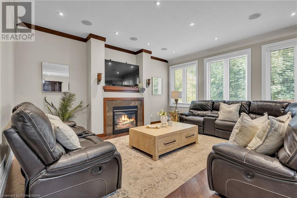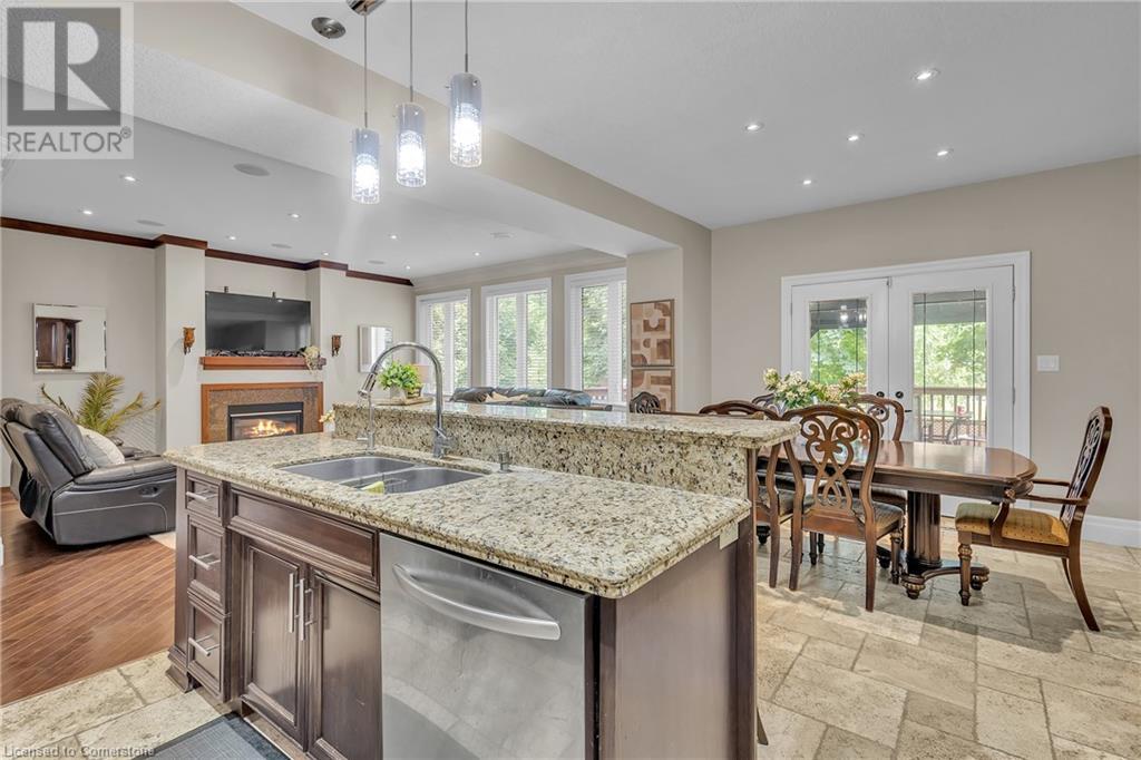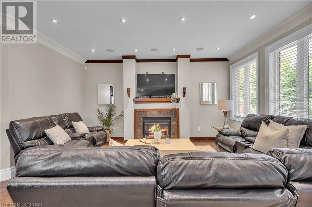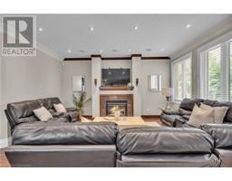 Freshly painted executive home located in the desirable Riverbank Estates neighborhood. Situated on a quiet cul-de-sac, this stunning property offers 9-ft ceilings and pot lights throughout the main floor, with over 3,200 sq. ft. of total living space including a fully finished basement. With parking for 6 vehicles and no sidewalk, this home boasts exceptional curb appeal featuring a long driveway, a stucco front façade with exterior pot lights, and an inground sprinkler system. High-end finishes and meticulous attention to detail are evident throughout. Step into the main foyer with soaring ceilings and an open-to-above layout. Pass the elegant oak staircase with metal railings and enter the living room with a coffered ceiling. The open-concept kitchen features stainless steel appliances, a new range hood, under-cabinet lighting, granite countertops, and a center island with a raised breakfast bar. The dinette area overlooks and opens to a covered patio deck—perfect for year-round enjoyment. The family room adjacent to the kitchen includes a natural gas fireplace and expansive windows spanning the length of the room, flooding the space with natural light. Upstairs, you’ll find three generously sized bedrooms. The primary bedroom features a 5-piece ensuite and a walk-in closet. Bedrooms 2 and 3 share a 4-piece main bath. The spacious second-floor laundry room adds extra convenience. The fully finished basement has great potential as an in-law suite, offering a bedroom, full bathroom, cold room, and a large carpet-free living area with a natural gas fireplace. (id:46441)