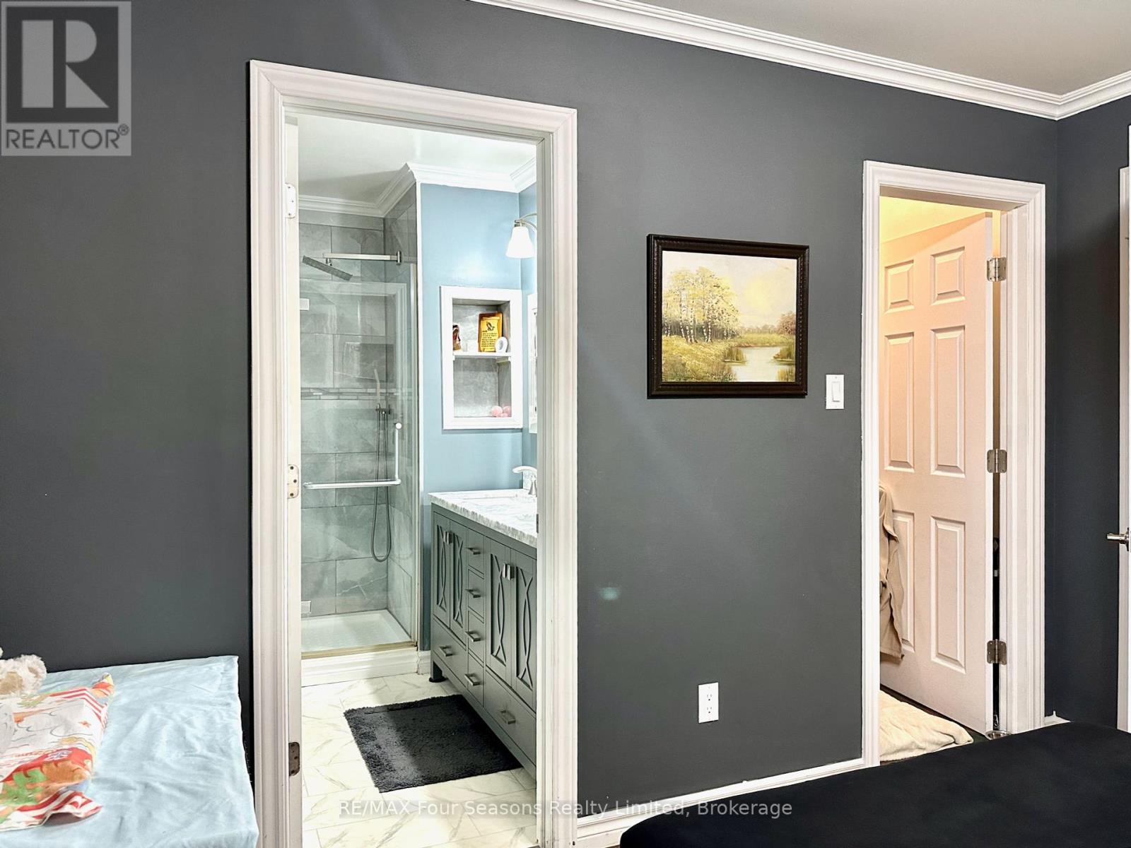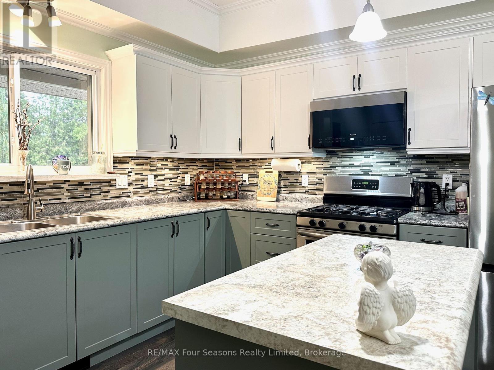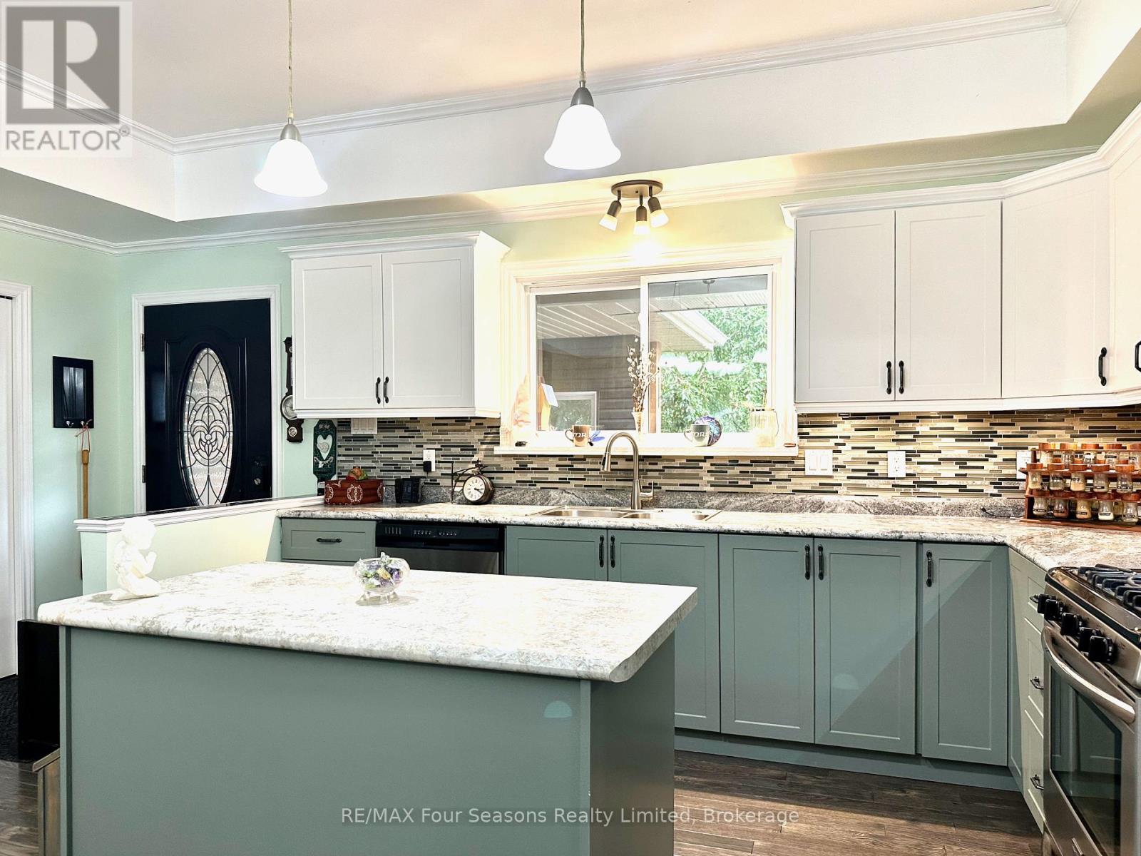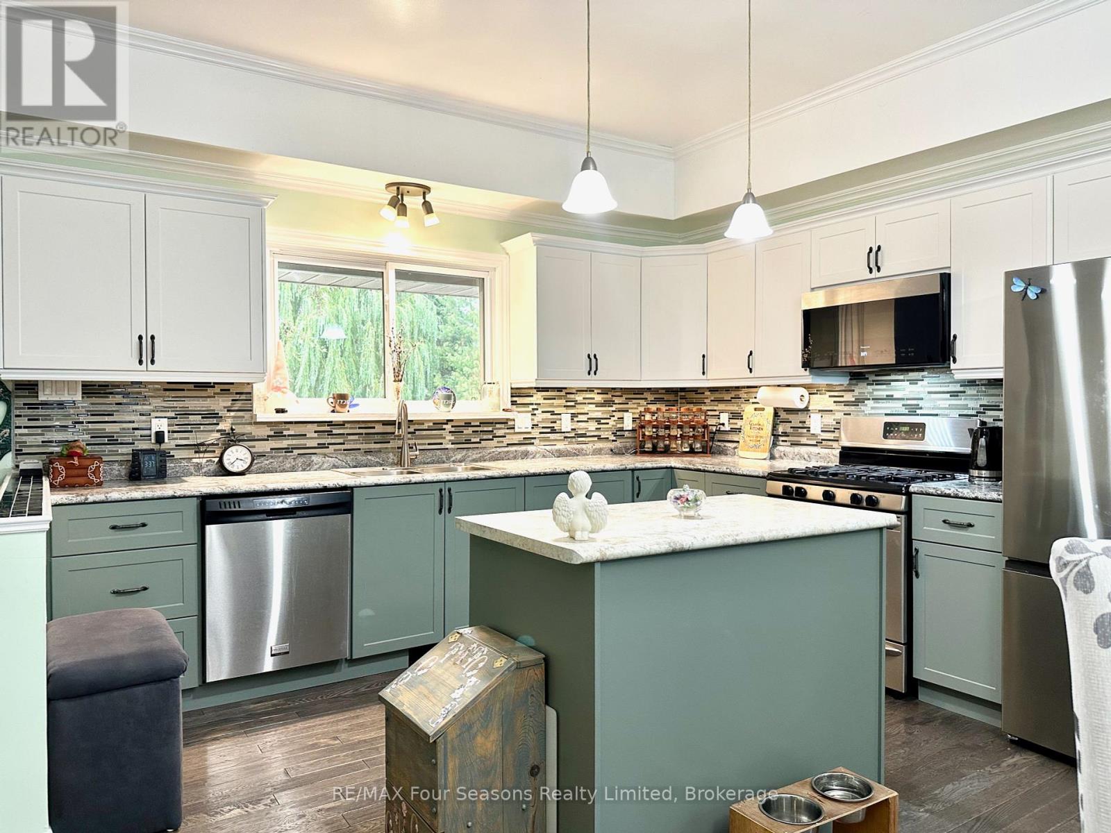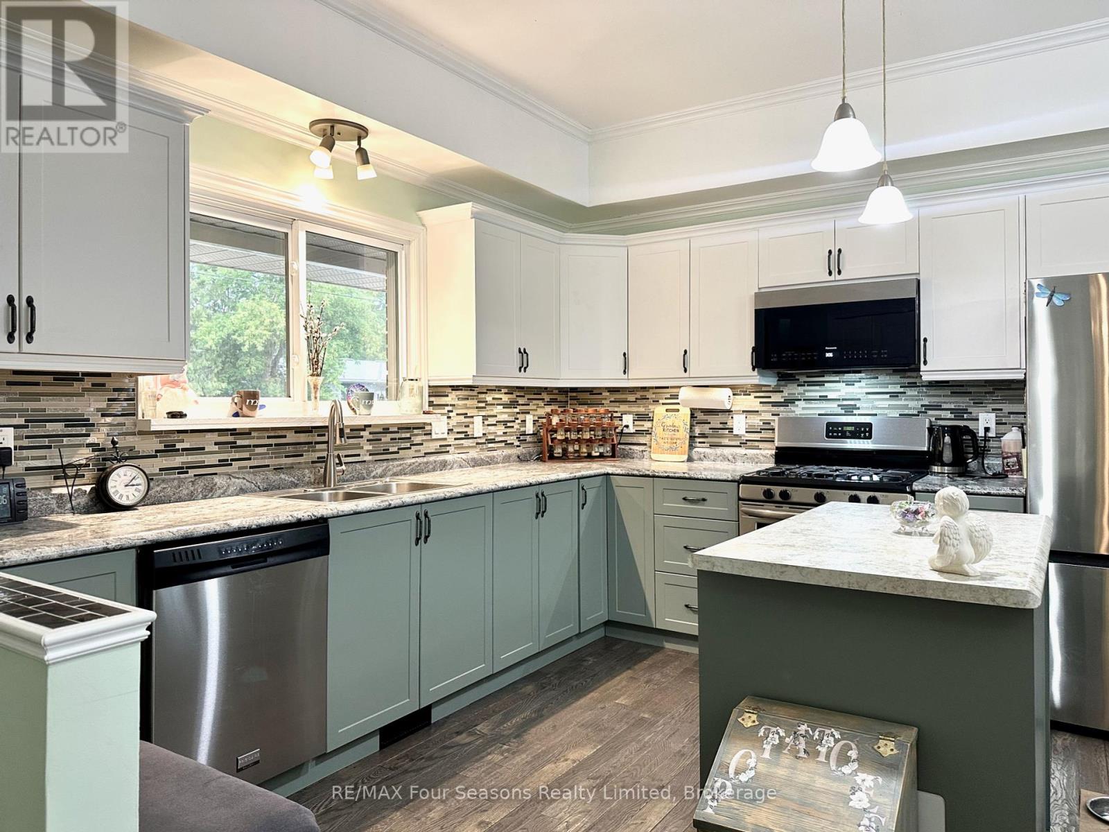 HUGE LOT - Welcome to this charming and fully updated 2-bedroom, 2-bath bungalow in the heart of Stayner. Set on an impressive 60 x 260 lot, this home offers modern comfort with plenty of space to enjoy inside and out. The open-concept design features a bright kitchen with a gas range that flows seamlessly into the dining and living areas. A spacious living room with custom built-ins, electric fireplace, and sliding doors leads to a large back deck with a covered gazebo area - perfect for outdoor dining and entertaining. The primary suite is complete with a walk-in closet and private ensuite, while a second bedroom and full bath provide flexibility for family or guests. Enjoy the covered front porch with ramp access, a 16 x 20 detached insulated garage with hydro, a paved driveway, and an additional storage shed. Move-in ready with numerous recent upgrades, this home is an excellent choice for first-time buyers, retirees, or anyone looking to downsize while still enjoying a generous lot and modern updates. Furnace (2023), Heat Pump (2022) (id:46441)