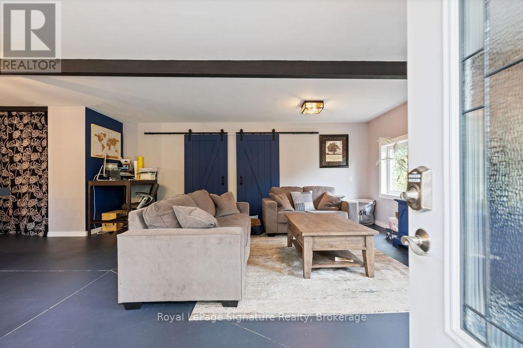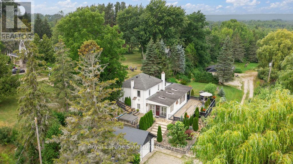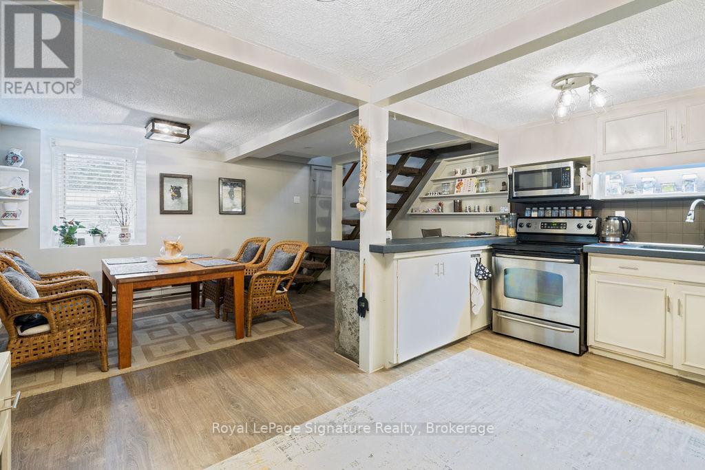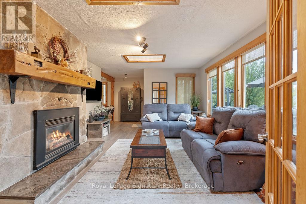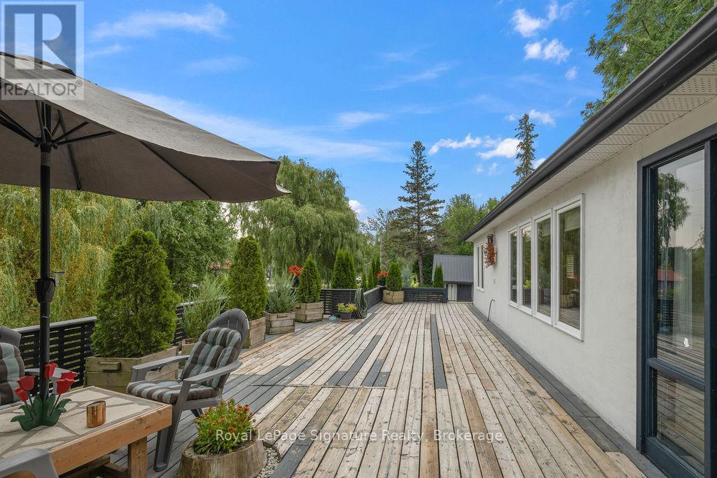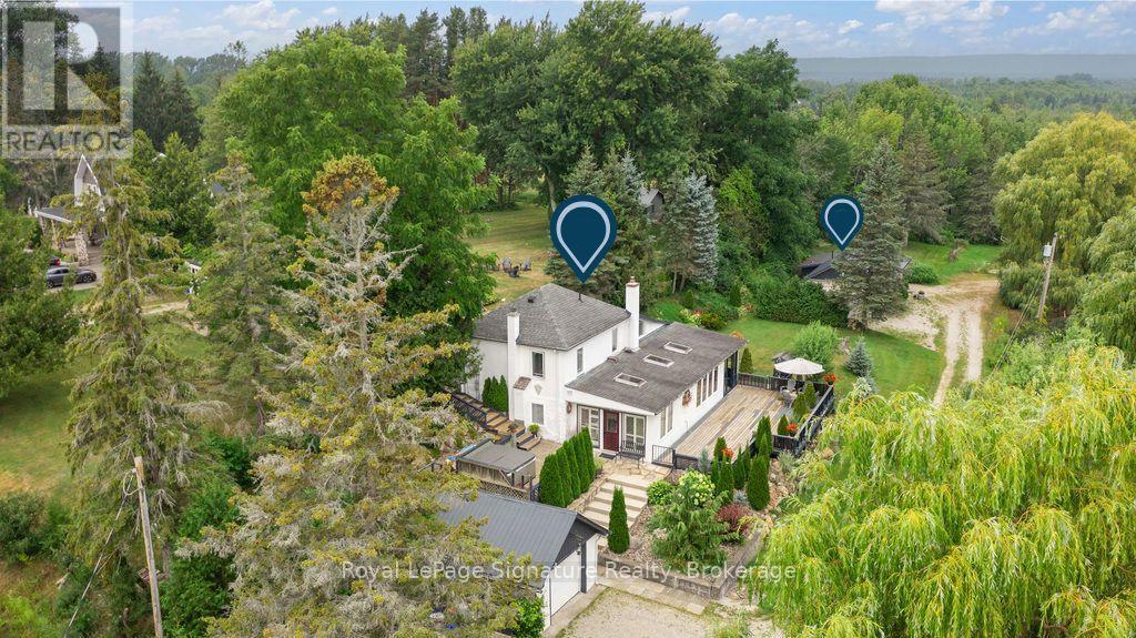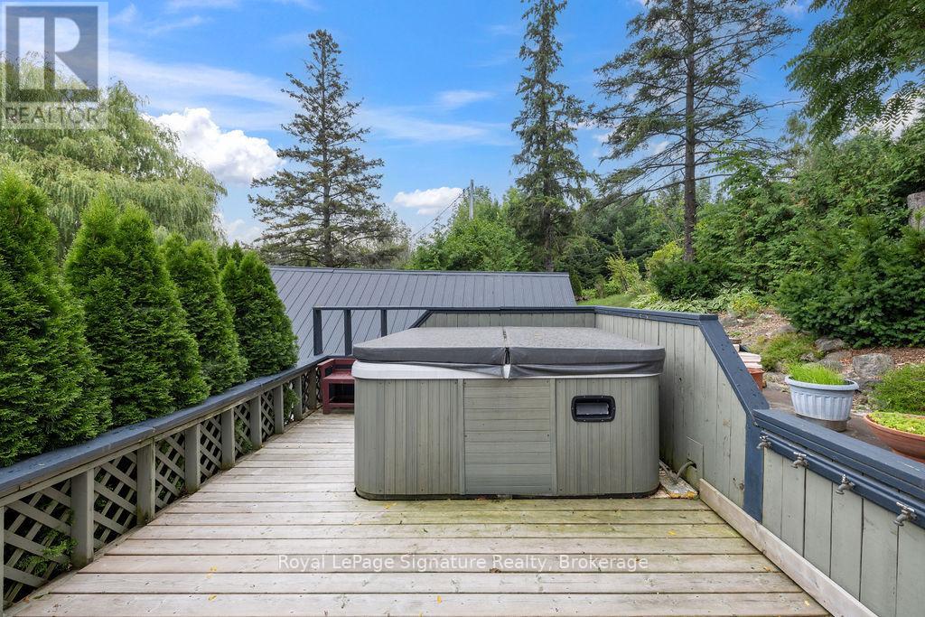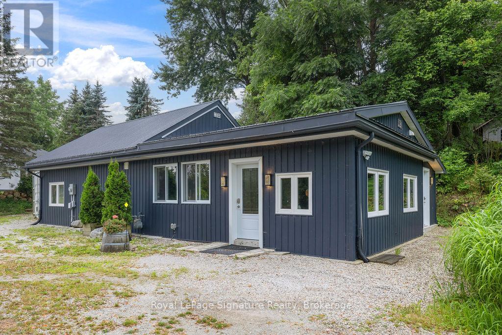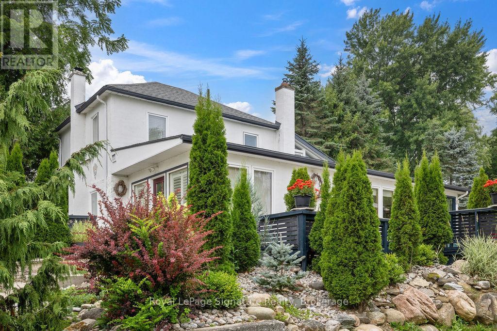 Less than 500 metres from the shores of Georgian Bay with beach access close by, this property offers a rare opportunity for multifamily living, an in-law residence, rental income or a weekend retreat. Set in a quiet enclave, it features two fully self-contained homes on one lot. The main home is a two-storey residence with 2 bedrooms upstairs and a flexible main floor room that could serve as a third bedroom or a home office. A natural stone fireplace with a reclaimed barn beam mantle anchors the living space, and large windows bring in plenty of natural light. Recent updates include new main-floor laminate flooring. The kitchen and wet bar offer an ideal layout for cooking and gathering. Expansive wrap-around decking on the front and side of the home creates space for outdoor entertaining, and a private hot tub space provides a place to relax year-round. The second residence offers single-level, fully accessible living (AODA compliant) with approximately 1,200 square feet. Recently renovated, it features wall-to-wall radiant in-floor heating, an open-concept kitchen and living area with an 8' x 4' island, and stainless steel appliances and a washer & dryer. The primary suite includes a large walk-in closet and a spa-like ensuite with a large soaker tub and separate shower. The second bedroom also has its own ensuite for guest privacy. Enjoy a setting that feels like the country but is only a quick drive or bike ride to downtown Meaford. Swim, boat, or kayak in the summer, explore nearby trails in every season, and some of the best skiing Ontario has to offer, take advantage of the year-round recreation Grey County has to offer. (id:46441)