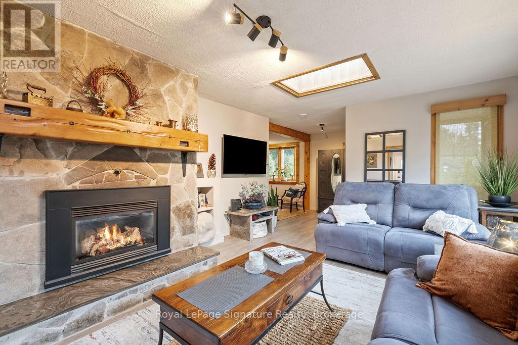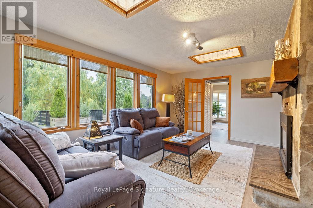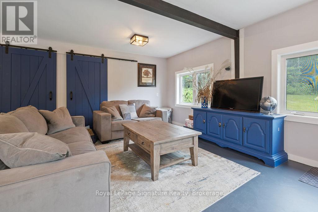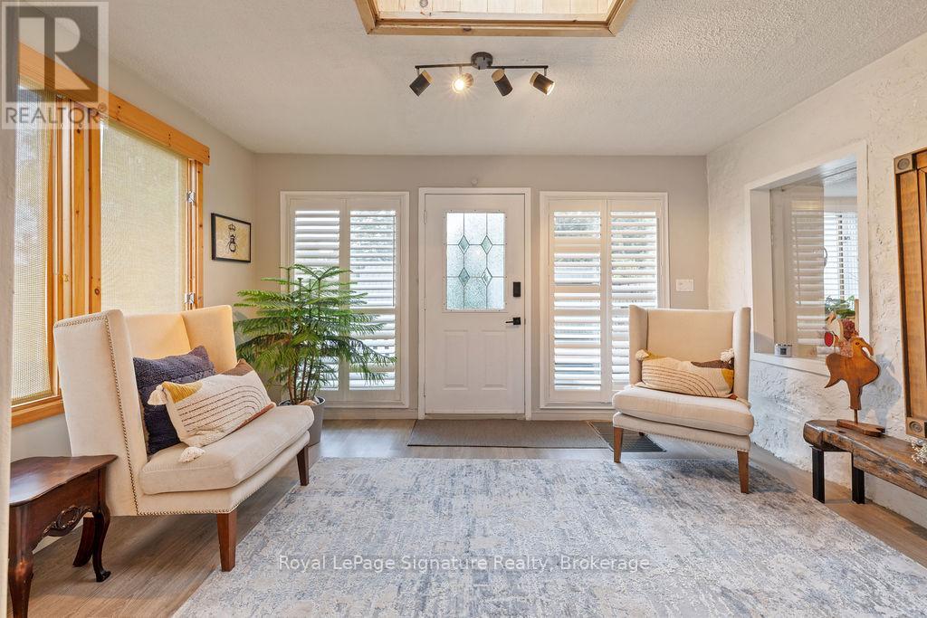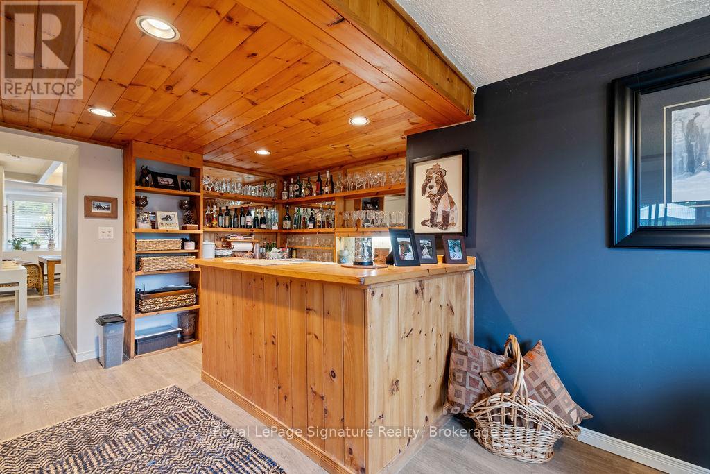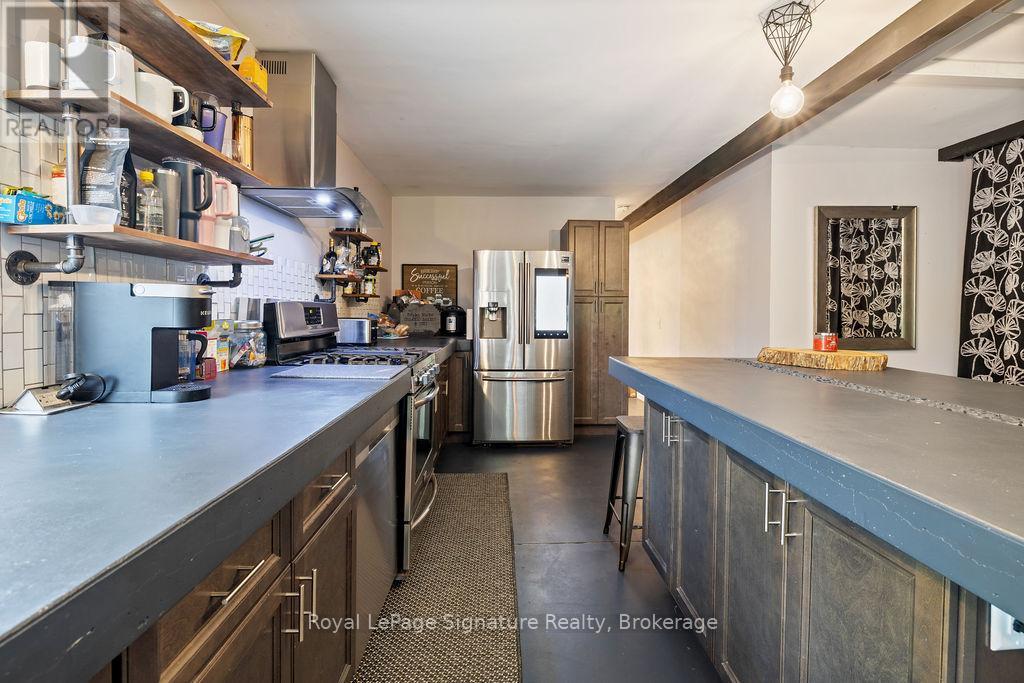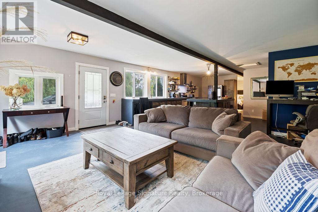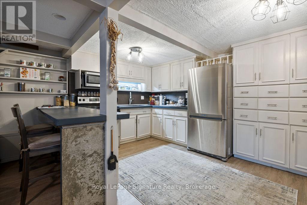 Less than 500 metres from the shores of Georgian Bay with beach access close by, this property offers a rare opportunity for multifamily living, an in-law residence, rental income or a weekend retreat. Set in a quiet enclave, it features two fully self-contained homes on one lot. The main home is a two-storey residence with 2 bedrooms upstairs and a flexible main floor room that could serve as a third bedroom or a home office. A natural stone fireplace with a reclaimed barn beam mantle anchors the living space, and large windows bring in plenty of natural light. Recent updates include new main-floor laminate flooring. The kitchen and wet bar offer an ideal layout for cooking and gathering. Expansive wrap-around decking on the front and side of the home creates space for outdoor entertaining, and a private hot tub space provides a place to relax year-round. The second residence offers single-level, fully accessible living (AODA compliant) with approximately 1,200 square feet. Recently renovated, it features wall-to-wall radiant in-floor heating, an open-concept kitchen and living area with an 8' x 4' island, and stainless steel appliances and a washer & dryer. The primary suite includes a large walk-in closet and a spa-like ensuite with a large soaker tub and separate shower. The second bedroom also has its own ensuite for guest privacy. Enjoy a setting that feels like the country but is only a quick drive or bike ride to downtown Meaford. Swim, boat, or kayak in the summer, explore nearby trails in every season, and some of the best skiing Ontario has to offer, take advantage of the year-round recreation Grey County has to offer. (id:46441)
