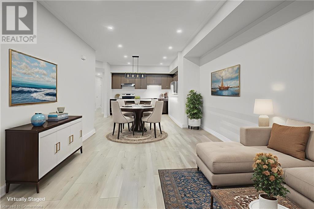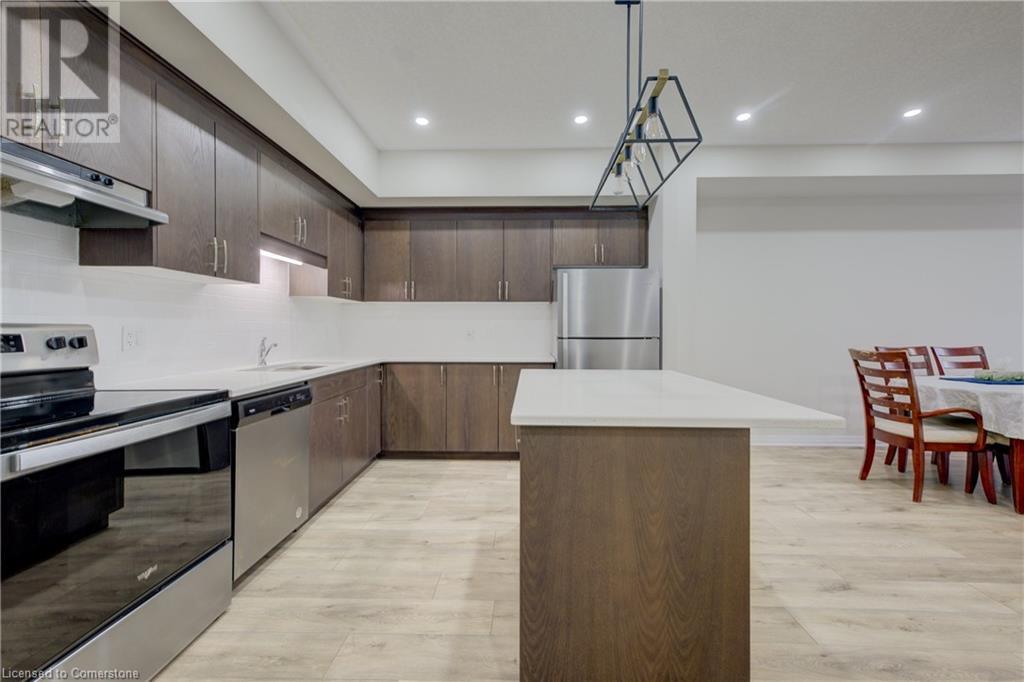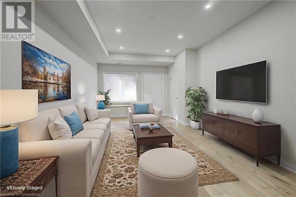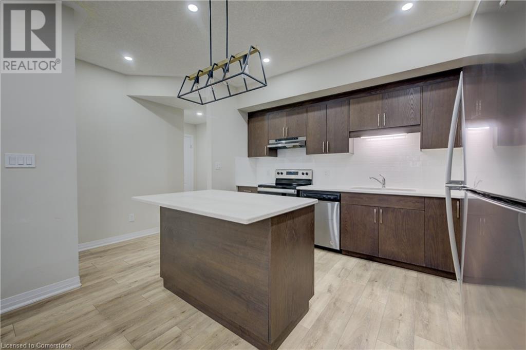 $247.13 MonthlyThis modern, upgraded end-unit townhome offers 3 spacious bedrooms, 2 full bathrooms, and 1,150 sq.ft. of thoughtfully designed living space with pot lights throughout. Located in a prime area of Cambridge, it delivers both comfort and convenience in a desirable community setting. Step into a bright, open-concept living room featuring soaring 9’ ceilings and abundant natural light, with a sliding glass door that leads to your private patio backing onto peaceful greenspace. The stylish kitchen is perfect for entertaining, equipped with a large quartz island, granite countertops, stainless steel appliances, and generous cabinet space. The primary bedroom includes a walk-in closet and a sleek ensuite bathroom with a glass shower enclosure. Two additional well-sized bedrooms, a second full 4-piece bathroom, and in-suite laundry complete the layout. This home is carpet-free throughout for easy maintenance. Extras include one parking space and 1.5 Gbps high-speed unlimited internet, all included in the affordable condo fees. Ideally situated near Cambridge Centre, excellent schools, the Grand River, Galt Country Club, downtown Cambridge, Highway 24, and just a short drive to Hwy 401 — this home is perfect for anyone seeking a low-maintenance, move-in-ready lifestyle. (id:46441)