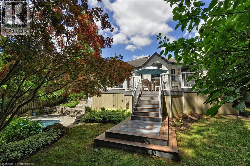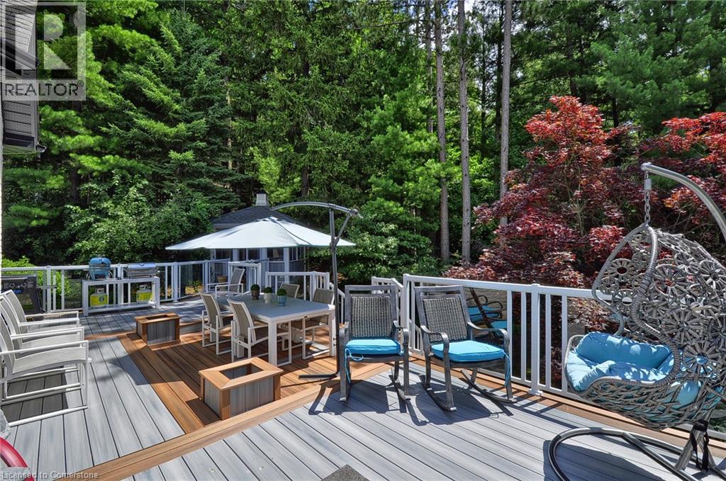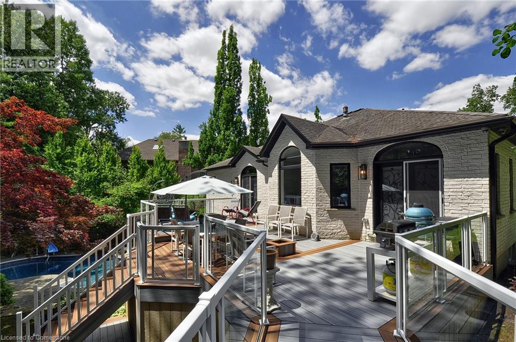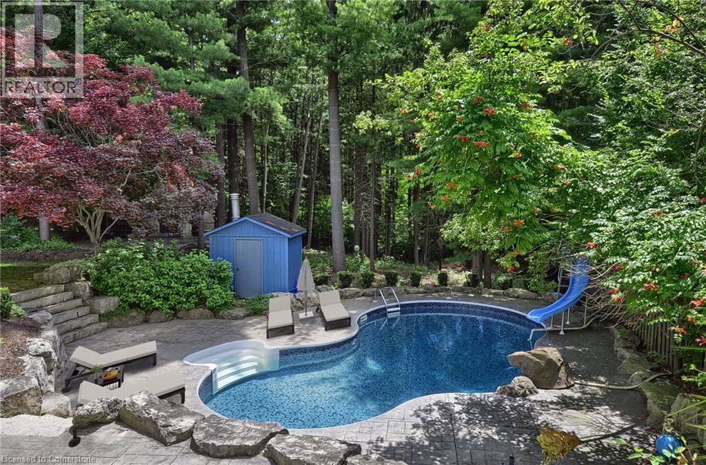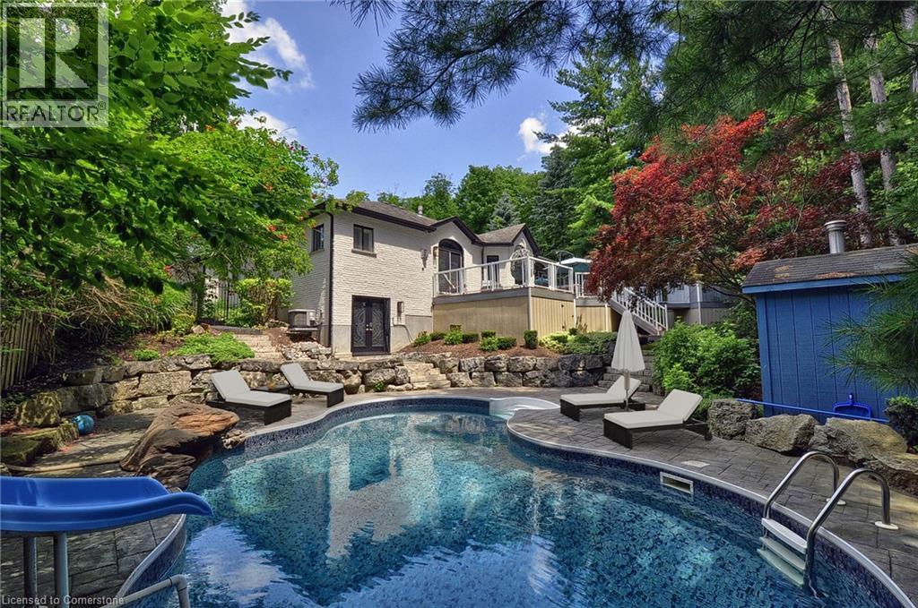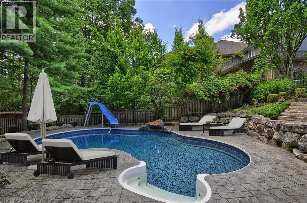 One of a kind, luxury bungalow in one of Doon’s most exclusive enclaves, welcome to Wyldwoods. This extraordinary residence is on a private court with an extraordinary lot that will transform you to a private oasis. With an abundance of mature trees, you’ll enjoy resort-style living in your own backyard. With an in-ground pool, expansive maintenance-free composite deck with a bridge to a fully finished outdoor living area, perfect for an art studio, a place to watch the big game, play a game of cards. French doors from the primary bedroom and also from the kitchen lead to the outdoor living area. For additional outdoor living, tucked away in the trees is a patio with a wood burning fireplace. This custom-built bungalow has been fully transformed and updated in the last 3 years and features venitian plaster walls and finishes that were meticulously sourced and often not found in local home mprovement stores. The main level features 3 spacious bedrooms, two of them each have their own private ensuite bathroom plus there’s 3rd full bathroom on the main level. The primary ensuite features imported artisan tiles from Spain, a soaker tub and oversized glass enclosed shower & granite counters. The showpiece kitchen has custom built-ins features like the island table with attached wine wall and a one of kind ceiling mural. The fully finished basement has a walk out with french doors to the pool, a massive media room and spa inspired bathroom complete with galss enclosed steam room/shower. Plus a complete apartment with a separate private entrance from the garage walk down, suitable for multigeneral families or those looking for additional income from the basement apartment. Three gas fireplaces each with one of a kind stone mantels. The dream triple garage with wall mounted whisper quiet door openers and hydrolic car lift/hoist adds even more distinction to this one of kind home. 2024 Air conditioner Pool heater 2019 Pool liner 2018 Pool pump 2010 Roof (id:46441)