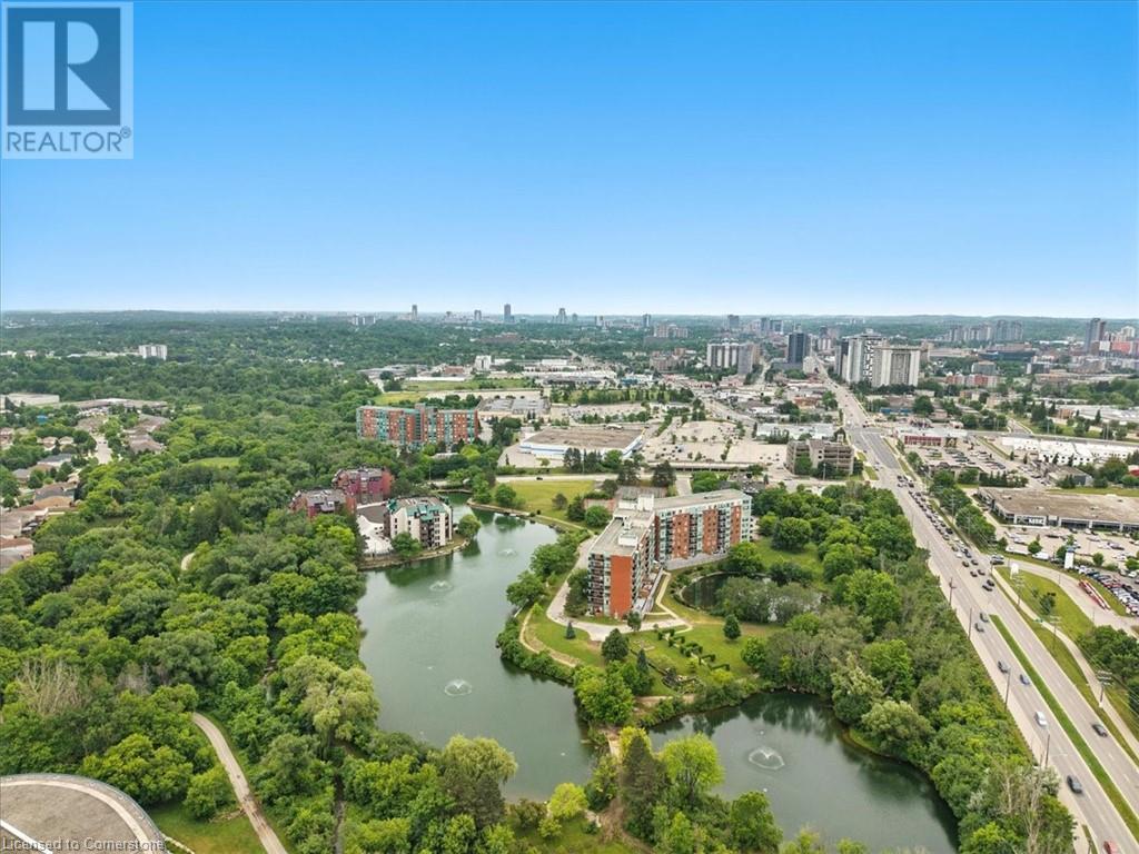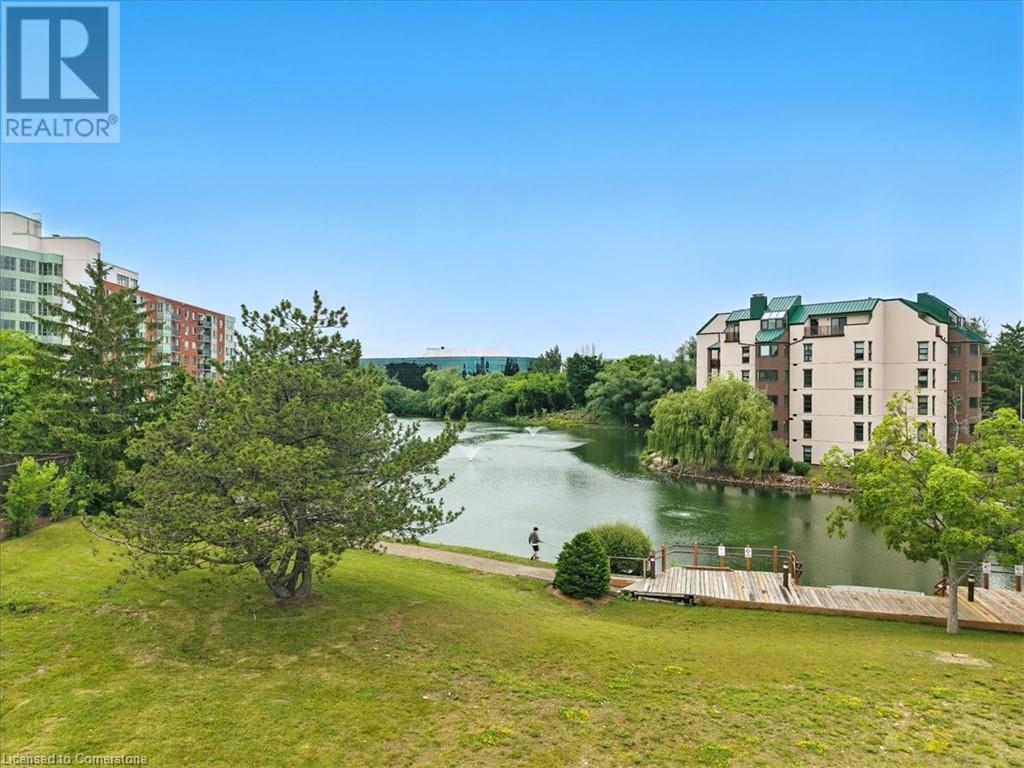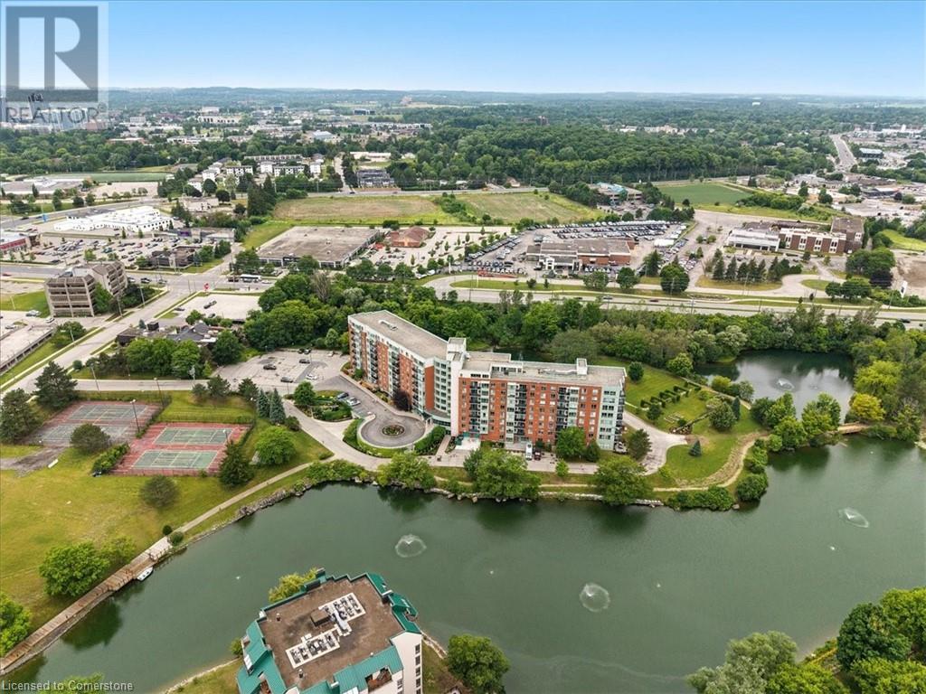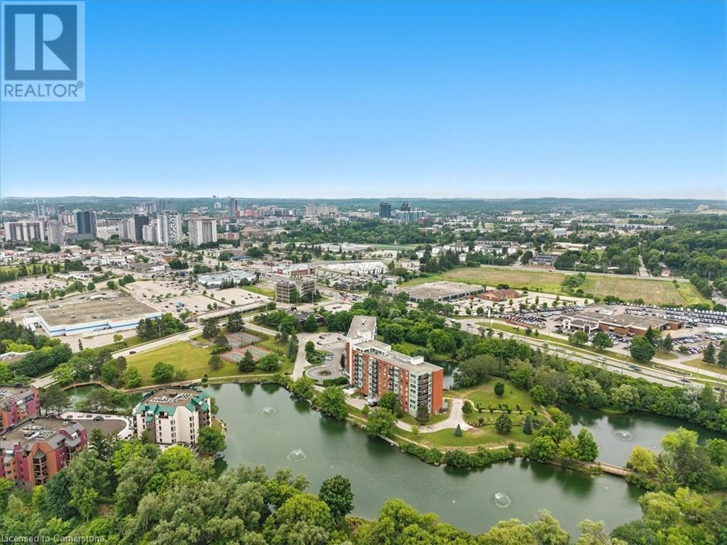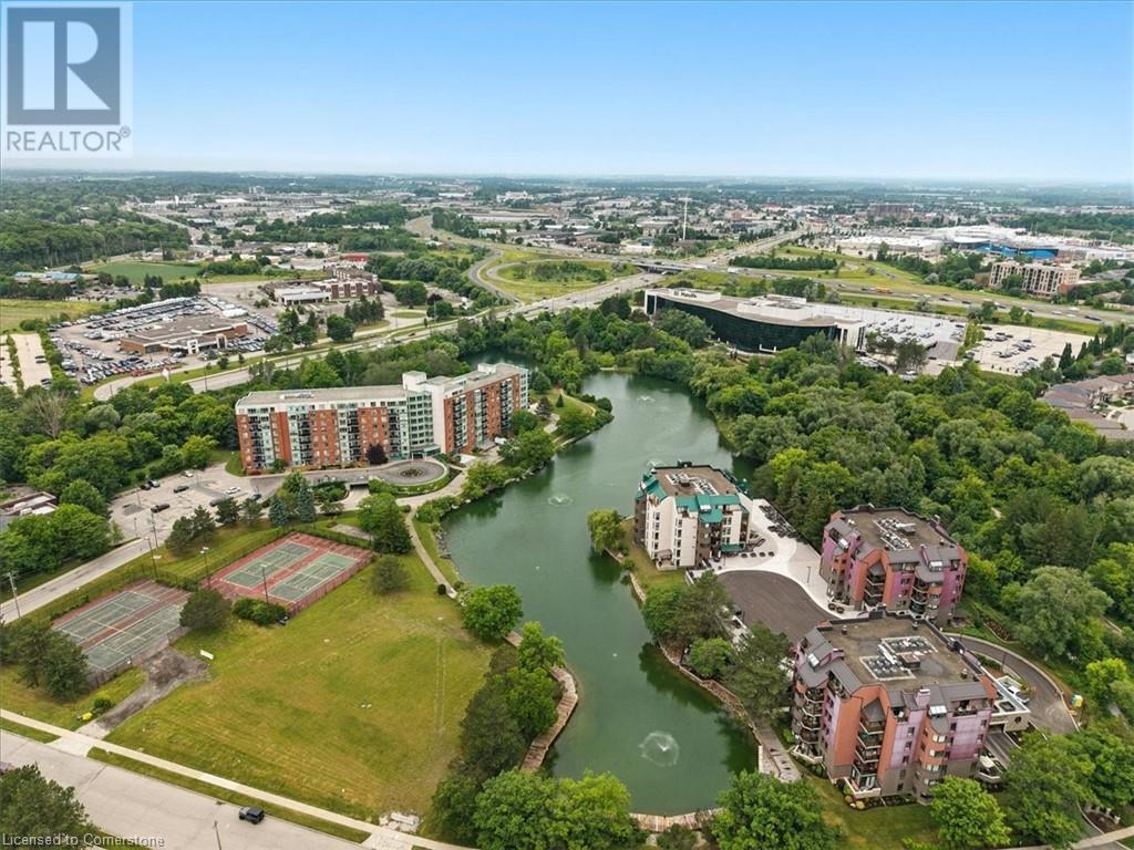 Discover your urban sanctuary in vibrant Uptown Waterloo! This 2-bedroom, 2-bath condo in a sought-after building blends tranquility with convenience. Steps from Conestoga Mall, three grocery stores, restaurants, and boutiques, you’ll relish the walkable lifestyle. Commuting is a breeze with the nearby LRT station, bus stop at King & Blue Springs Dr., and easy access to the expressway. Plus, Conestoga College, University of Waterloo, and Wilfrid Laurier University are nearby. Marvel at breathtaking views of Four Wells Lake and its lush treeline, framed by floor-to-ceiling living room windows that bathe the unit in natural light. Surrounded by scenic trails, ponds, and streams, this condo offers a serene escape with nature at your doorstep. Inside, the 961 sq. ft. layout includes a galley kitchen with breakfast nook and ample storage. The open-concept living/dining area is perfect for entertaining or quiet nights in, while two spacious bedrooms and two full baths provide flexibility and privacy. In-suite laundry, a private storage locker, and one underground parking spot (plus a second surface space) add everyday convenience. Elevate your lifestyle with exceptional amenities: secure entry, updated balconies, touchscreen directory, and elevators. Unwind in the rooftop lounge with sundeck and gas BBQ, or host events in the party room (for a small fee), both with kitchens and restrooms. Savour summer barbecues by the back pond’s pergola, or book the guest suite for overnight visitors. With ample visitor parking, bike storage, and a library, every detail enhances your living experience. Priced at $449,900, this move-in-ready condo is a blank canvas awaiting your personal touch. Don’t miss the chance to embrace Uptown Waterloo’s perfect blend of urban energy and natural serenity. Interior photos are unavailable out of respect for tenant privacy. Showings can be arranged with notice, and vacant possession is available if purchased for personal residence. (id:46441)