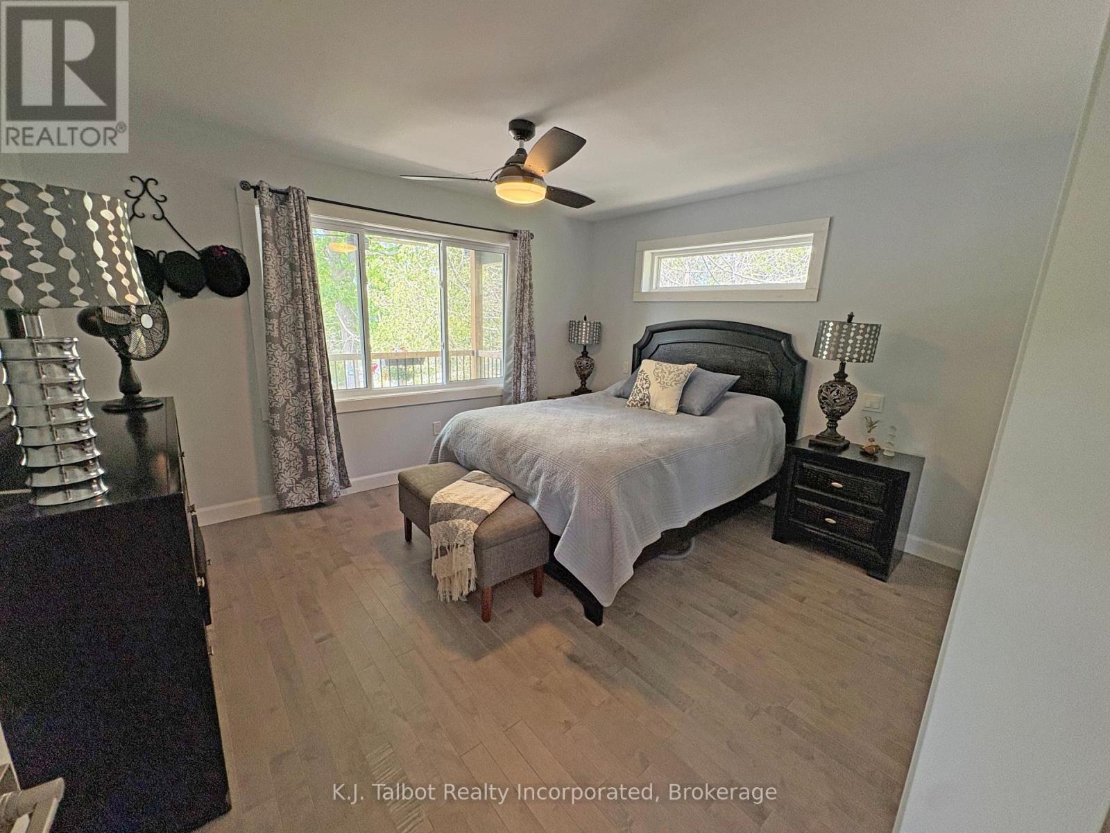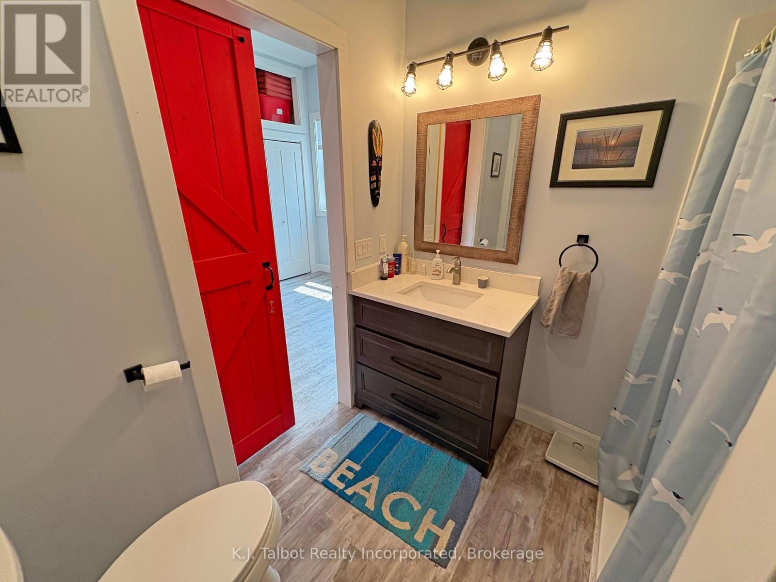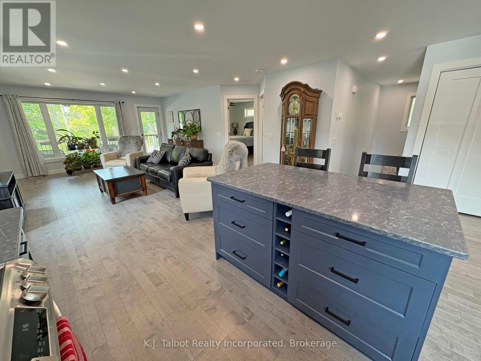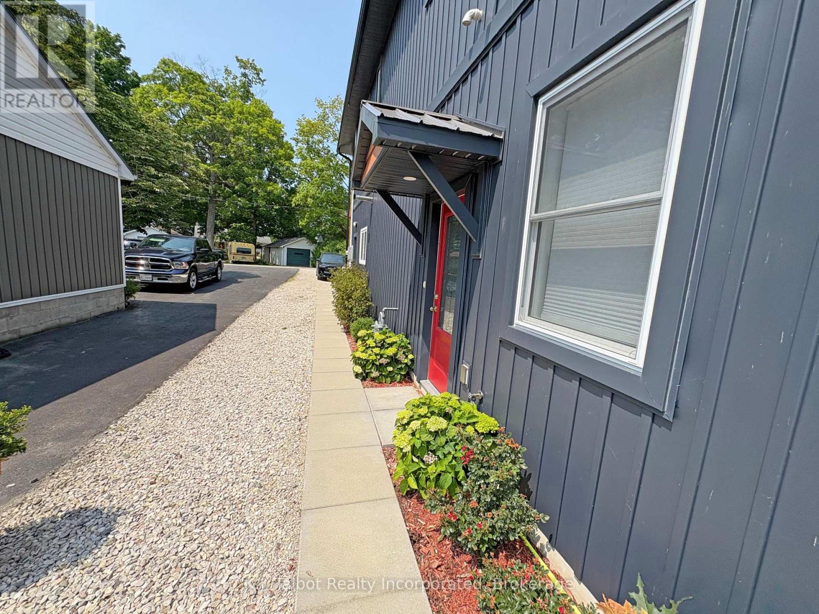 Presenting an impressive lakeside property along the beautiful shores of Lake Huron. This uniquely designed 2021 slab-on-grade, two-story home features an oversized two-car garage and is ideally situated just minutes south of Goderich in the established Lakeside community of Bluewater Beach. Residents will appreciate the short walking distance to beach access, a playground, a pavilion, and nearby trails, perfect for outdoor enthusiasts. This distinct residence, offering two plus one bedrooms and two bathrooms, is ideal for those seeking an unconventional and comfortable living experience. The upper level boasts a stunning open-concept kitchen, dining, and living room, showcasing a large kitchen island with gleaming quartz countertops and a generous walk-in pantry. The main level exhibits an urban-style vibe with a family room, utility area, a 3-piece bathroom, and a potential third bedroom or office space. The home is thoughtfully designed with two decks to enhance comfort and enjoyment of the outdoor space. Notably, the upper front deck includes ceiling fans that help circulate air, maintaining a cool environment on warm days and deterring insects, thus creating a versatile and enjoyable outdoor area for relaxation and entertainment. Additional features include a seasonal lakeview, backyard shed, natural gas BBQ hook up, plenty of parking and central vac. This is a quality home with so much to offer, we encourage you not to miss out! (id:46441)