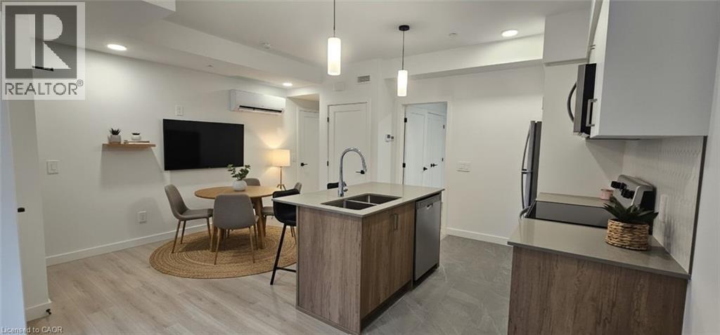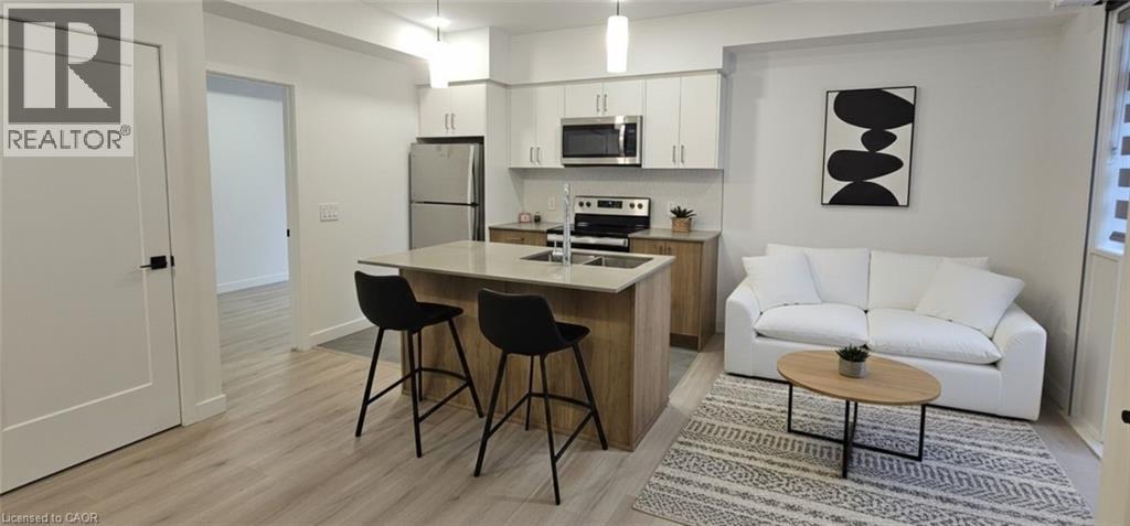 FOR LEASE IN THE VIBRANT NEW VIVA COMMUNITY. Welcome to Viva, the newest addition to Mill Street offering a bright and modern lifestyle in the heart of downtown Kitchener. This stylish Musa end-unit features an open-concept layout with a kitchen that includes a breakfast bar, quartz countertops, stainless steel appliances, and luxury vinyl plank and ceramic flooring throughout. Offering 542 sq. ft. of comfortable living space, this unit includes 1 bedroom with a large window, 1 full bathroom, and a private balcony. Enjoy the perfect blend of convenience and nature with the Iron Horse Trail, Victoria Park, the iON LRT, local shops, cafés, and restaurants all just steps away. Thrive in a vibrant, walkable neighbourhood while enjoying the peace of a professionally landscaped, residential community. Heat, hydro, water, and hot water heater are to be paid by the tenant(s). Good credit is required, and a full application must be submitted. AVAILABLE Immediately. Photos are virtually staged. (id:46441)