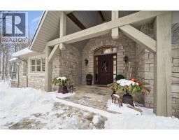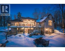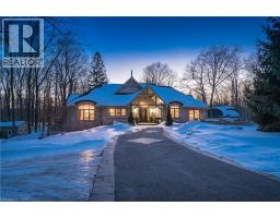 Absolutely stunning custom-built 4-bedroom, 3-bathroom walkout bungalow set on 7.21 picturesque wooded acres in Baden. Ideally located just minutes from schools, the recreation center, major retailers including Costco, Walmart, and Canadian Tire, and with convenient access to the 7/8 expressway, this property offers the rare combination of everyday convenience and the tranquility of a private country retreat. Designed for both comfortable family living and exceptional entertaining, the property features a 4,000 sq. ft. shop with four oversized drive-in doors, a multi-sport court, and a classic bank barn with double overhead doors—ideal for animals, hobbies, or additional storage. The home showcases a beautiful blend of rustic charm and modern comfort. The Wiarton limestone and stucco exterior create striking curb appeal, while inside you’ll find impressive 13-foot ceilings, custom built-in cabinetry with a limestone fireplace surround, and a warm maple kitchen complete with marble countertops. Two walkouts lead to elevated deck spaces, perfect for enjoying morning coffee or evening sunsets overlooking the property. Outdoors, the landscaped grounds offer mature gardens, an exposed aggregate driveway and patio areas, and a cozy outdoor fireplace. Scenic walking trails wind through the mature hardwood bush, creating a true haven for nature lovers and outdoor enthusiasts. A rare and remarkable opportunity to own a private estate that seamlessly blends luxury, functionality, and natural beauty. (id:46441)