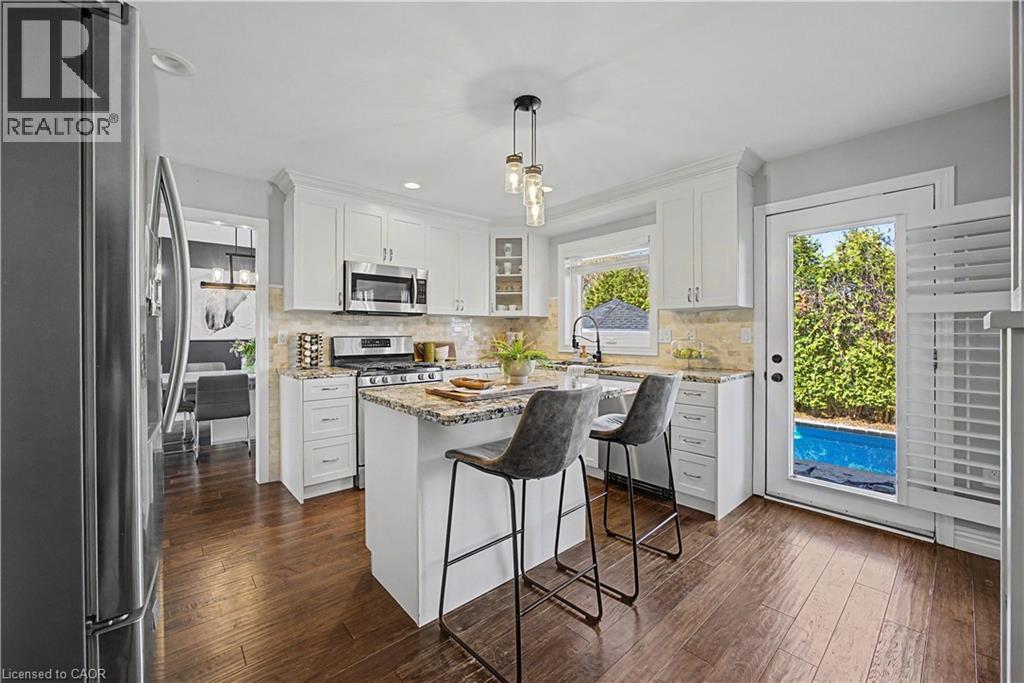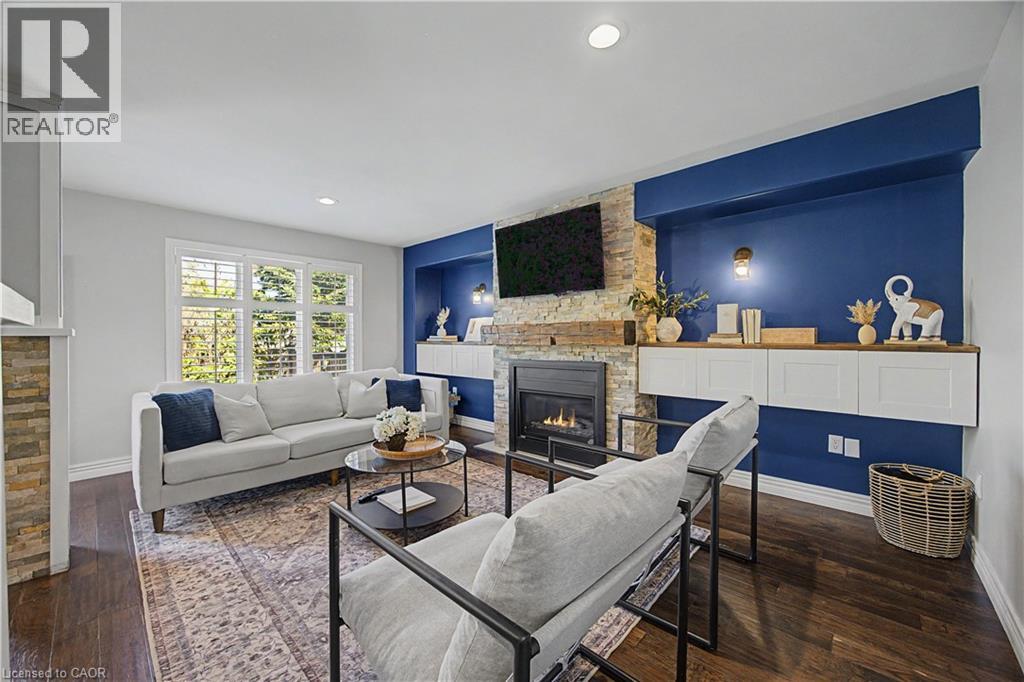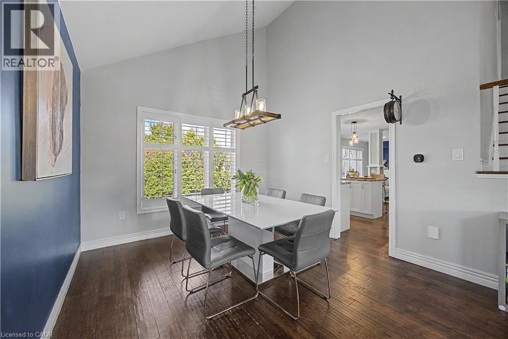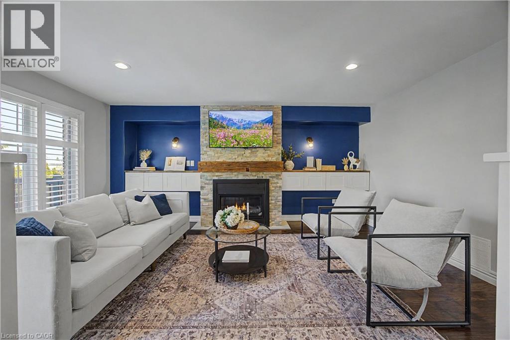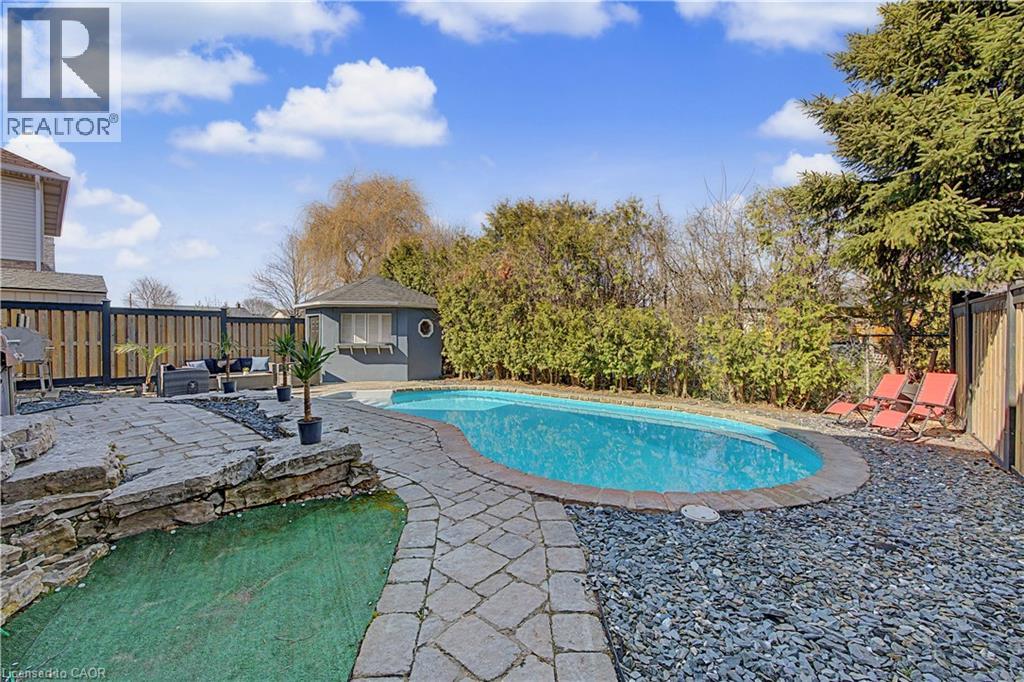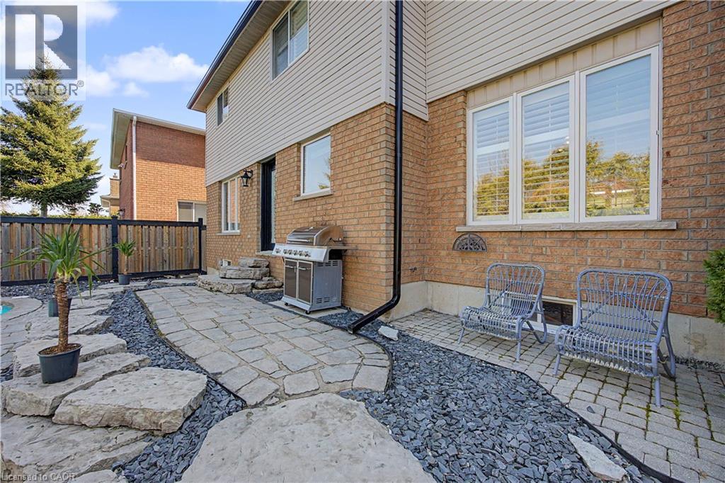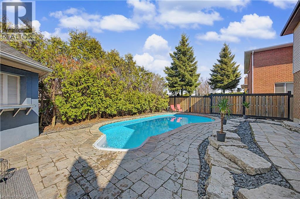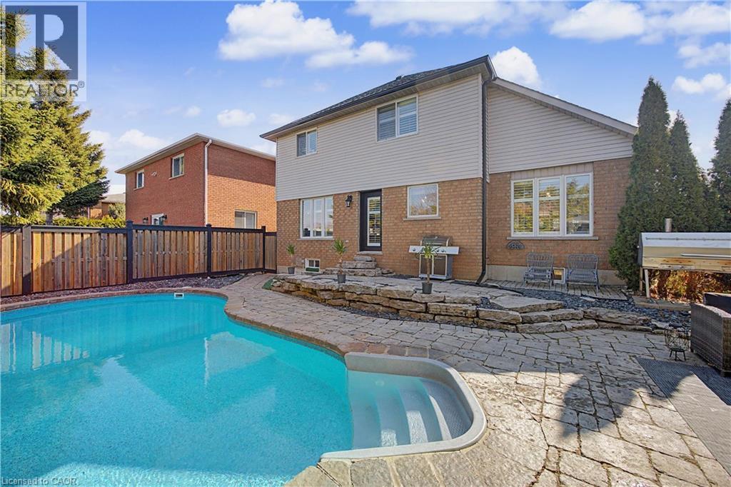 The perfect family home in the sought-after Stoney Creek Mountain, Leckie Park neighbourhood. Brimming with curb appeal, this 3-bedroom, 3.5 bathroom home offers over 3100 sq ft of finished living space. Tastefully decorated and thoughtfully updated, there’s nothing to do but move in. Soaring vaulted ceilings in the formal living and dining area create a bright and open feel. The family room features a cozy gas fireplace, built-in storage, and opens into the beautifully updated custom kitchen, complete with granite counters, a centre island with seating, and high-end appliances. Upstairs, you’ll find three well-sized bedrooms, including a spacious primary suite with a walk-in closet and a 5-piece, spa-like ensuite featuring double sinks, a glass shower, and a freestanding soaker tub. The fully finished basement offers plenty of storage, flexible living space, and a 3-piece bathroom. Step outside to your own private backyard retreat, complete with a heated inground pool and stone patio—ideal for relaxing or entertaining. The 2.5 car garage is insulated and equipped with a split unit for heating and A/C (2021). Additional features include hardwood flooring throughout the main and upper levels, pot lights, California shutters, main floor laundry, and updated bathrooms. Recent updates include the roof shingles (2022), eavestroughs and downspouts (2023), and pool liner and heater (2023). Conveniently located close to schools, parks, playgrounds, shopping, entertainment, transit, highway access, and scenic nature trails. (id:46441)