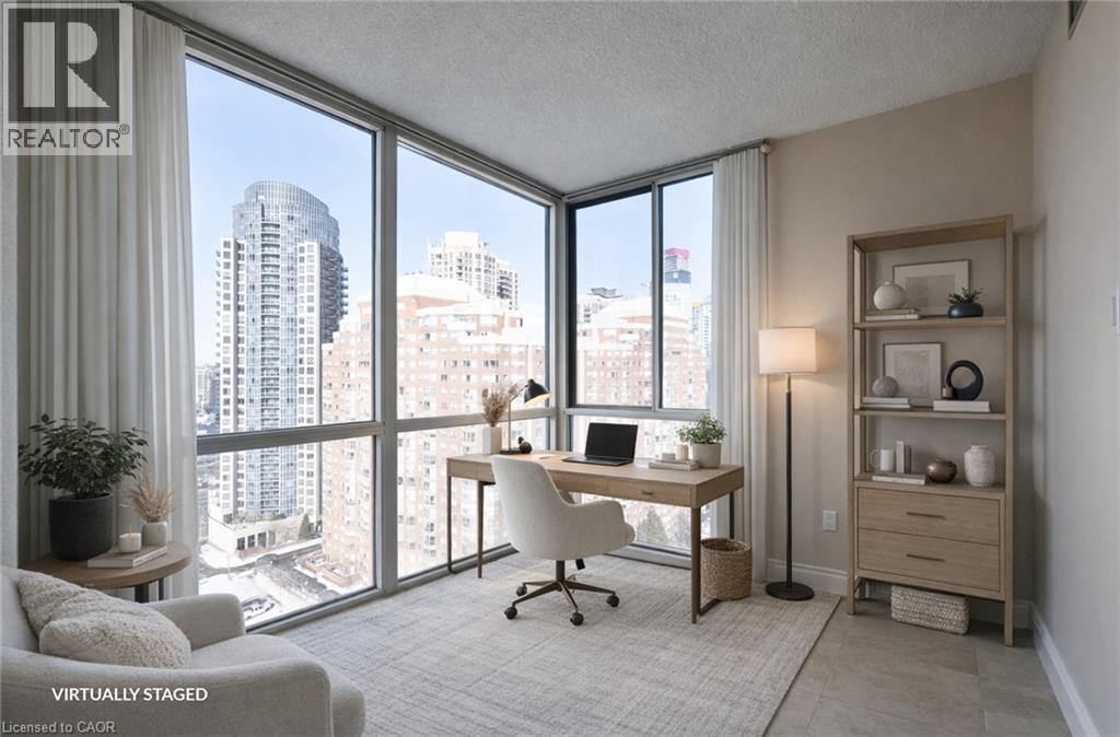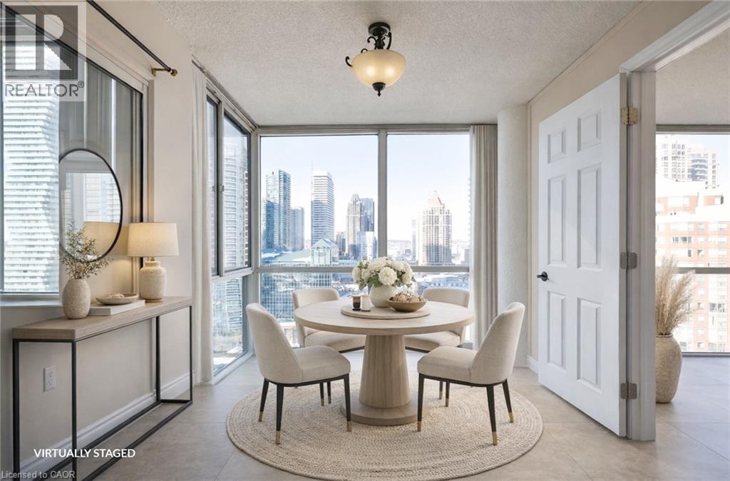 Experience upscale condo living in the heart of Mississauga with stunning views from Unit 2109 at 350 Webb Drive. This beautifully maintained 2-bedroom plus den, 2-bath residence offers a functional layout, with the den large enough to be used as a third bedroom or home office. Featuring laminate flooring throughout, the open-concept living and dining area is bright, modern, and ideal for both everyday living and entertaining. The upgraded kitchen boasts quartz countertops, a breakfast bar, stainless steel appliances, tile flooring, seamlessly flowing into a sun-filled, glass-enclosed breakfast area, which is also perfect as a workspace or lounge area. Enjoy the convenience of in-suite laundry and a private locker for added storage. A true rarity, this unit includes two side-by-side parking spaces, offering exceptional convenience and value. Residents enjoy an impressive array of building amenities, including 24-hour security/concierge, exercise centre, cardio and weight rooms, swimming pool, jacuzzi, sauna, squash court, table tennis, party room, pool table, and ample visitor parking. Maintenance fees include water, heat, central air conditioning, building insurance, parking, and common elements. Ideally located just minutes from Highways 403, 401, and QEW, and steps to Square One, Celebration Square, Sheridan College, parks, dining, and transit...this is urban living at its finest. (id:46441)