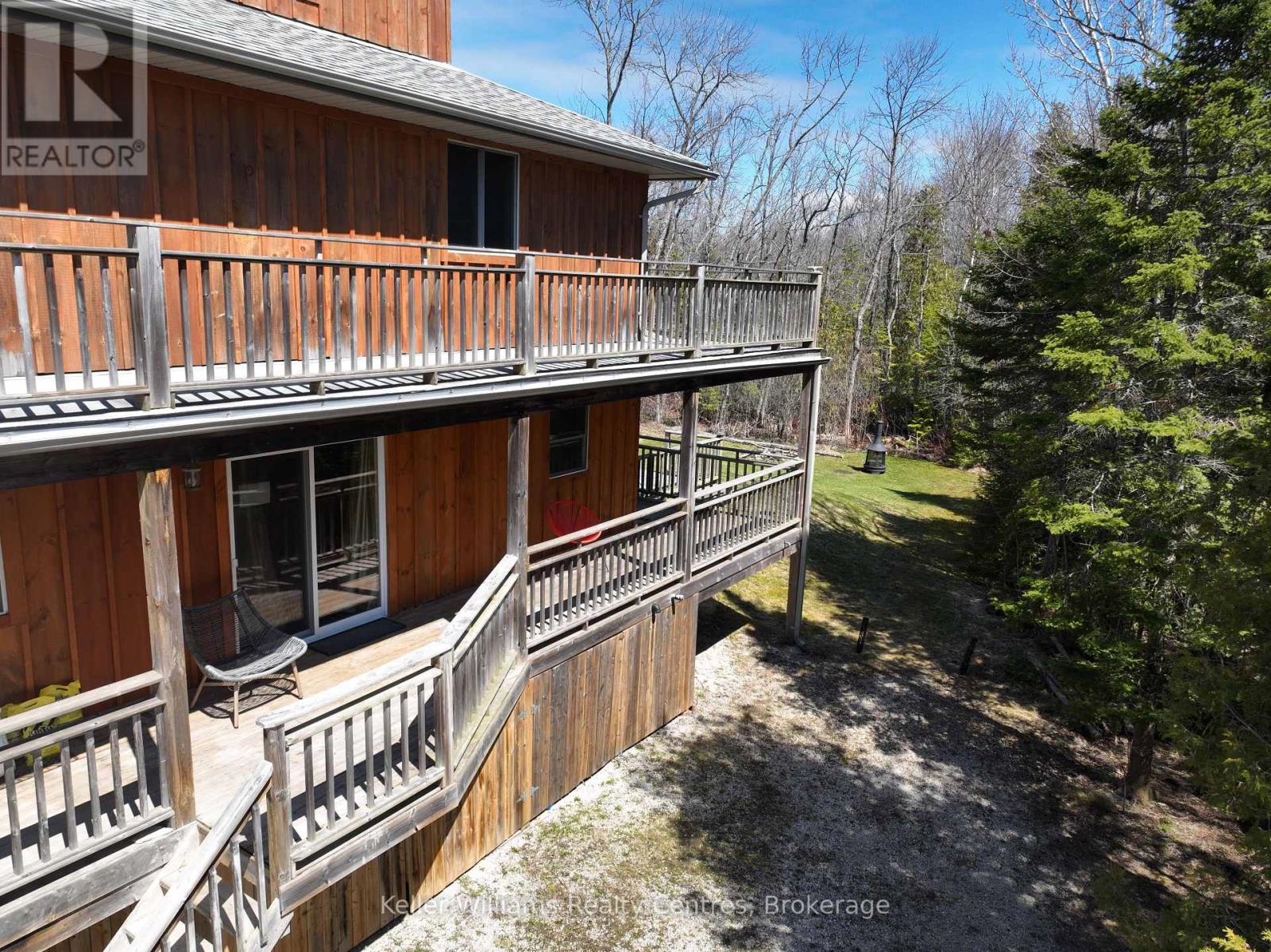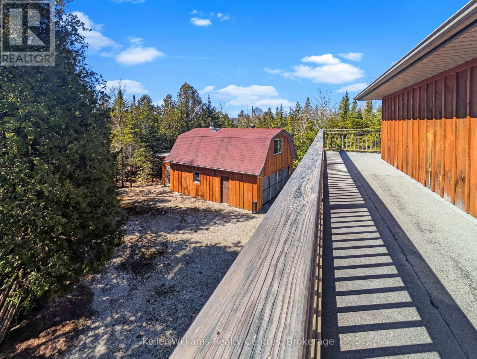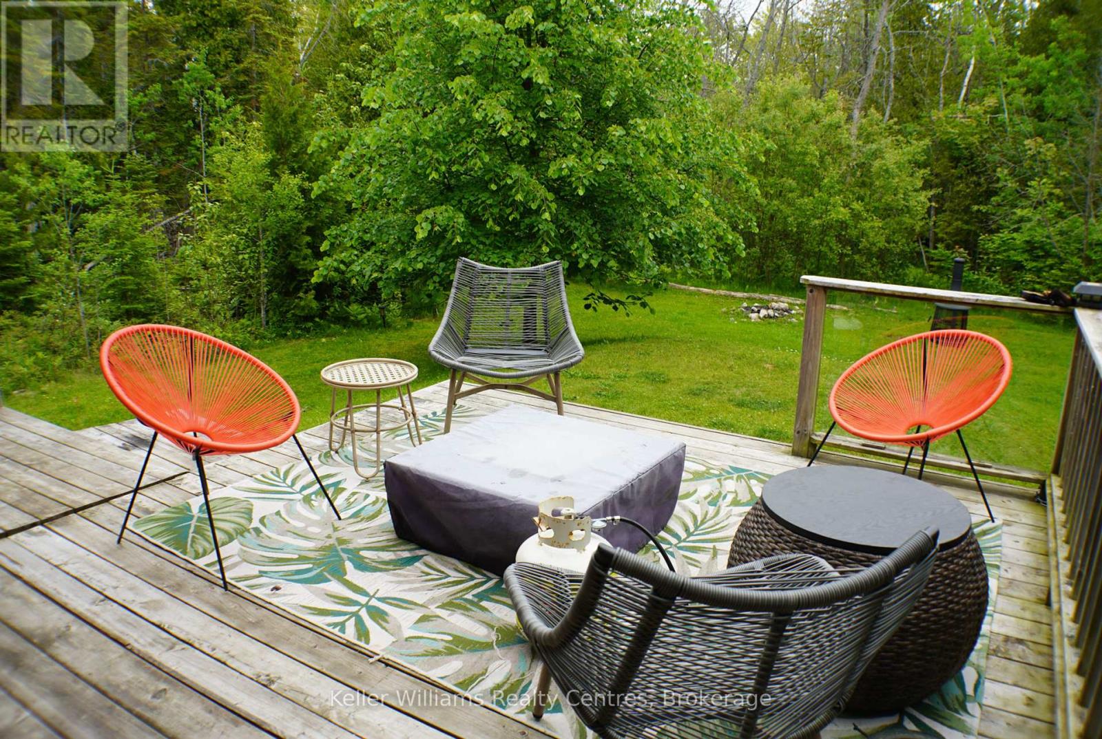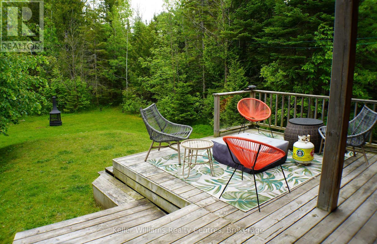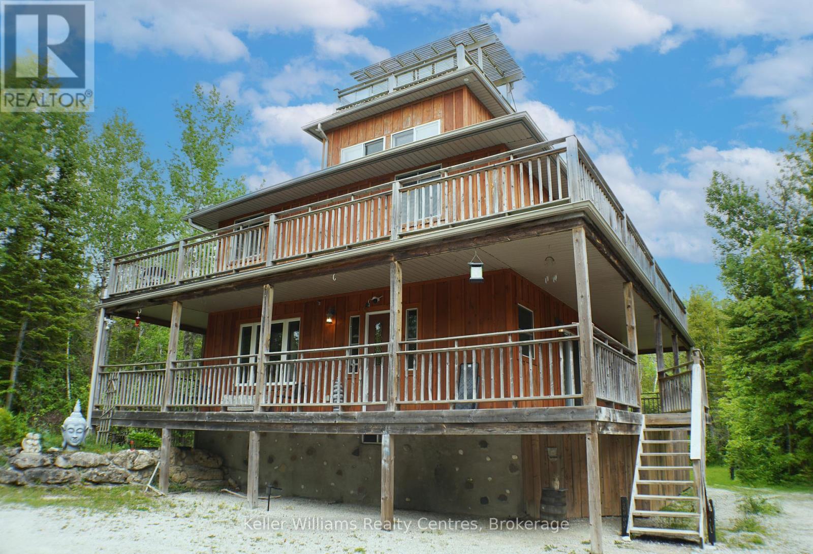 Custom-built in 2015, this exceptional three-level home blends modern design with rustic charm. Offering over 2,000 sq ft of wraparound decking, the property invites you to embrace stunning water views and serene sunsets. Engineered for year-round comfort, the home features R30 wall and R45 ceiling insulation, a new water system, as well as a high-efficiency propane furnace paired with a cozy fireplace. Step inside to discover an open-concept main floor that showcases striking oak and hemlock post-and-beam ceilings, a gorgeous hickory kitchen complete with a spacious island, and stylish laminate flooring throughout. Each level boasts convenient walkouts, providing private access to a treed oasis and multiple view points, including a top-floor deck designed for enjoying sweeping water vistas. Adding to its appeal is a bonus detached garage with a loft, which offers versatile usage. Whether you entertain guests, pursue hobbies, or explore its potential as an accessory dwelling unit, this feature enhances both your lifestyle options and the property's investment value. Situated near two water access points, you can easily swim, kayak, or launch your boat without the premium of a waterfront listing. Embrace the Bruce Peninsula lifestyle you've been waiting for while capitalizing on a great investment opportunity that promises both comfort and endless possibilities. (id:46441)