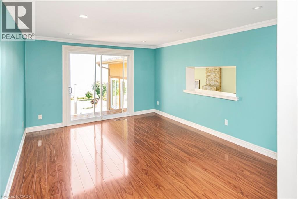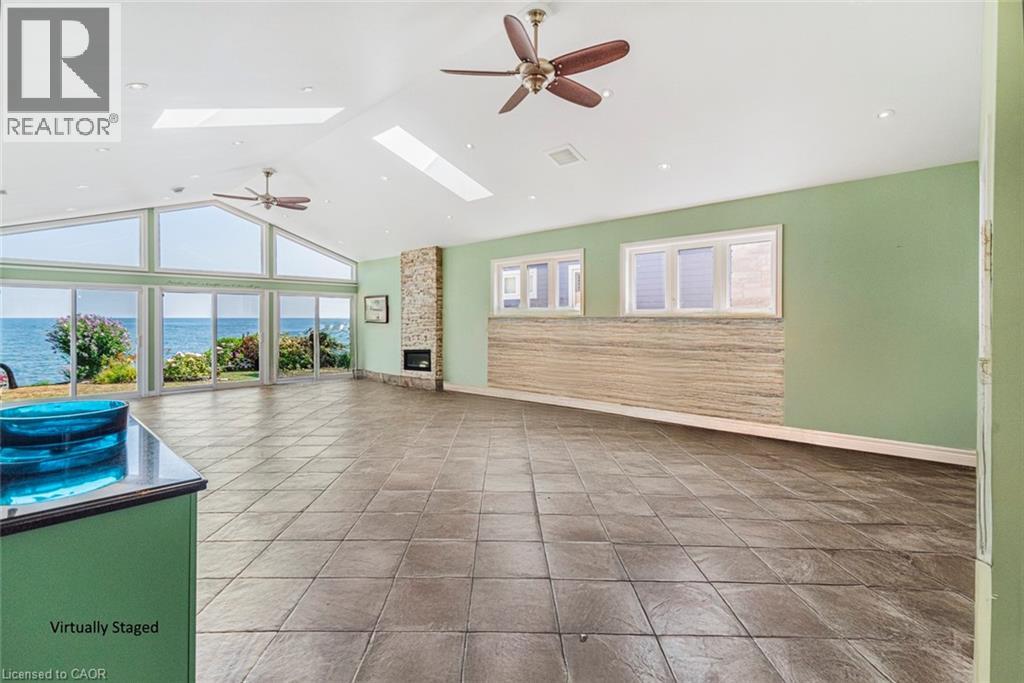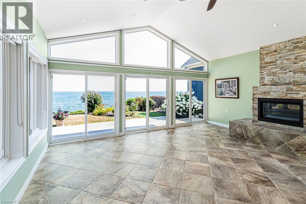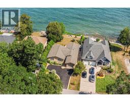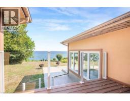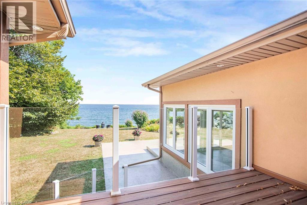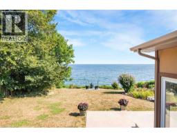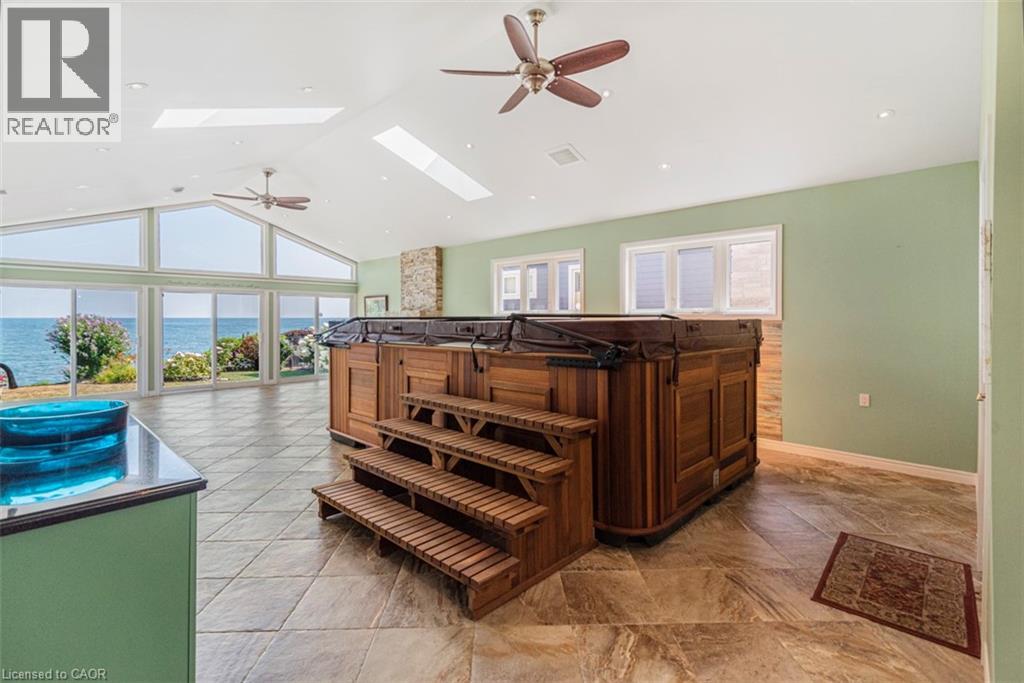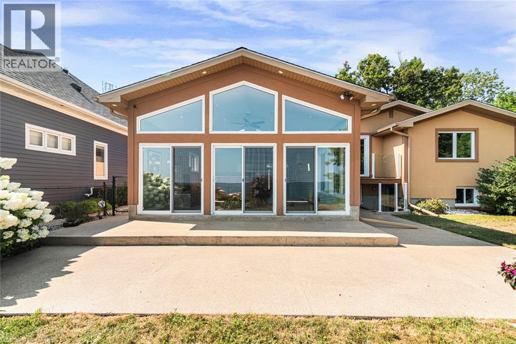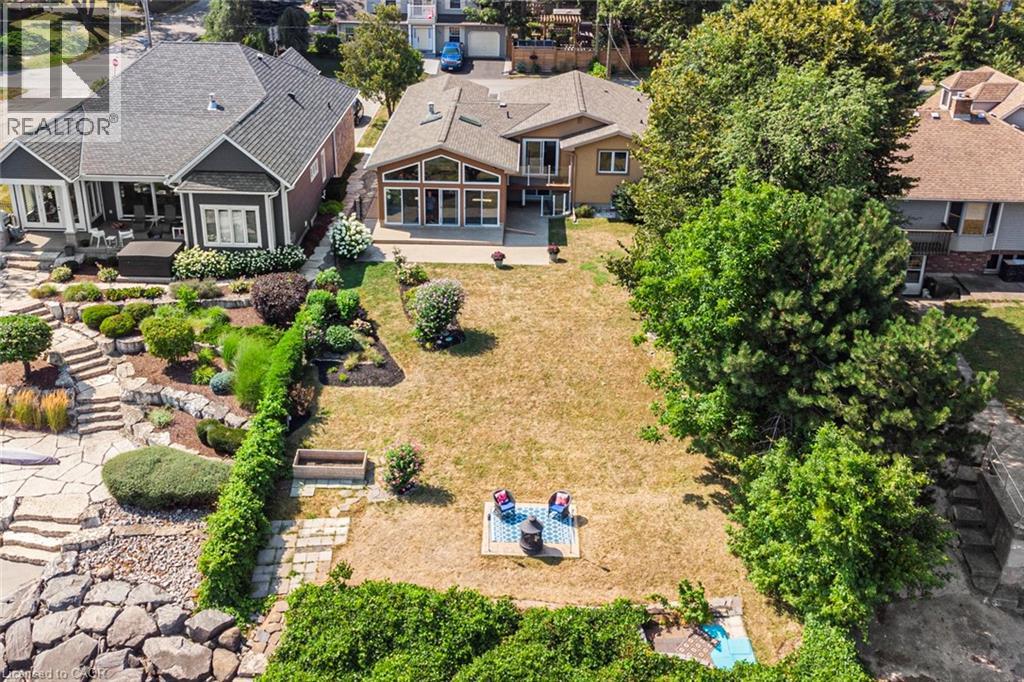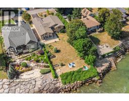 Welcome to 38 Lakeside Drive, Grimsby – a raised ranch-style home backing directly onto Lake Ontario. A 2013 addition created a spacious main-floor family room and an oversized single garage. The family room features floor-to-ceiling windows with lake views, a cathedral ceiling with 2 skylights and ceiling fans, a gas fireplace, wet bar, tile floors, and a built-in 14-foot, climate-controlled Arctic swim spa for year-round use. Sliding doors open to a Flex Stone patio (2022) and the deep backyard. The upper level has 2 bedrooms, a 4-piece bathroom with heated floors, linen closet, jetted tub, and a granite counter. The living room has crown moulding, pot lights, and sliding doors to a balcony with composite decking and glass railings overlooking the backyard and lake. The updated eat-in kitchen includes cherrywood cabinets, granite counters, breakfast bar, double sink, south-facing windows, pot lights, pull-out pantry, dining area with display cabinets, and upgraded stainless steel appliances including a gas range with double ovens, built-in microwave, and dishwasher. The lower level, also renovated in 2013, includes 2 additional bedrooms, a 4-piece bathroom with heated floors and linen closet, a rec room, and a large laundry/utility/storage room with cabinetry, shelving, and a second fridge. One bedroom has a walk-up to the backyard. Additional features include: 200 Amp hydro, central vacuum, irrigation system by Water World, Eufy wireless security system with 3 cameras, pot lighting at the front and rear with rear motion detector, leaf guards, oversized garage with inside entry, extra storage, automatic garage door opener with 2 remotes, and two storage sheds. A 10' x 10' sitting area with firepit overlooks the lake, and with Lake Ontario riparian rights, there is potential to add a deck or dock for more direct water access. Peace and privacy, yet close to shopping, parks, schools, and easy highway access. Swim spa can be removed by sellers if preferred. (id:46441)