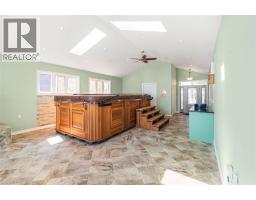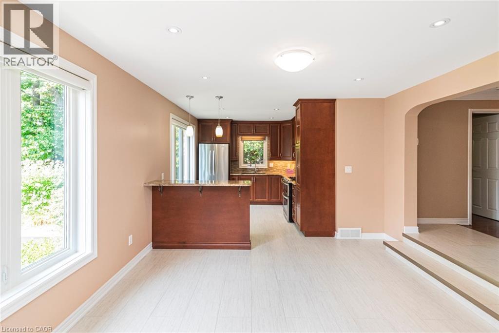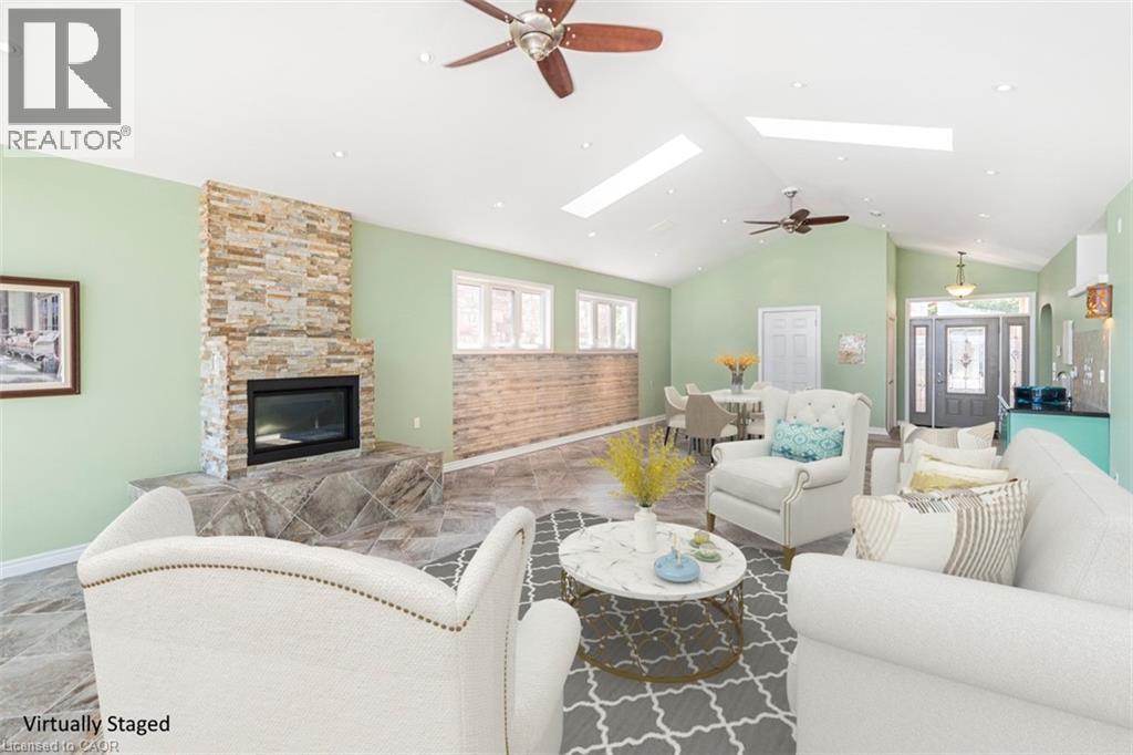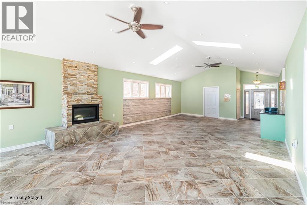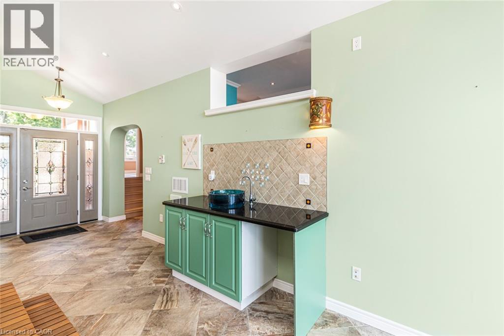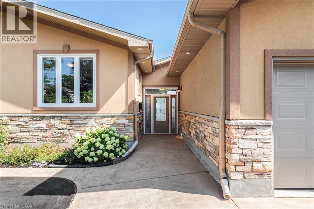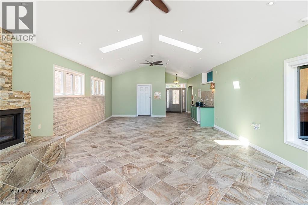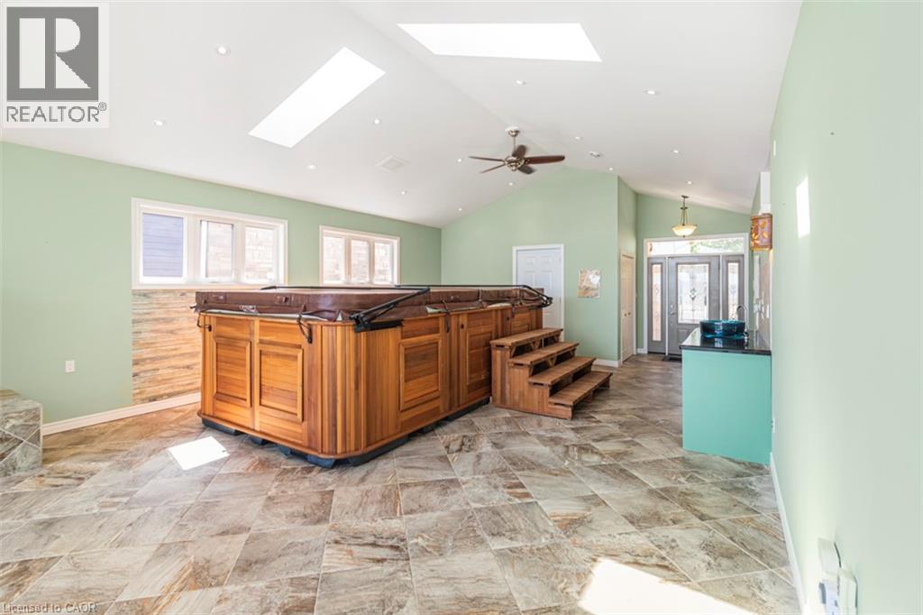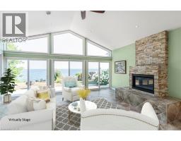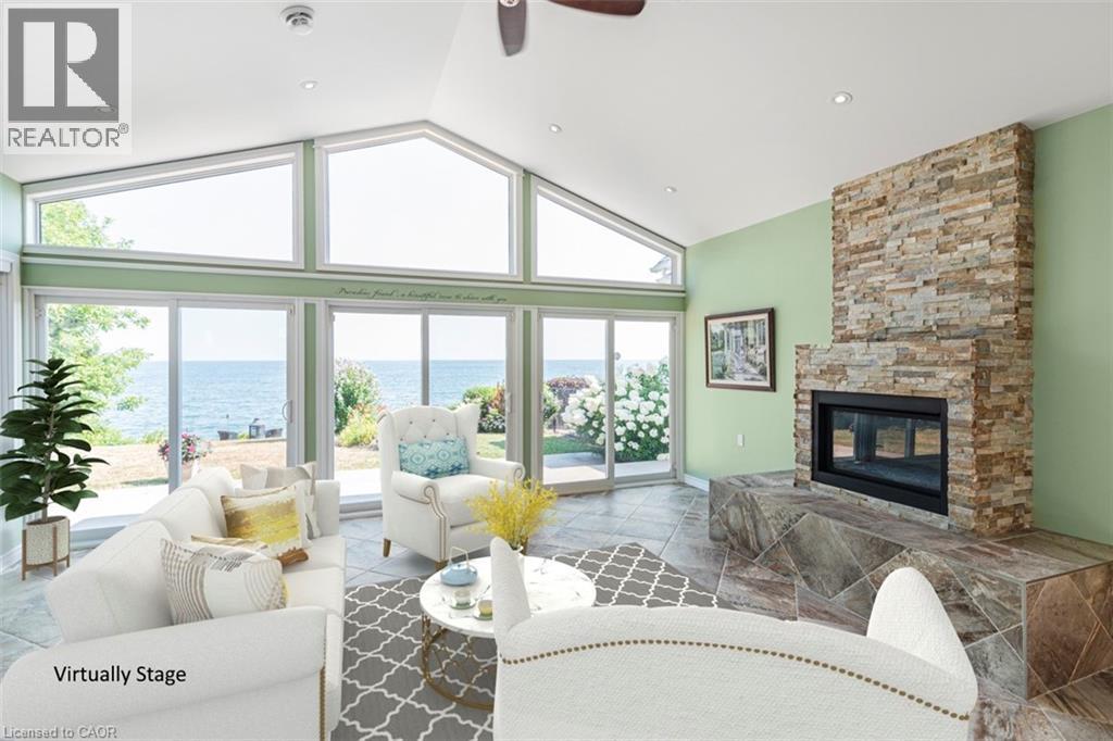 Welcome to 38 Lakeside Drive, Grimsby – a raised ranch-style home backing directly onto Lake Ontario. A 2013 addition created a spacious main-floor family room and an oversized single garage. The family room features floor-to-ceiling windows with lake views, a cathedral ceiling with 2 skylights and ceiling fans, a gas fireplace, wet bar, tile floors, and a built-in 14-foot, climate-controlled Arctic swim spa for year-round use. Sliding doors open to a Flex Stone patio (2022) and the deep backyard. The upper level has 2 bedrooms, a 4-piece bathroom with heated floors, linen closet, jetted tub, and a granite counter. The living room has crown moulding, pot lights, and sliding doors to a balcony with composite decking and glass railings overlooking the backyard and lake. The updated eat-in kitchen includes cherrywood cabinets, granite counters, breakfast bar, double sink, south-facing windows, pot lights, pull-out pantry, dining area with display cabinets, and upgraded stainless steel appliances including a gas range with double ovens, built-in microwave, and dishwasher. The lower level, also renovated in 2013, includes 2 additional bedrooms, a 4-piece bathroom with heated floors and linen closet, a rec room, and a large laundry/utility/storage room with cabinetry, shelving, and a second fridge. One bedroom has a walk-up to the backyard. Additional features include: 200 Amp hydro, central vacuum, irrigation system by Water World, Eufy wireless security system with 3 cameras, pot lighting at the front and rear with rear motion detector, leaf guards, oversized garage with inside entry, extra storage, automatic garage door opener with 2 remotes, and two storage sheds. A 10' x 10' sitting area with firepit overlooks the lake, and with Lake Ontario riparian rights, there is potential to add a deck or dock for more direct water access. Peace and privacy, yet close to shopping, parks, schools, and easy highway access. Swim spa can be removed by sellers if preferred. (id:46441)