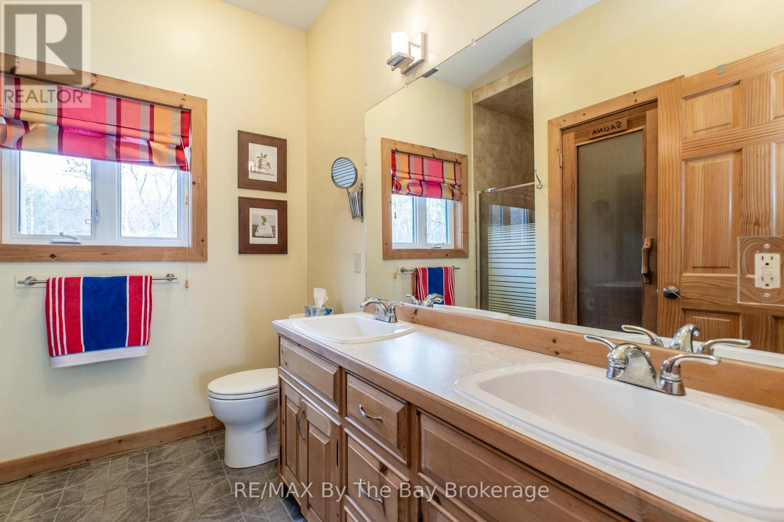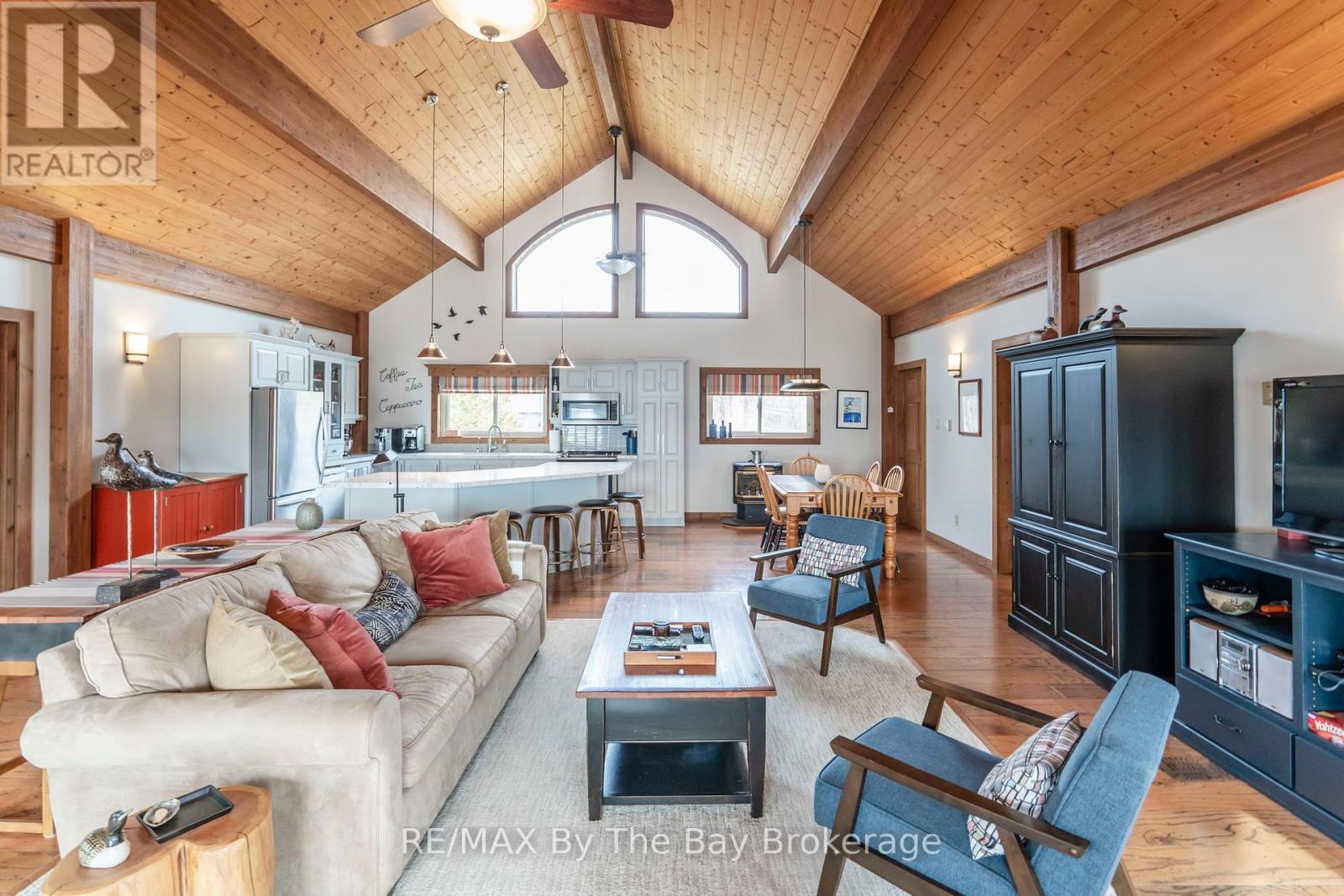 Wow what a view! You'll be amazed with the pristine views, privacy and all the creature comforts that come with this stunning four season cottage home on a massive west facing beachfront property complete with an oversized floating dock to deep water. The grounds are very walkable, flat granite plateaus for exploring and sports with a nice mix of indigenous trees and plants. The 4-bedroom fully furnished open concept fully appointed cottage has plenty of room for everyone with 2, 4 piece bathrooms and 1 powder room, laundry, wood and propane stoves for heating plus electric baseboard heat. There is a separate 2-bedroom guest cottage with porch, cozy living area and a 3 piece washroom. Out back there is a large garden and wood shed plus a very solid and weatherproof garage. The cottage is serviced by a whole house wired in Generac generator, and the 200 amp electrical service is supported by a roof mounted solar panel system which reduces energy costs by 2/3. This is a spectacular property and has been well loved by the current owners for many years before they moved to the west coast. (id:46441)
