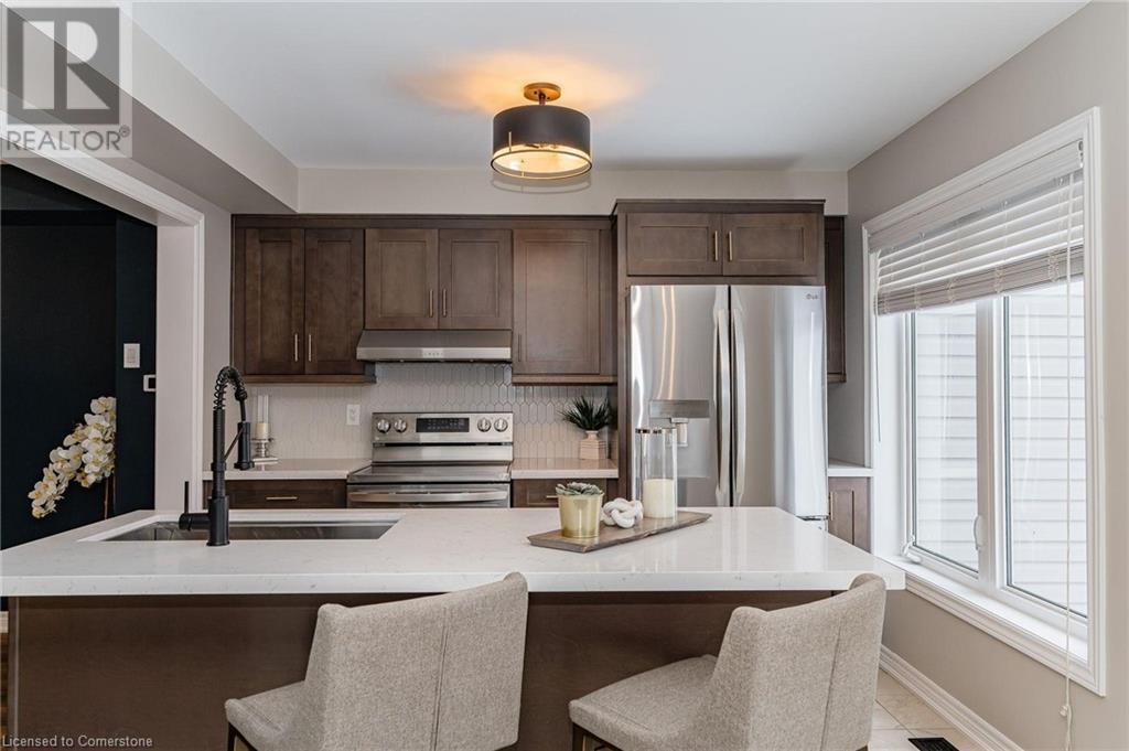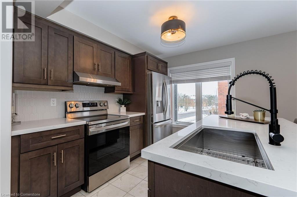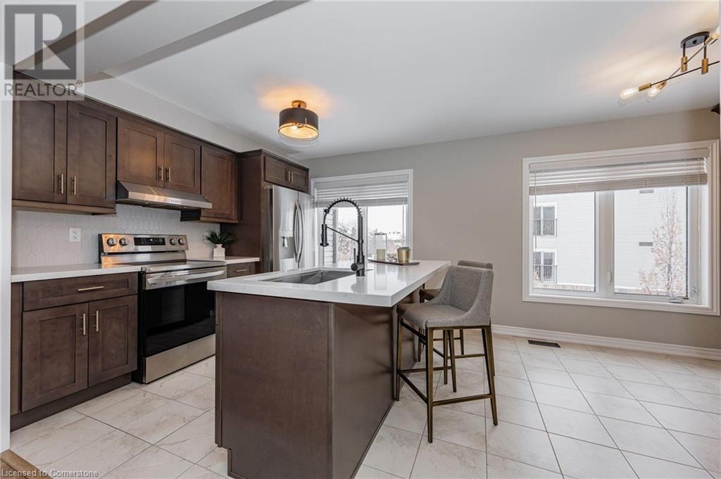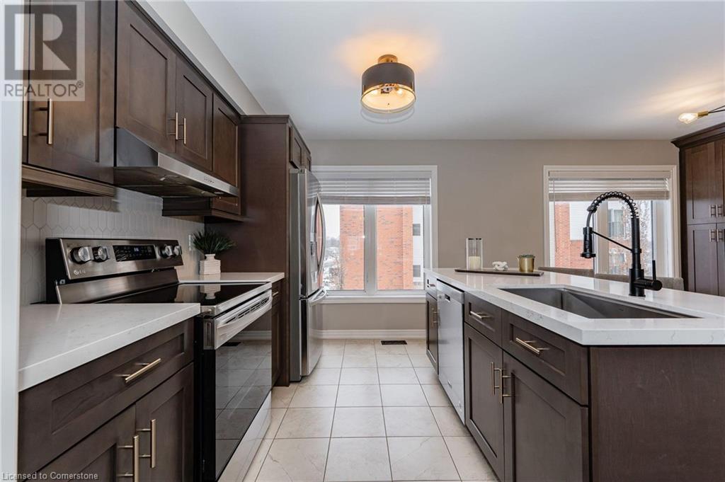 Welcome to 2-395 Linden Dr, a beautifully updated 3-bedroom townhouse in a newer complex, offering modern finishes, functional layout & prime location! Inside you'll discover a spacious & inviting living and dining area featuring luxury vinyl floors, elegant light fixtures & expansive windows that flood the space with natural light. The dining area comfortably accommodates a large table—ideal for hosting. The stunning newly renovated kitchen is a true highlight boasting sleek dark cabinetry with an added pantry, quartz counters & premium S/S appliances (2022), including 36” fridge. A large center island with bar seating provides the perfect spot for casual dining & entertaining. Stylish powder room with spacious vanity completes this level. Upstairs the expansive primary bedroom is a private retreat, featuring luxury vinyl floors, 2 large windows, ample closet space & spa-like ensuite with a modern vanity, subway-tiled backsplash & shower/tub combo. 2 generously sized additional bedrooms—also with luxury vinyl floors & large windows—share a stylish 4pc bathroom with modern vanity & shower/tub combo. The lower level offers a versatile additional space with sliding doors leading to the backyard, making it perfect for a home office, second living area or gym. This level also provides direct access to the attached garage for added convenience. Built in 2018 by Crystal Homes, this property is equipped with an HRV indoor air quality system, ensuring a comfortable & efficient living environment. Recent updates include new washer & dryer (2022), updated carpets on the stairs (2023), completely renovated kitchen, water softener (2022), fresh paint throughout, updated bathrooms & ceiling fans in 2 bedrooms. Enjoy the convenience of nearby amenities with Costco, restaurants, shops & more just minutes away. Families will appreciate being a short walk to Parkway Public School, John Erb Park & Ravine Park. Plus, with easy access to Highway 401, commuting is a breeze! (id:46441)
