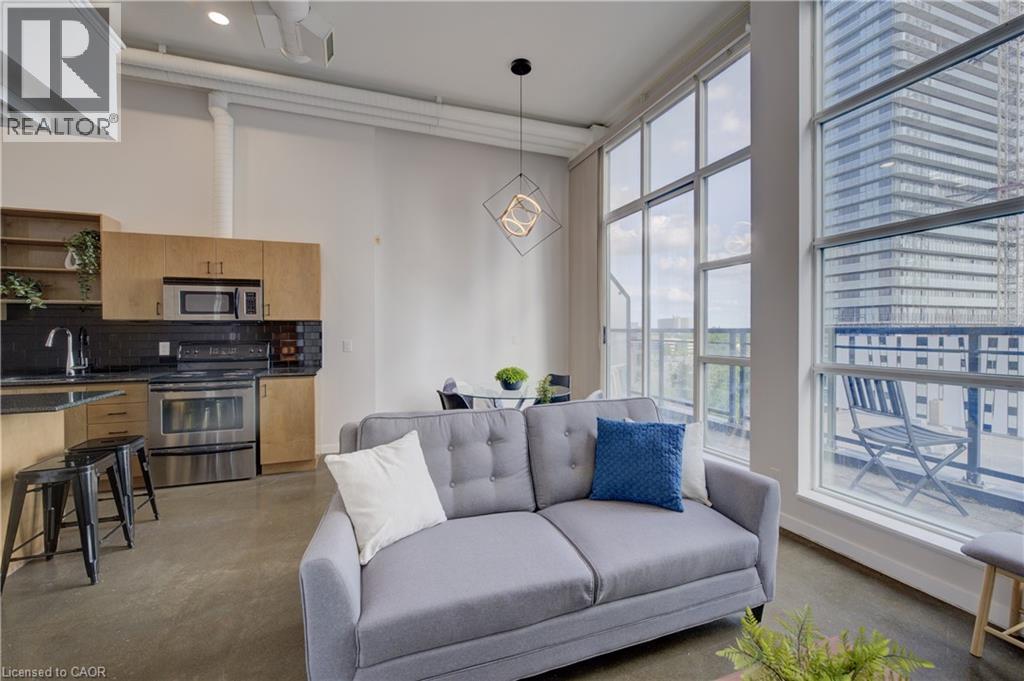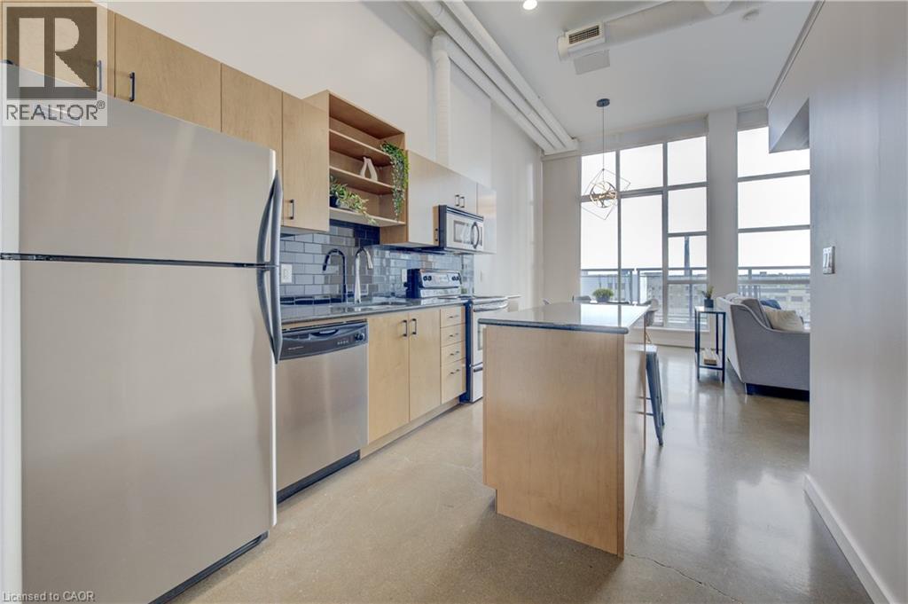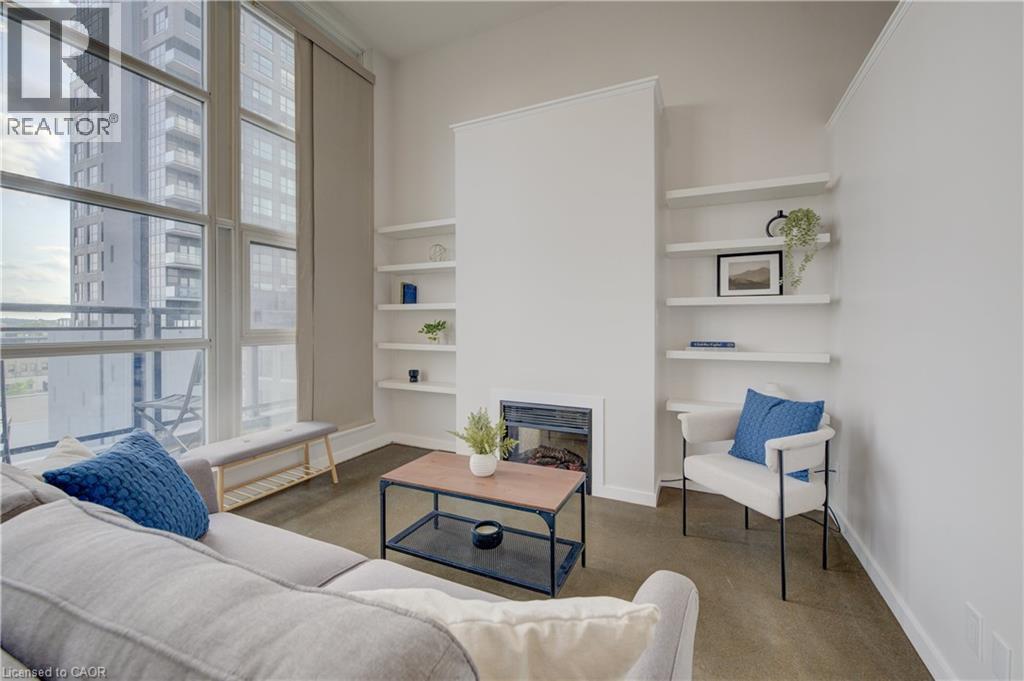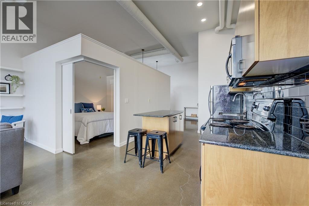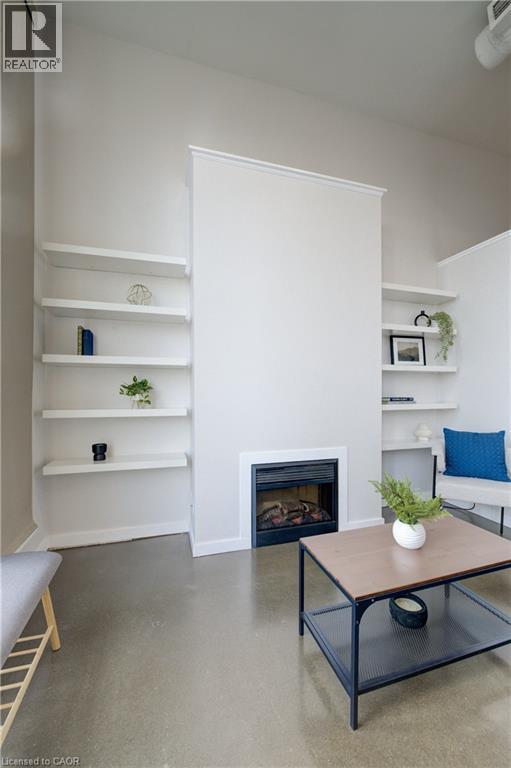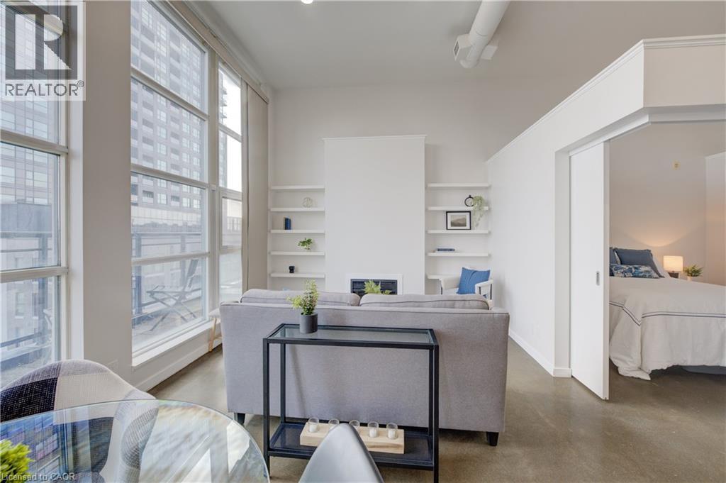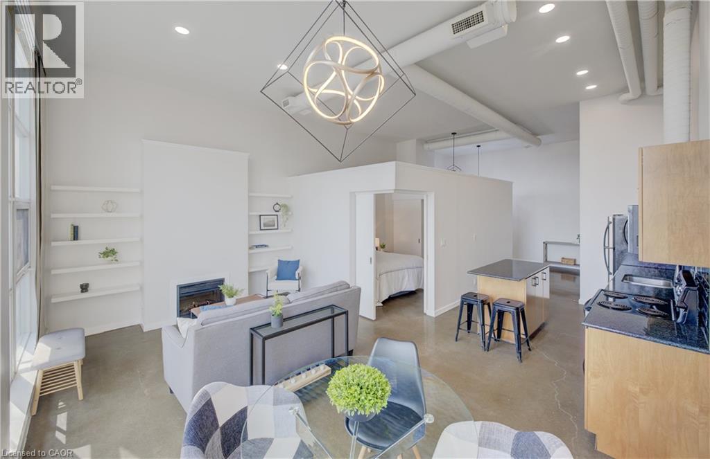 The epitome of a central DTK lifestyle the historic Kaufman Lofts at 404 King Street West, Kitchener, serve as a template for the dozens of condo developments that have followed in their footsteps over recent years, and still set an example that's very tough to beat today. Unit 524 presents a rarely-offered layout that maximizes every inch of this one-bedroom plus den, one-bathroom, 845 square-foot floorplan. A flood of south-western light, gleaming carpet-free polished concrete floors, towering 13-foot-plus ceilings, and a distinctly chic urban feel all help to characterize whats on abundant display here. Airy and open-concept, an extensive foyer leads visitors past the tidy four-piece washroom and into the den a sizeable, very flexible space which offers the chance for WFHers to enjoy a commute measured not in minutes, but seconds. Hang a left, and take in a stylish kitchen that provides plenty of prep space, taking special note of the gleaming granite countertops and island, as well as all that pot-lighting way above your head. An open living/dining space features plenty of built-in shelving on either side of the cozy electric fireplace (great for our colder months), plus a direct walkout to an exclusive and very long balcony five stories above Waterloo Regions primary artery of King Street. The private primary bedroom is your retreat, and boasts a generously proportioned walk-in closet of its own. With the LRT quite literally a stones throw from your unit, the forthcoming regional transit hub right around the corner, and dozens of prominent offices (including Google), retailers, restaurants, and civic amenities only a few minutes away by foot, its not hard to see why the DTK lifestyle appeals to so many. (id:46441)