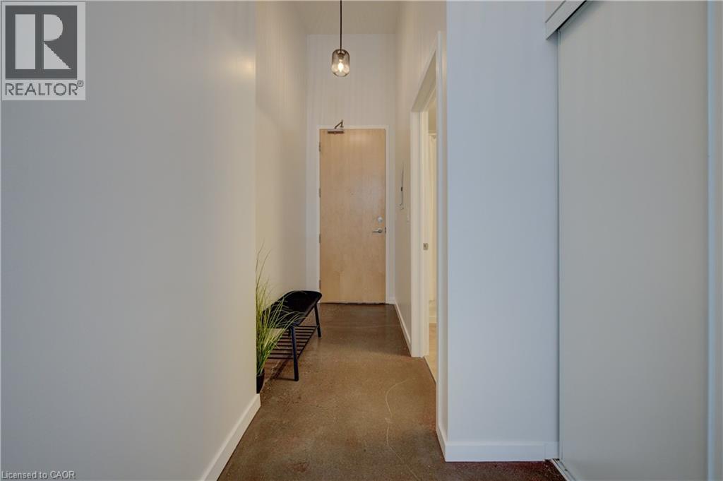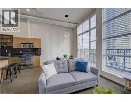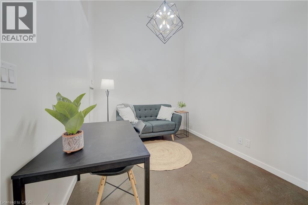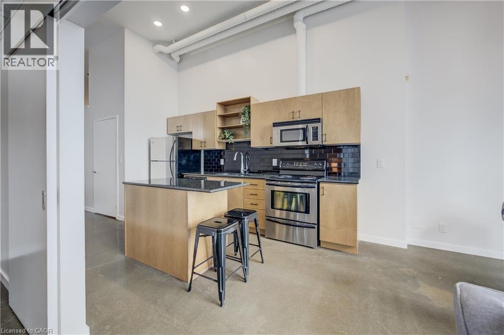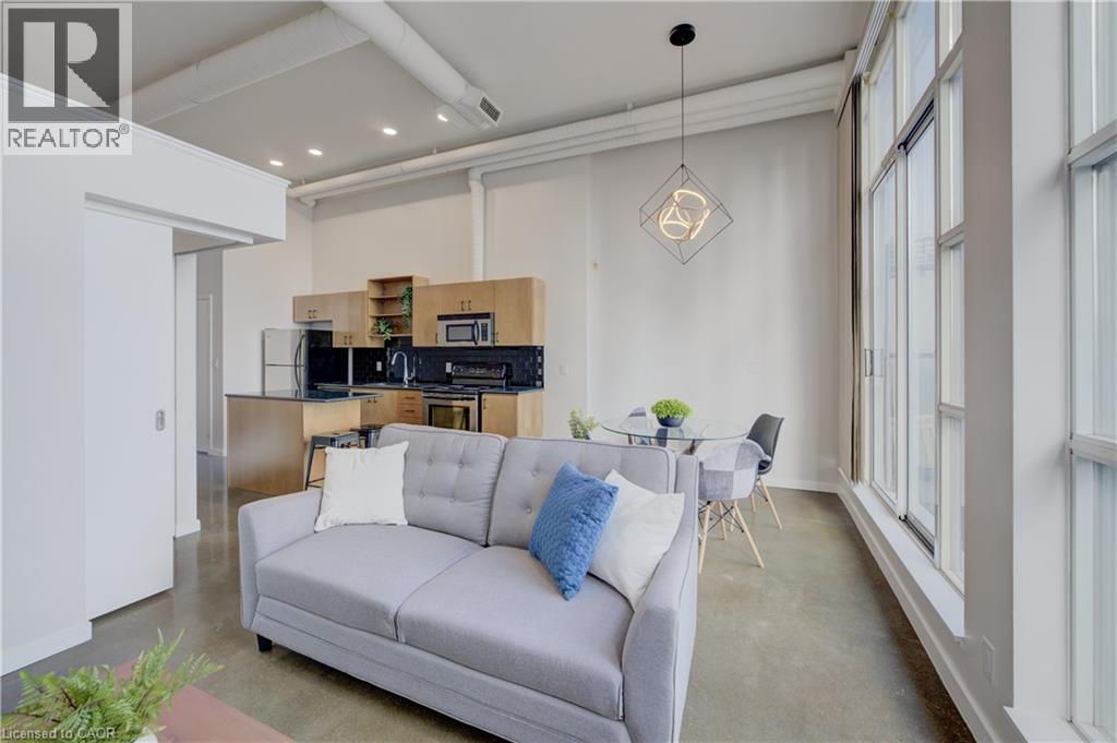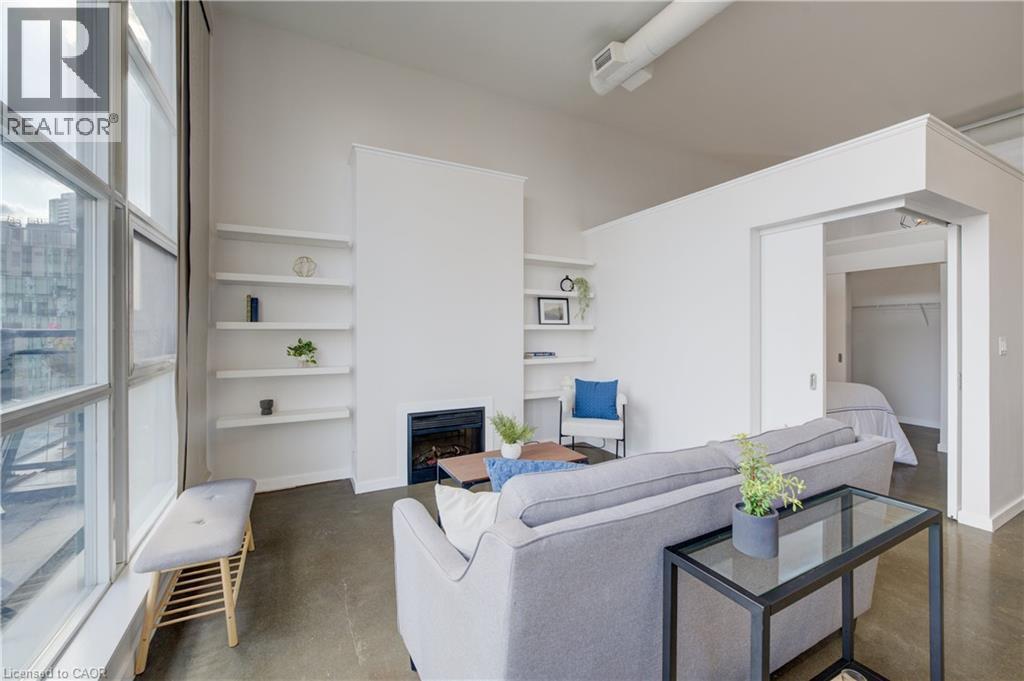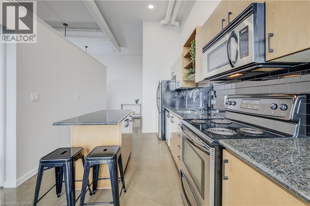 The epitome of a central DTK lifestyle the historic Kaufman Lofts at 404 King Street West, Kitchener, serve as a template for the dozens of condo developments that have followed in their footsteps over recent years, and still set an example that's very tough to beat today. Unit 524 presents a rarely-offered layout that maximizes every inch of this one-bedroom plus den, one-bathroom, 845 square-foot floorplan. A flood of south-western light, gleaming carpet-free polished concrete floors, towering 13-foot-plus ceilings, and a distinctly chic urban feel all help to characterize whats on abundant display here. Airy and open-concept, an extensive foyer leads visitors past the tidy four-piece washroom and into the den a sizeable, very flexible space which offers the chance for WFHers to enjoy a commute measured not in minutes, but seconds. Hang a left, and take in a stylish kitchen that provides plenty of prep space, taking special note of the gleaming granite countertops and island, as well as all that pot-lighting way above your head. An open living/dining space features plenty of built-in shelving on either side of the cozy electric fireplace (great for our colder months), plus a direct walkout to an exclusive and very long balcony five stories above Waterloo Regions primary artery of King Street. The private primary bedroom is your retreat, and boasts a generously proportioned walk-in closet of its own. With the LRT quite literally a stones throw from your unit, the forthcoming regional transit hub right around the corner, and dozens of prominent offices (including Google), retailers, restaurants, and civic amenities only a few minutes away by foot, its not hard to see why the DTK lifestyle appeals to so many. (id:46441)