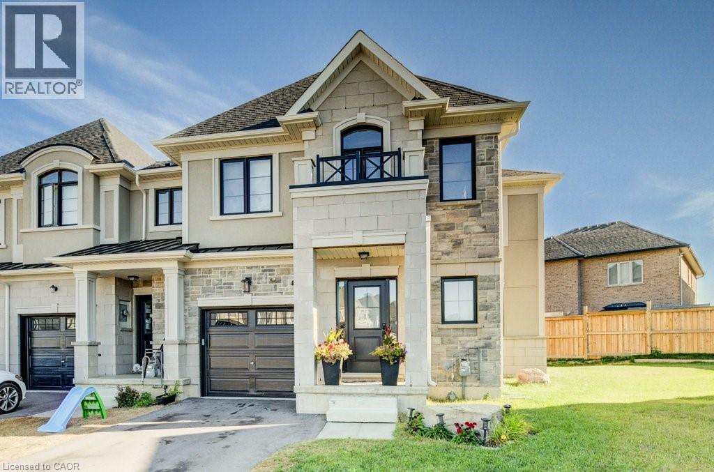 Beautiful end unit freehold townhome, new in 2024, NO condo fees. Custom townhome on extra large pie shape lot in Stonegate Community. Features magnificent stone and stucco architecture with beautiful front elevation with covered porch and faux balcony. Interior features soaring 9 foot ceilings on main level. Custom end unit floor plan with extra windows and bump out on all 3 levels for extra square footage made possible by wide and private pie shape lot. Open concept kitchen, large living room, chef's kitchen with cabints made wider and deeper for larger fridge, taller uppers cabinets, lower pots & pans drawers, peninsula with breakfast bar, Quorastone quartz countertops. This home is carpet free with beauiful and durable,modern vinyl plank floors. Bright upper level features 3 spacious bedrooms with larger windows, including primary bedroom with ensuite bath, walk-in closet plus bonus loft/office area. New owners get balance of Ontario New Home Warranty. Large basement with endless possibilites including rough-in extra bathroom plumbing and energy efficient features. Don't miss this fantastic home. (id:46441)