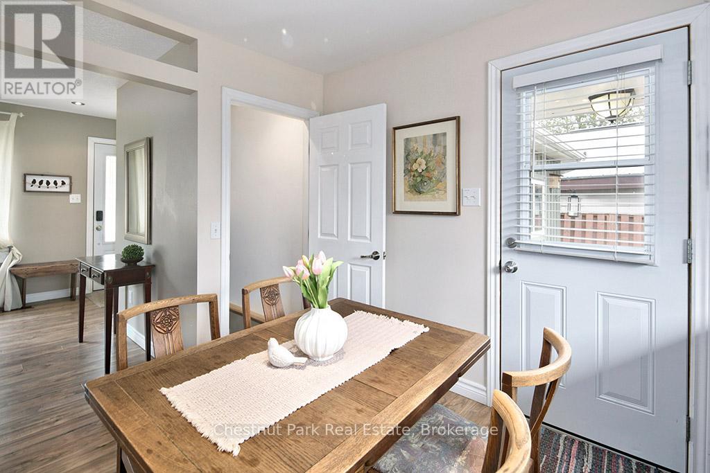 This charming and well maintained bungalow with oversized garage, offering ample room for a workshop area, provides inspirational living on a spectacular half acre ravine lot with towering trees and a meandering stream below. The property also boasts glimpses of Georgian Bay from the front lawn, while an unopened road allowance along the west boundary adds extra privacy. Inside, the residence is bright and spotless, featuring a practical 2+1 bedroom, 2-bath layout. The open, inviting design is "cute as a button," with excellent livability across two finished levels. Each floor offers walk-outs to the park-like backyard, with ample perennials and room to explore! The main floor includes an updated eat-in kitchen with Woodcrest cabinetry, opening to a spacious deck and BBQ area ideal for entertaining. A cozy living room, a primary bedroom overlooking greenspace, a modern 4-piece bathroom, and a versatile second bedroom or den complete this level. The finished lower level has a welcoming sitting nook, third bedroom, 3-piece bathroom, and tidy laundry room. There's also a comfortable recreation room with an oversized window framing peaceful ravine views, perfect for relaxation and family activities. Since 2013, the home has seen numerous updates: kitchen, bathrooms, most windows, and laminate flooring. Other features include a F/Air N/Gas furnace and hot water tank (2015), 2-Ton C/Air (2020), refurbished patio area with landscaping boulders, partially rebuilt deck, and a well-lit car-and-a-half garage addition (2016) with a concrete floor and 2 man doors. The property is near Kelso Beach Park, waterfront trails, St. Julian's Park, Keppel-Sarawak Elementary School, and many city amenities, offering recreation and convenience. This rare gem provides seamless indoor-outdoor living, blending nature, beauty, and comfort in one special place. (id:46441)