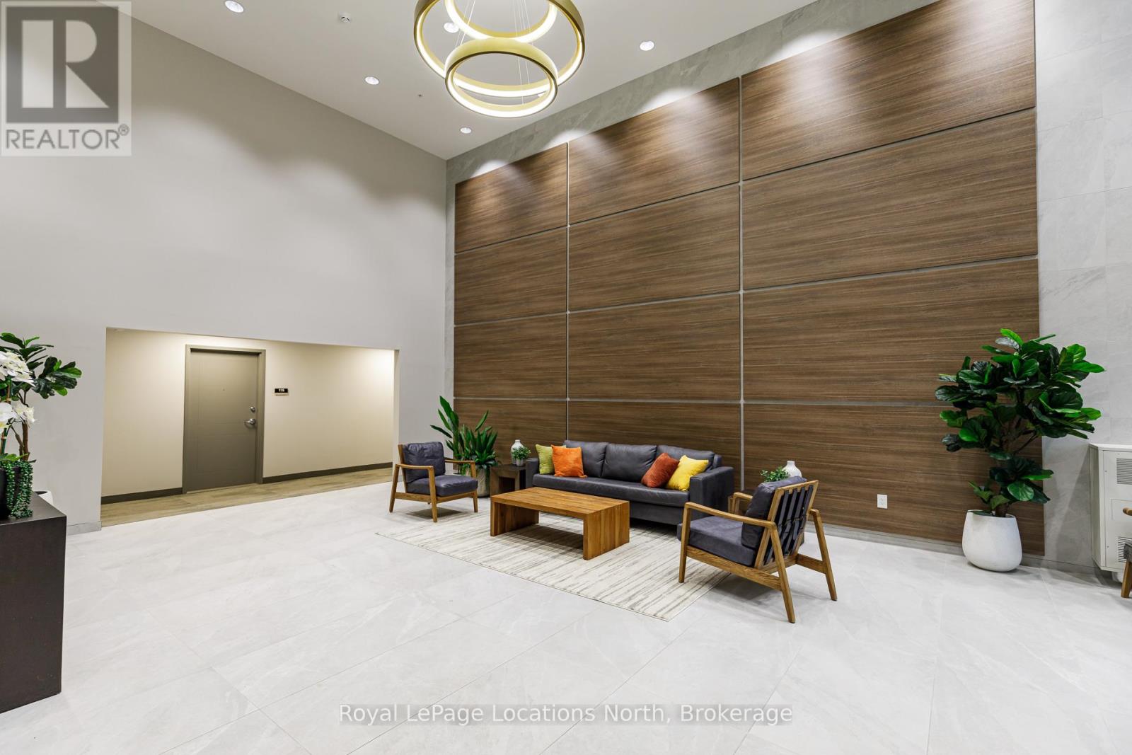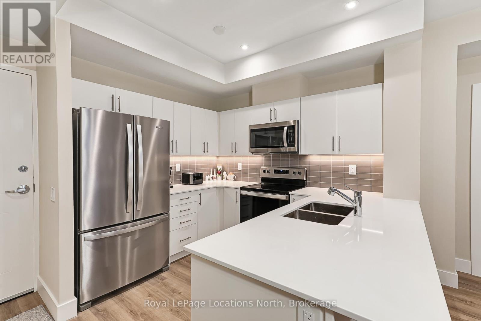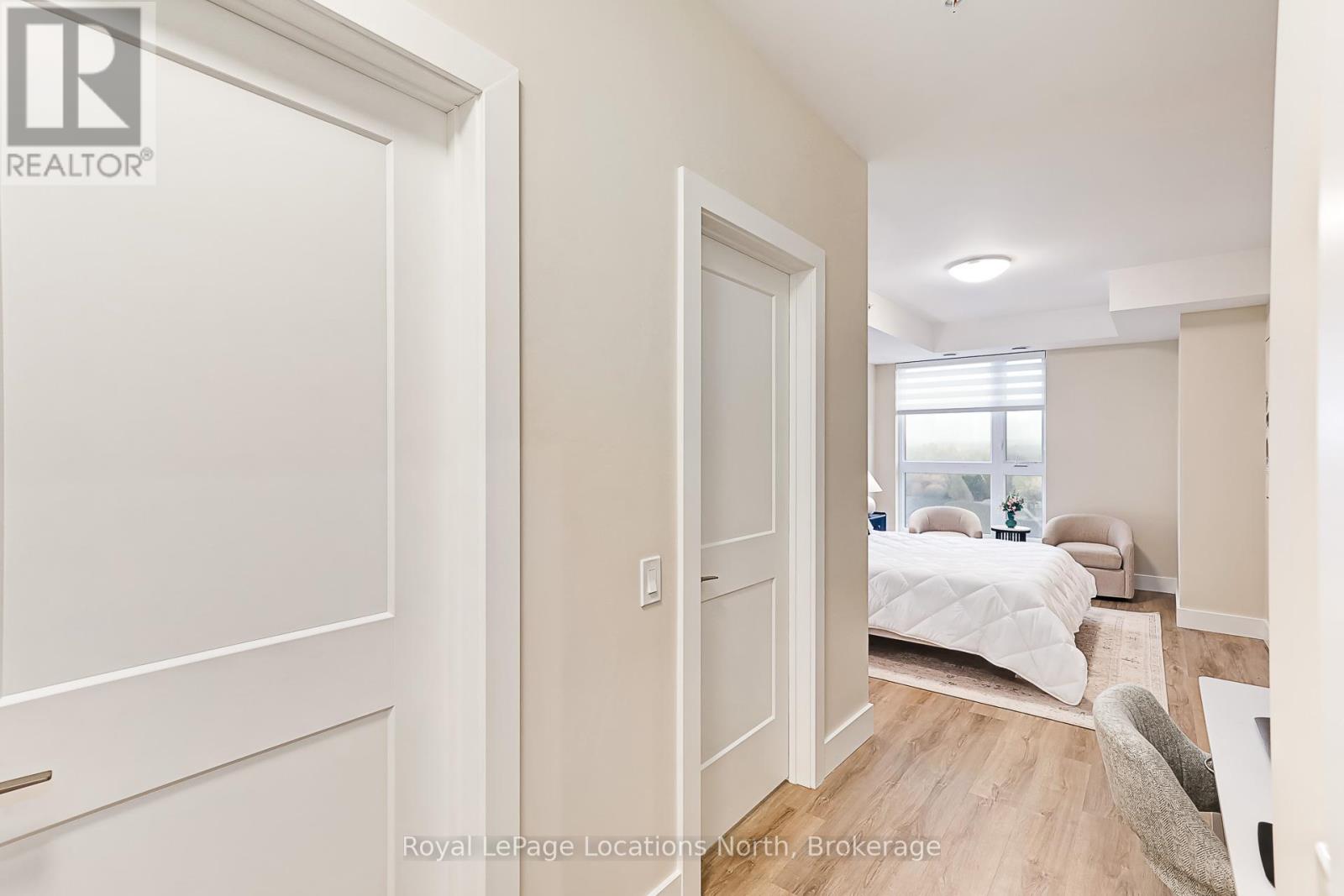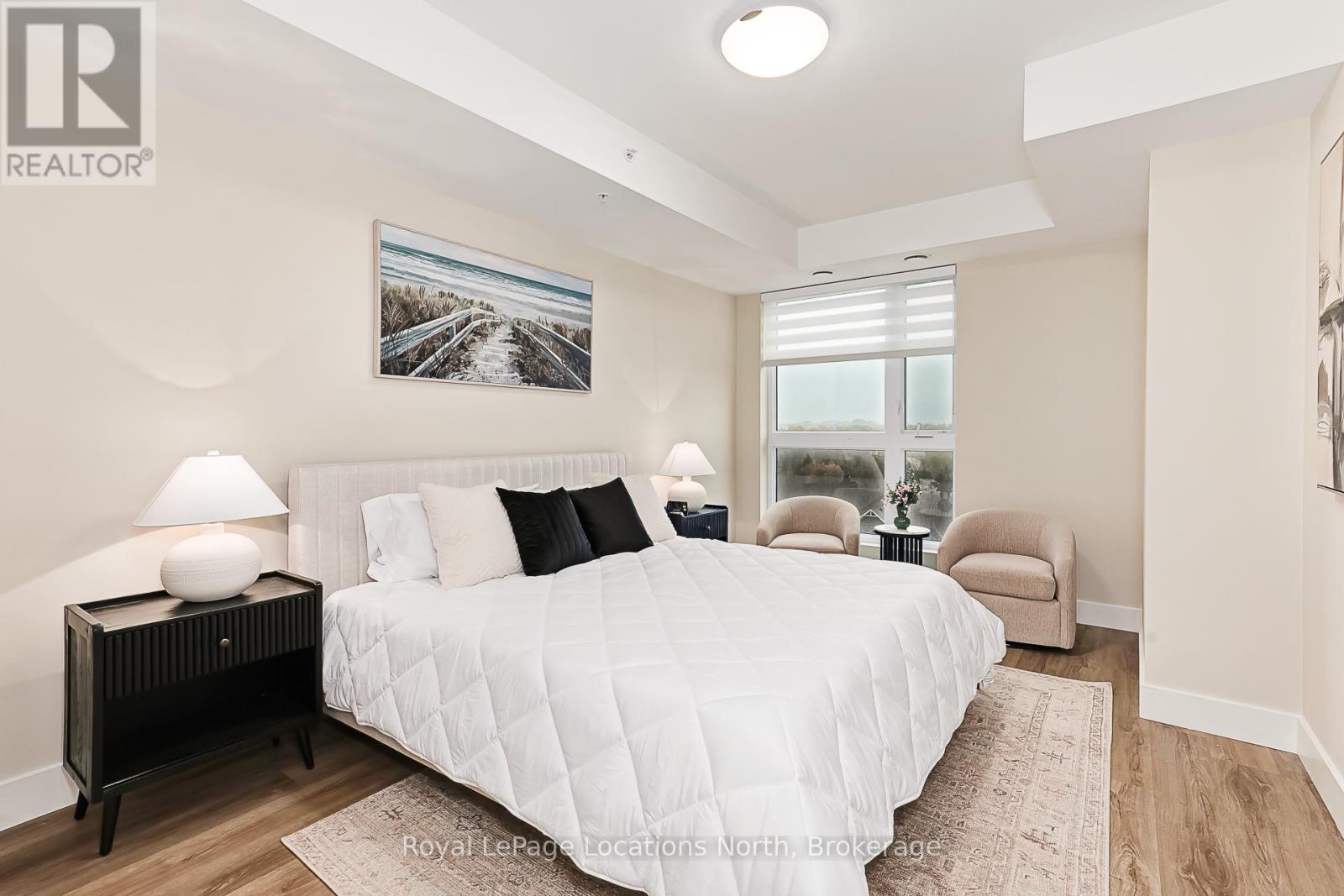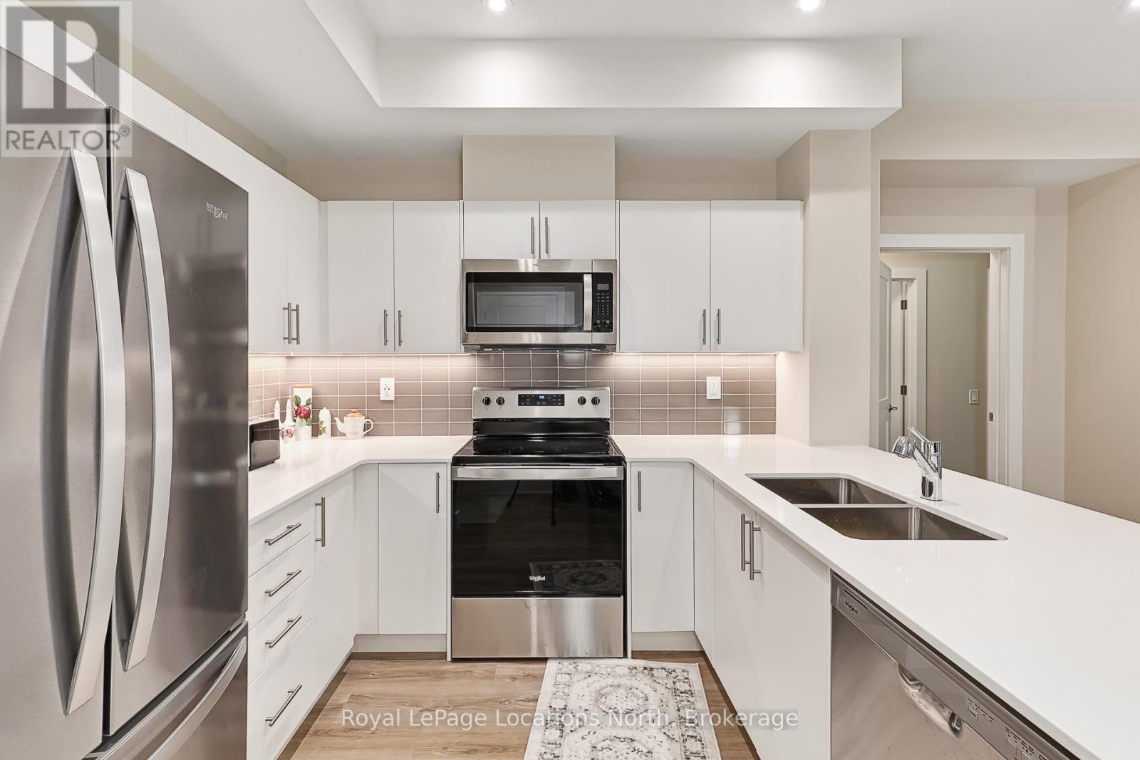 Welcome to Royal Windsor, one of Collingwood's most sought-after condo communities - where modern luxury meets active, carefree living. This spacious 2-bedroom + den suite offers breathtaking west-facing views of Blue Mountain and a thoughtfully designed, open-concept layout perfect for both relaxing and entertaining. The bright, contemporary kitchen features stainless steel appliances, quartz countertops, soft-close cabinetry and elegant pot lighting. The inviting living room opens to a large private patio - ideal for taking in sunset mountain views. The primary suite is a true retreat, featuring two walk-in closets and a 5-piece wheelchair-accessible ensuite, offering both comfort and sophistication. Remote blinds, luxury vinyl plank flooring and a neutral palette add to the refined atmosphere. An assigned underground parking space is included with this state-of-the-art condo, designed with convenience and lifestyle in mind. At Royal Windsor, residents enjoy a community built on wellness and connection. Amenities include a rooftop terrace with panoramic views of Blue Mountain, a party room and access to Balmoral Village's clubhouse, complete with a pool, fitness studio, games room and more. Experience maintenance-free living in an exceptional location close to downtown Collingwood, golf, trails, Georgian Bay and Blue Mountain. This is more than a condo - it's a lifestyle. (id:46441)