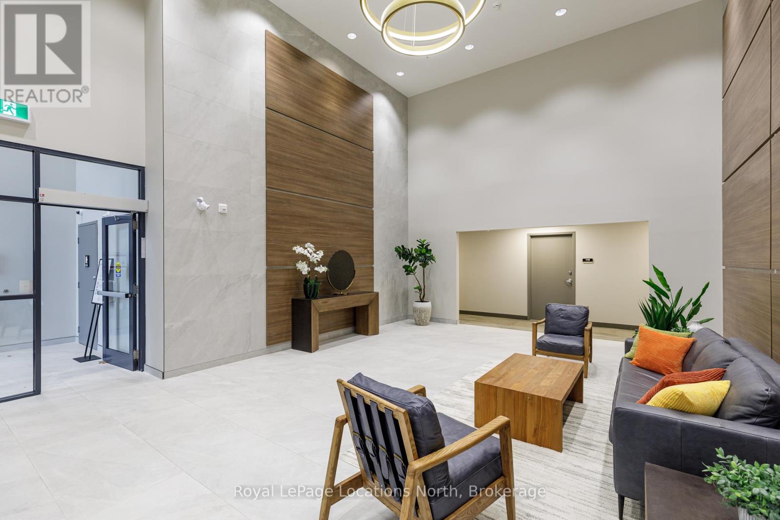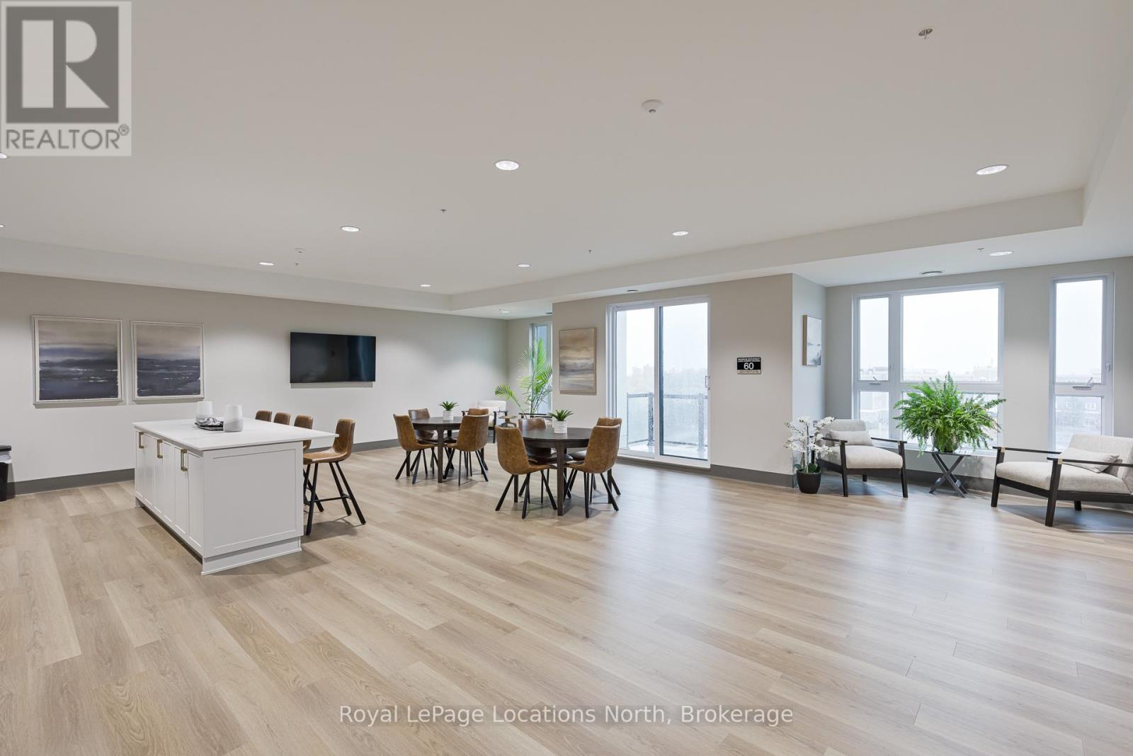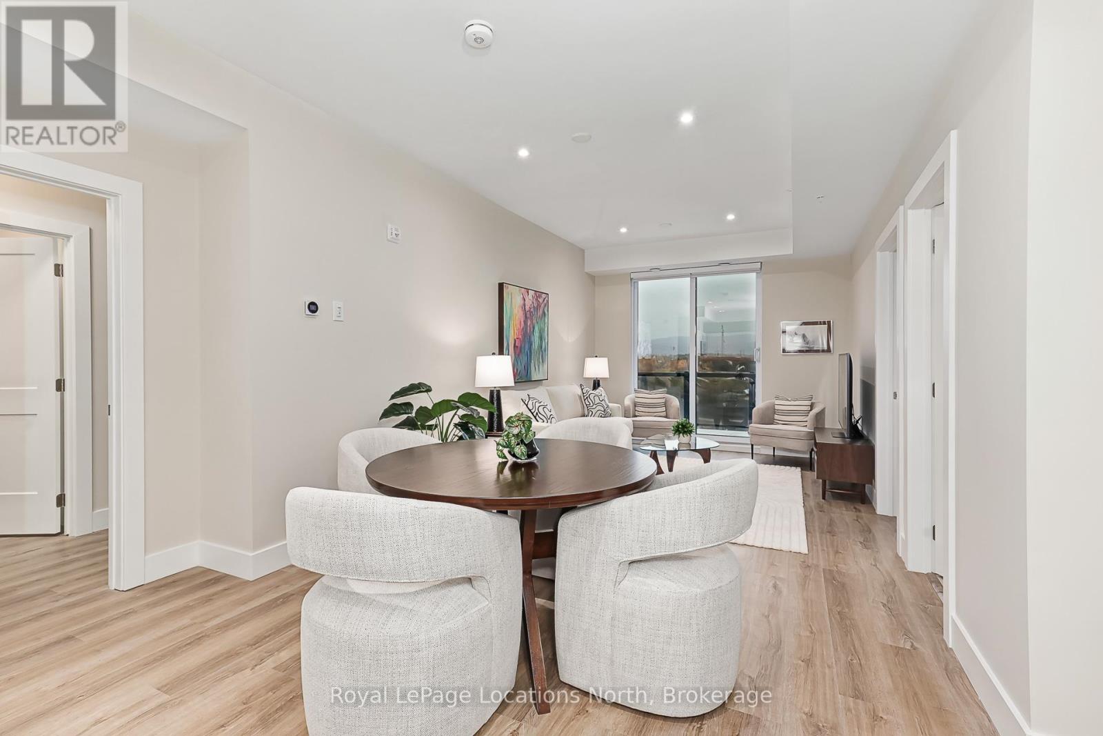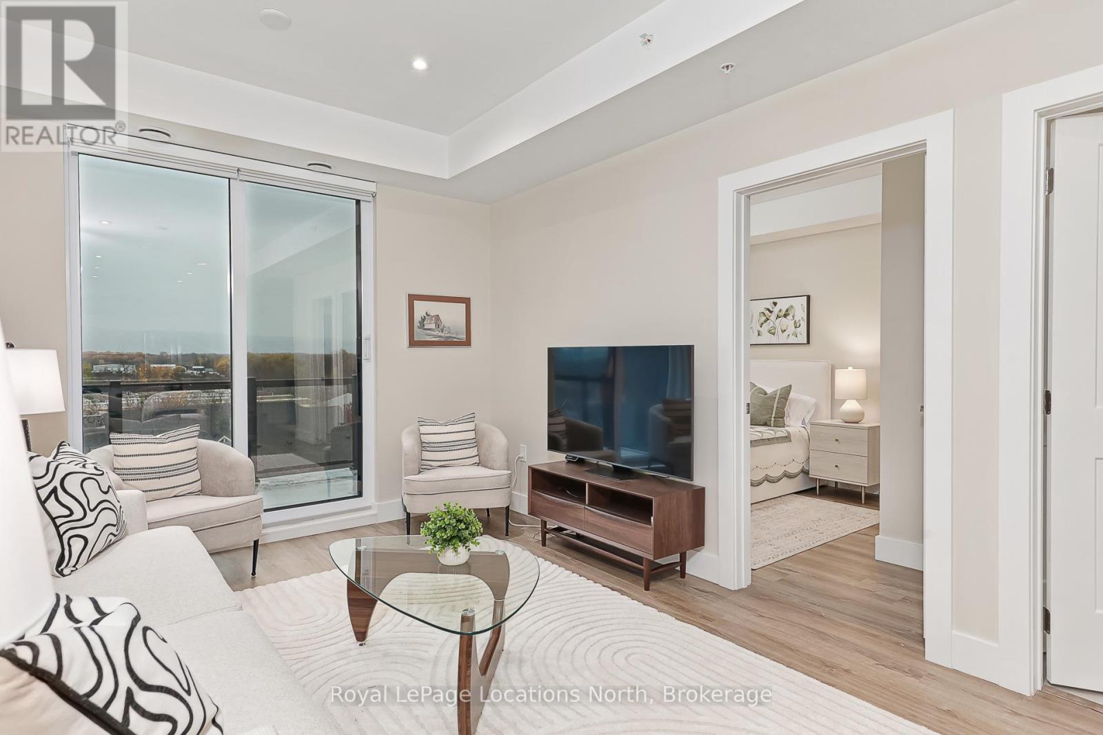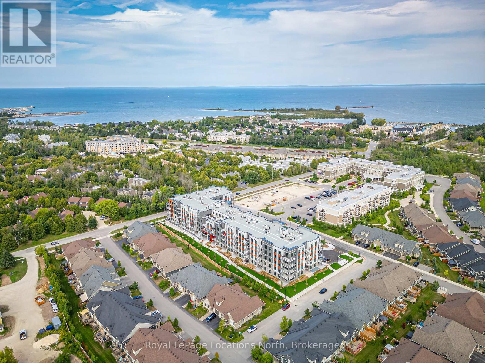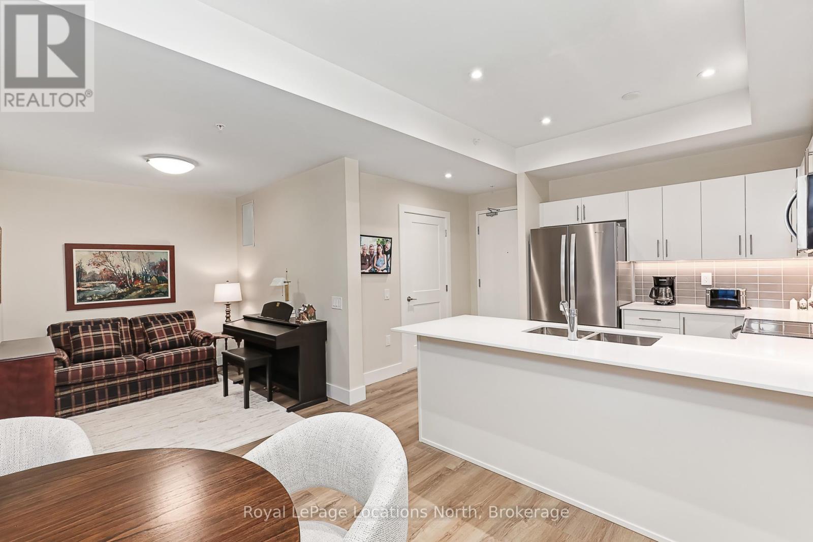 Welcome to Royal Windsor, one of Collingwood's most sought-after condo communities - where modern luxury meets active, carefree living. This spacious 2-bedroom + den suite offers breathtaking west-facing views of Blue Mountain and a thoughtfully designed, open-concept layout perfect for both relaxing and entertaining. The bright, contemporary kitchen features stainless steel appliances, quartz countertops, soft-close cabinetry and elegant pot lighting. The inviting living room opens to a large private patio - ideal for taking in sunset mountain views. The primary suite is a true retreat, featuring two walk-in closets and a 5-piece wheelchair-accessible ensuite, offering both comfort and sophistication. Remote blinds, luxury vinyl plank flooring and a neutral palette add to the refined atmosphere. An assigned underground parking space is included with this state-of-the-art condo, designed with convenience and lifestyle in mind. At Royal Windsor, residents enjoy a community built on wellness and connection. Amenities include a rooftop terrace with panoramic views of Blue Mountain, a party room and access to Balmoral Village's clubhouse, complete with a pool, fitness studio, games room and more. Experience maintenance-free living in an exceptional location close to downtown Collingwood, golf, trails, Georgian Bay and Blue Mountain. This is more than a condo - it's a lifestyle. (id:46441)