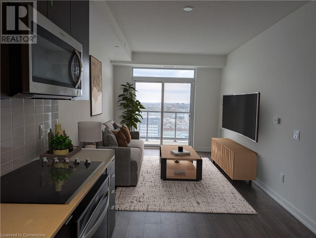 Stylish 1-Bedroom Condo with Stunning City Views in the Heart of Downtown Kitchener – Young Condos Welcome to urban living at its finest! This modern 1-bedroom, 1-bathroom condo is perched on the 21st floor of the highly sought-after Young Condos, offering unparalleled views of the Kitchener skyline and a vibrant lifestyle right at your doorstep. Step inside to discover a bright, open-concept layout flooded with natural light. The sleek kitchen features quartz countertops, stainless steel appliances, built-in cabinetry, and ample counter space—perfect for cooking and entertaining. Enjoy the convenience of in-suite laundry and contemporary finishes throughout. Located in the heart of downtown, you're just steps from restaurants, shopping, museums, bars, entertainment, the library, public transit, and the LRT. Everything you need is right outside your door. Young Condos offers a suite of top-tier amenities, including: 24-hour concierge Fully equipped fitness center Party room for hosting 5th-floor outdoor terrace with BBQs and community seating Rooftop running track On-site dog park Whether you're a young professional, first-time buyer, or savvy investor, this unit offers the perfect mix of location, comfort, and style. Don’t miss your chance to own in one of Kitchener’s most desirable downtown buildings. (id:46441)