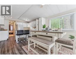 WELCOME HOME to this absolutely charming, sun drenched open concept, 2 bedroom home located in the sought after Green Acres Community. This beautiful community offers a 10 month seasonal accommodation. It is perfect for the first time home buyers saving up for their first home or the Snowbirds looking to jet away in the months of January/February. This bright and welcoming unit is absolutely MOVE-IN-READY and waiting for its next new owners to enjoy this oasis with little maintenance upkeep. The windows surrounding the dining room, makes it very inviting for Hosting family celebrations through out the year. The kitchen offers tons of cupboard space with white cabinetry and light through out. The cozy living room with propane fireplace is the perfect place to cuddle up and read a book or watch a movie! The large primary bedroom at the back offers the privacy that you desire. The other bedroom is a fantastic size. The updated 3 pc bath allows you to decompress after a long day. The sun room area can be used as an additional sitting area, or storage as a mud room. This unit offers an newer furnace (2023). There is ample parking for 2 vehicles and a generously sized side yard where you can enjoy your summer and fall nights sitting by the fire or lounge under the gazebo drinking your morning coffee and enjoy the morning sun. There is also a large garden shed for all your additional storage needs. This terrific starter home is located close to the city in a beautiful, friendly park that is a clean, well maintained, and well managed that offers 10 months of enjoyment. It includes a pool, hot tub, recreational hall, picnic areas, playground, mini golf and many fun activities & events to enjoy throughout the seasons. Located just minutes to St. Jacob's Farmer's Market, North Waterloo and all the amenities it has to offer just a short drive away. (id:46441)