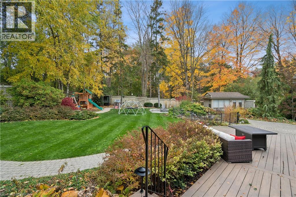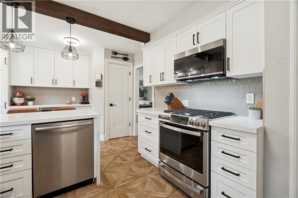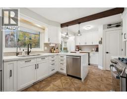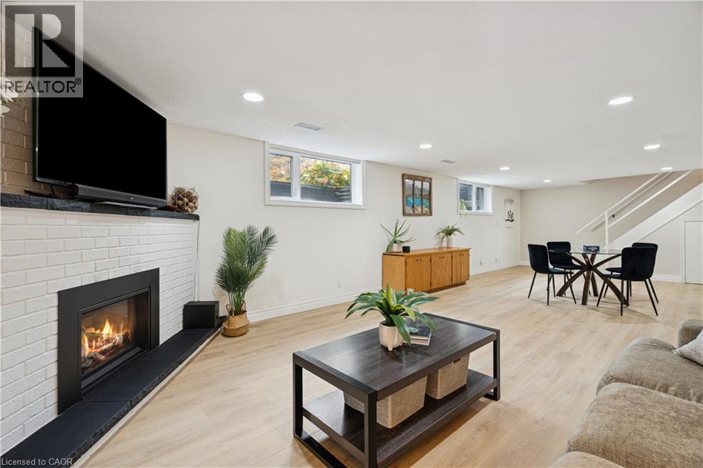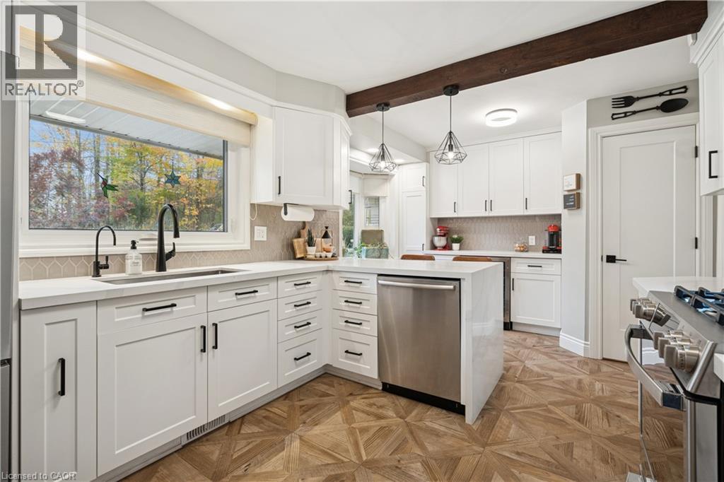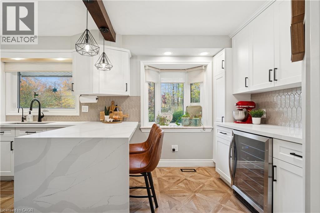 6 Beech St, Guelph — a beautifully updated bungalow offering 1,484 sq ft on the main level plus an equally generous finished basement, all set on a 98 × 150 ft treed lot. Step into the bright foyer where tiled floors, a double closet and elegant wainscoting set an inviting tone. The main floor features three bedrooms including a primary suite with W/I closet and a thoughtful 3 piece ensuite. The updated main bath features a large picture window. Flow from the dining room into the living room: both warmed by hardwood floors, crown moulding and bay windows, while the living room adds a striking new gas fireplace, pot lights and a walk out to the backyard. The heart of the home is the gourmet kitchen: quartz counters, a waterfall breakfast bar, a dedicated coffee bar with wine fridge, stainless steel appliances, pot lights, a W/I pantry and direct access from the attached two car garage. Downstairs, the finished basement mirrors the main level in size and versatility: a large recreation room with luxury vinyl floors, above grade windows and a second gas fireplace; 2 additional bedrooms (or an office and exercise room; full 3 piece bath; generous laundry room and cold storage room. Whether you’re working from home, keeping fit or simply relaxing, you’ve got the flexibility. Outside, the professionally landscaped front and rear yards deliver exceptional lifestyle value. The expansive driveway of interlocking brick accommodates six cars. The backyard is a private oasis: goldfish pond, fire pit, irrigation system and a heated shed/office with its own 30 amp service—ideal for an at home studio, play space or quiet retreat. Modern systems round out the appeal: forced air gas heating, central air conditioning, and a standby Generac generator ensure year round peace of mind. Located in a mature, family friendly neighborhood with generous lots and mature trees, you’ll enjoy a balanced lifestyle: serene and private, yet close to everyday conveniences and amenities. (id:46441)