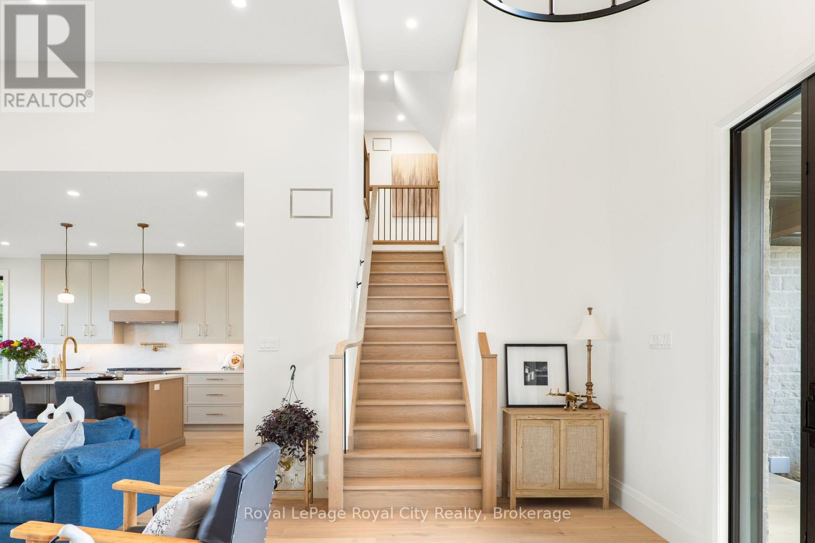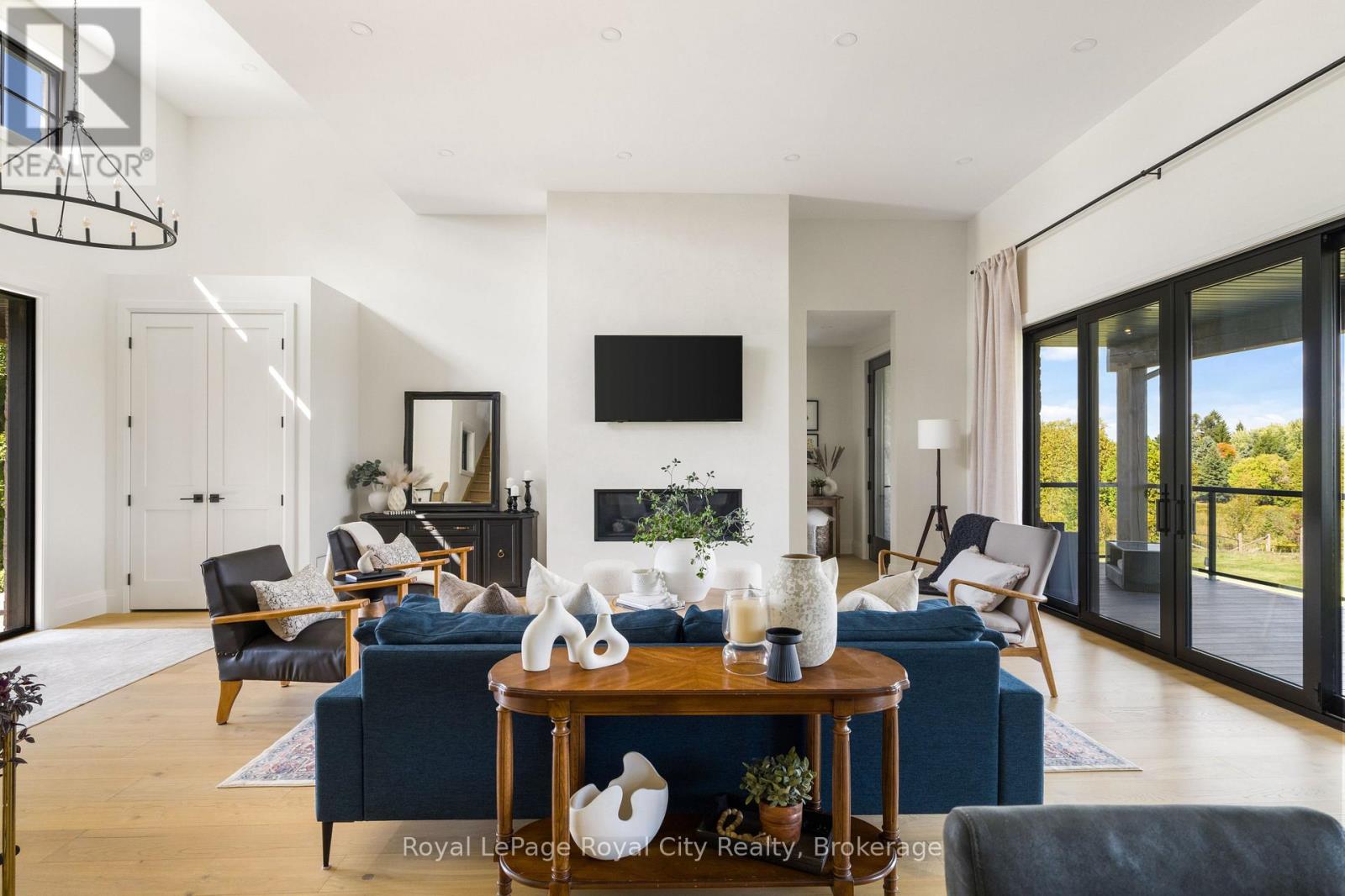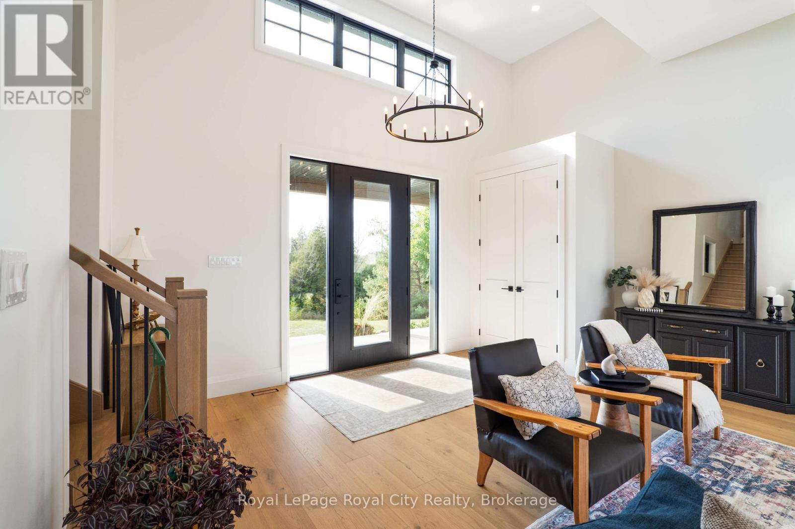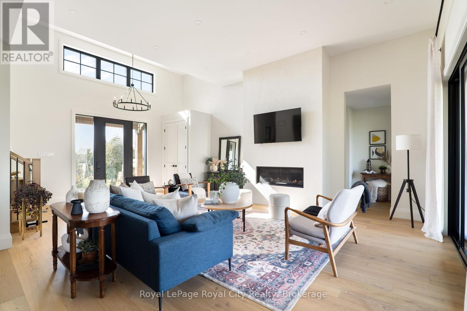 A hidden gem in Wellington County, just moments from Guelph, Elora, and Fergus. Here, you'll find yourself surrounded by the beauty of the rural landscape. This custom-crafted estate is a true statement; thoughtfully designed and intentionally created with entertaining in mind. At the heart of the home, the kitchen stuns with warm wood accents, gold fixtures, and a subway tile backsplash. A secondary butlers kitchen enhances the culinary experience, bringing both versatility and sophistication to every gathering. The living room is curated for elegant living, showcasing oversized glass sliding doors framed in sharp black trim and a striking floor-to-ceiling fireplace. Additional highlights include a luxurious main-floor primary wing with spa-inspired 5-pc ensuite and walk-in closet. Upstairs, find three spacious bedrooms, one of which offers a stunning 3-pc ensuite with beautiful gold finishes and earthy tones. The focal point of this storey is the sun engulfed bonus room perfect for a secondary living area or multi-purpose space. Just a stones throw away, step down to the Shand Dam Trail, launch your canoe or kayak into the Grand River for remarkable fishing and paddling activities. Nearly as central to the Shand Trail is the Pilkinton Overlook or the Wilson Flats, where one can go to embrace the peaceful sounds of nature alongside the solitude of the river. This home is a true sanctuary. Embrace the quiet life in the heart of Inverhaugh. (id:46441)