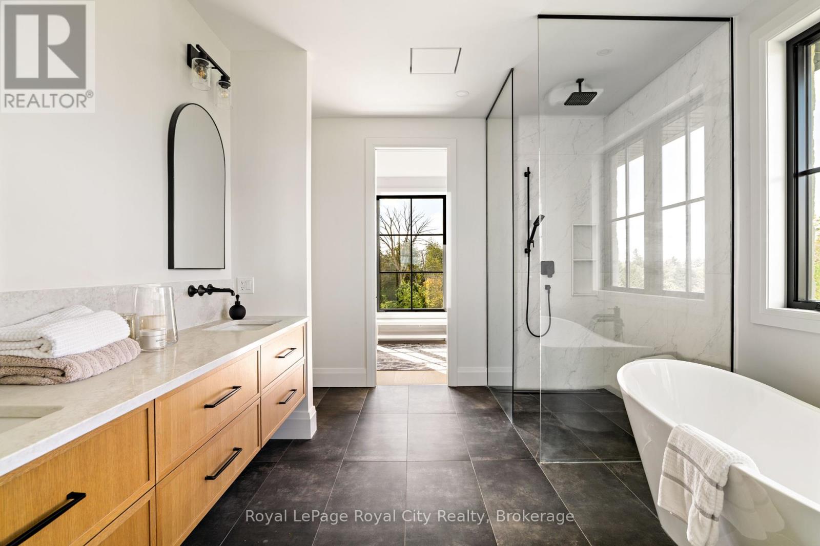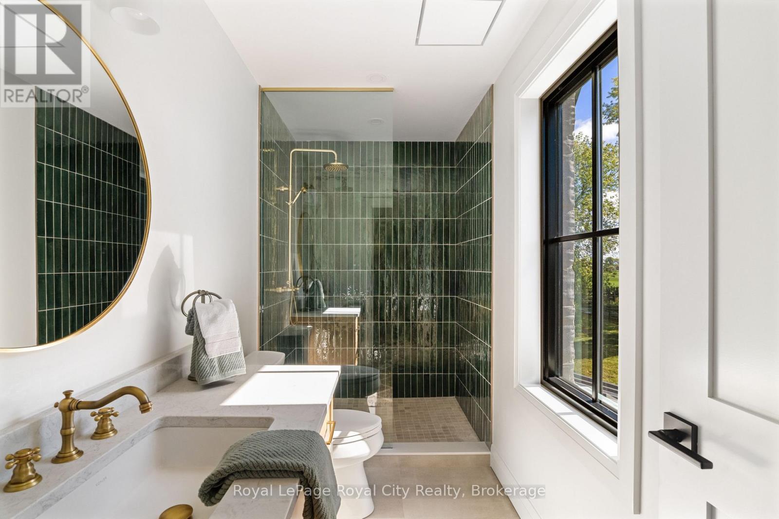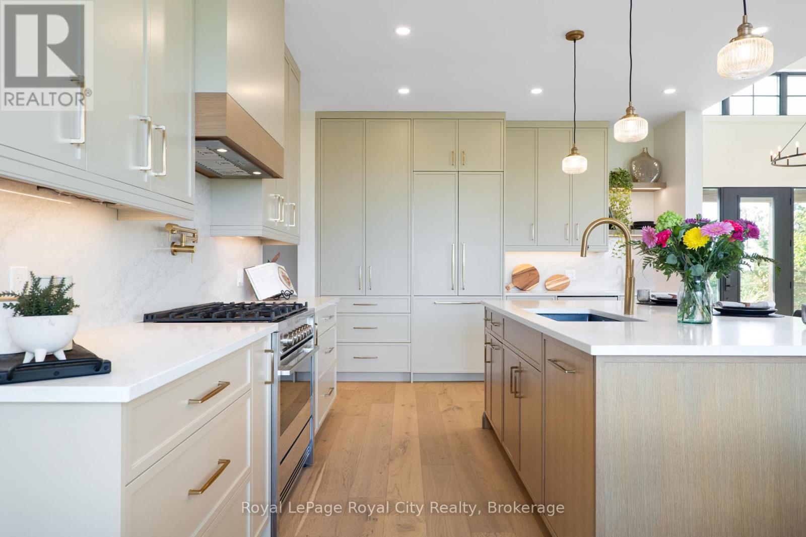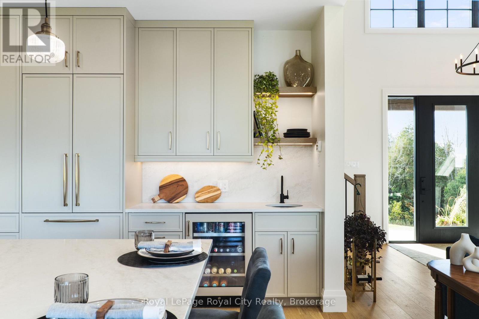 A hidden gem in Wellington County, just moments from Guelph, Elora, and Fergus. Here, you'll find yourself surrounded by the beauty of the rural landscape. This custom-crafted estate is a true statement; thoughtfully designed and intentionally created with entertaining in mind. At the heart of the home, the kitchen stuns with warm wood accents, gold fixtures, and a subway tile backsplash. A secondary butlers kitchen enhances the culinary experience, bringing both versatility and sophistication to every gathering. The living room is curated for elegant living, showcasing oversized glass sliding doors framed in sharp black trim and a striking floor-to-ceiling fireplace. Additional highlights include a luxurious main-floor primary wing with spa-inspired 5-pc ensuite and walk-in closet. Upstairs, find three spacious bedrooms, one of which offers a stunning 3-pc ensuite with beautiful gold finishes and earthy tones. The focal point of this storey is the sun engulfed bonus room perfect for a secondary living area or multi-purpose space. Just a stones throw away, step down to the Shand Dam Trail, launch your canoe or kayak into the Grand River for remarkable fishing and paddling activities. Nearly as central to the Shand Trail is the Pilkinton Overlook or the Wilson Flats, where one can go to embrace the peaceful sounds of nature alongside the solitude of the river. This home is a true sanctuary. Embrace the quiet life in the heart of Inverhaugh. (id:46441)