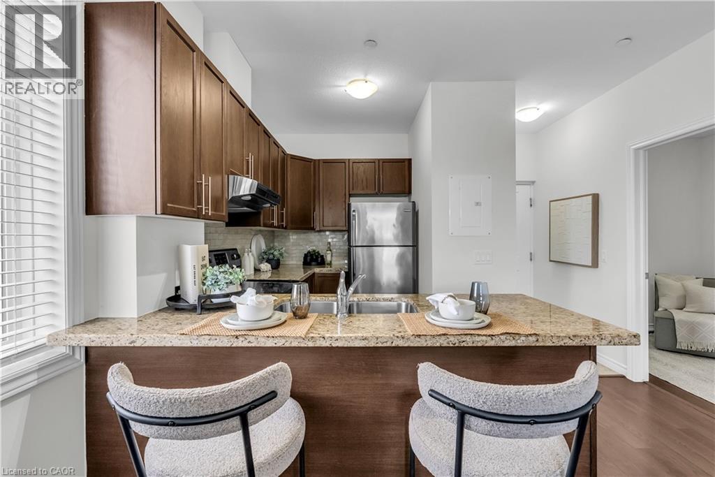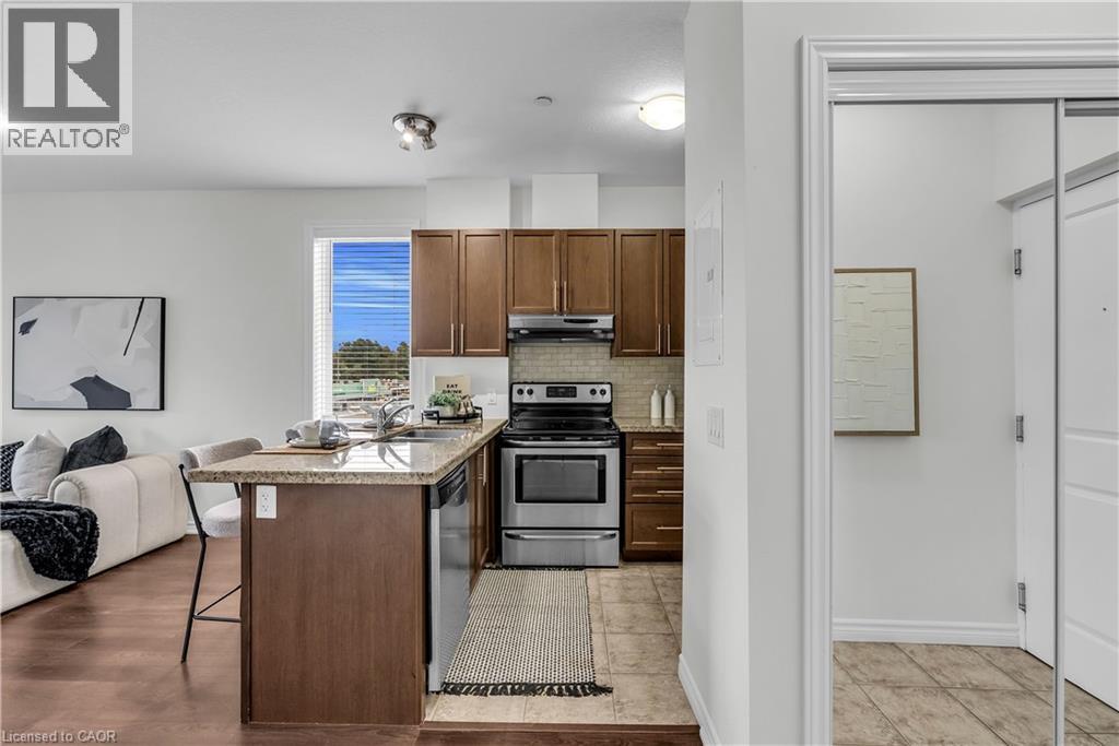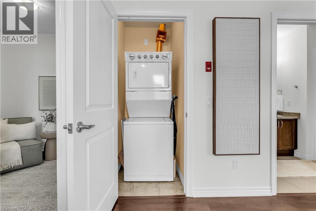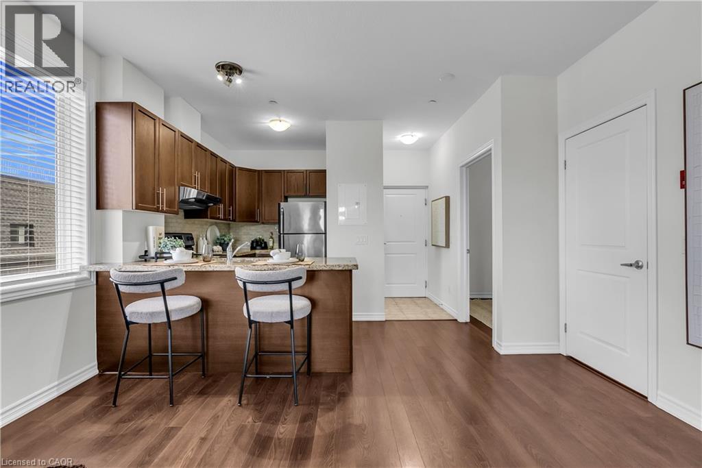 Attn: First time buyers or downsizers. This is the unit that you have been waiting for, Shows 10+++ Immaculate.  Location Location, quality built in the heart of Ancaster, rarely offered in this building spacious 3rd floor (721 sq ft) 2 bedroom, END UNIT with extra windows provides for bright natural light throughout. Immaculate freshly painted, featuring high end laminate flooring, granite countertops, 9 ft. ceilings and large private balcony, one underground parking spot, ensuite privilege, in suite laundry.  High walk score. Steps to Fortino's, Food Basics, TD Bank, Shoppers, walking trails and more. Easy access to 403, This unit is PRICED TO SELL and will not last. Call now your for your private showing! (id:46441)