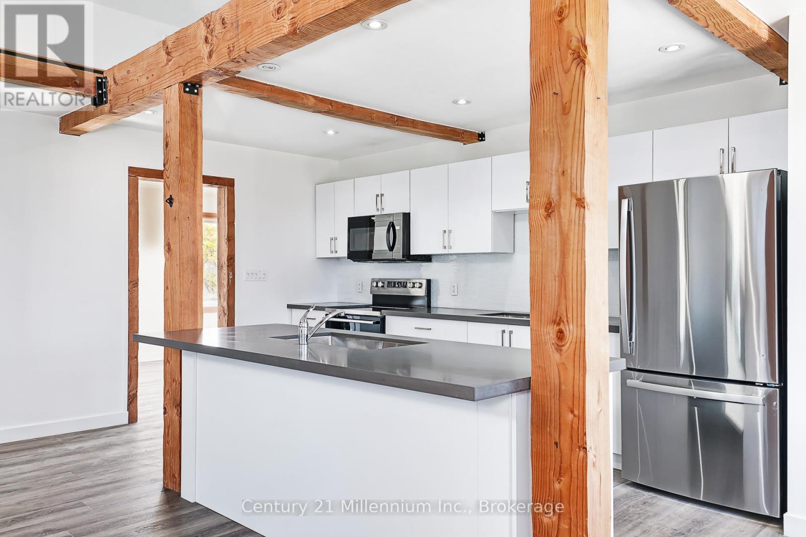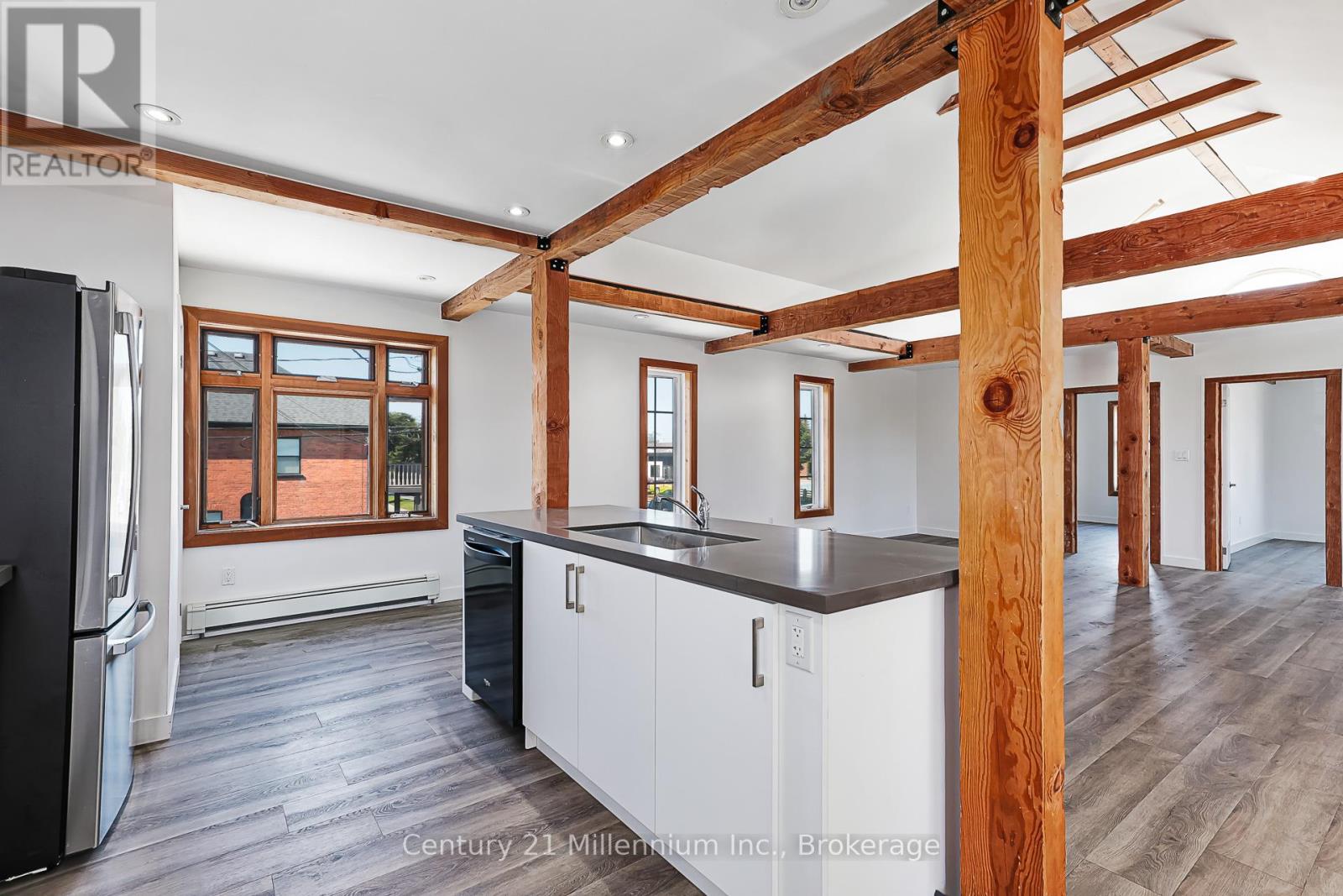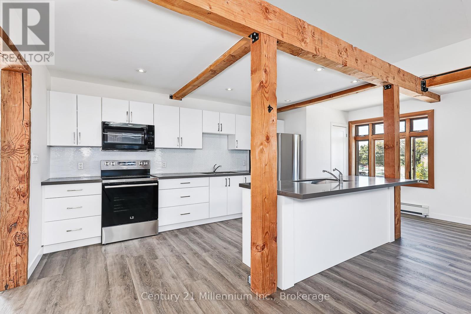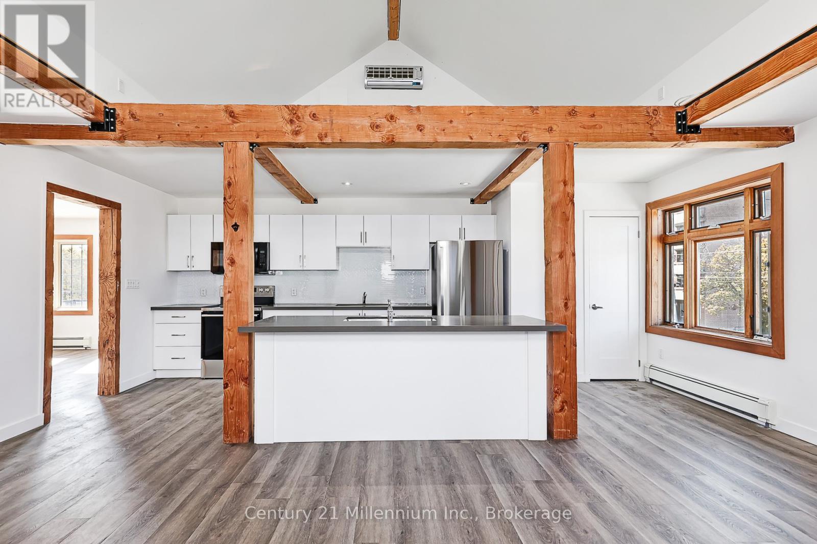 Bright & Beautiful 3-Bedroom Collingwood Rental. Welcome to this stunning 3-bedroom, 1.5-bathroom rental, perfectly situated in the heart of Collingwood. This apartment is a true gem, featuring a bright, open-concept layout highlighted by gorgeous exposed wood beams that add warmth and character throughout. The spacious kitchen is a chef's dream, boasting a large island, brand-new stainless steel fridge and stove, and ample counter space for all your cooking and entertaining needs. Step outside onto your large private terrace for al fresco dining or morning coffee, and enjoy a second private balcony for even more outdoor space .This prime location puts you just steps away from all that Collingwood has to offer. Enjoy a short stroll to local shops, fantastic restaurants, scenic trails, and the beautiful shores of Georgian Bay. With year-round activities like skiing, pickleball, hiking, and biking all at your doorstep, this unit is the perfect base for your next adventure. 2 parking spots included. Utilities and internet extra. (id:46441)